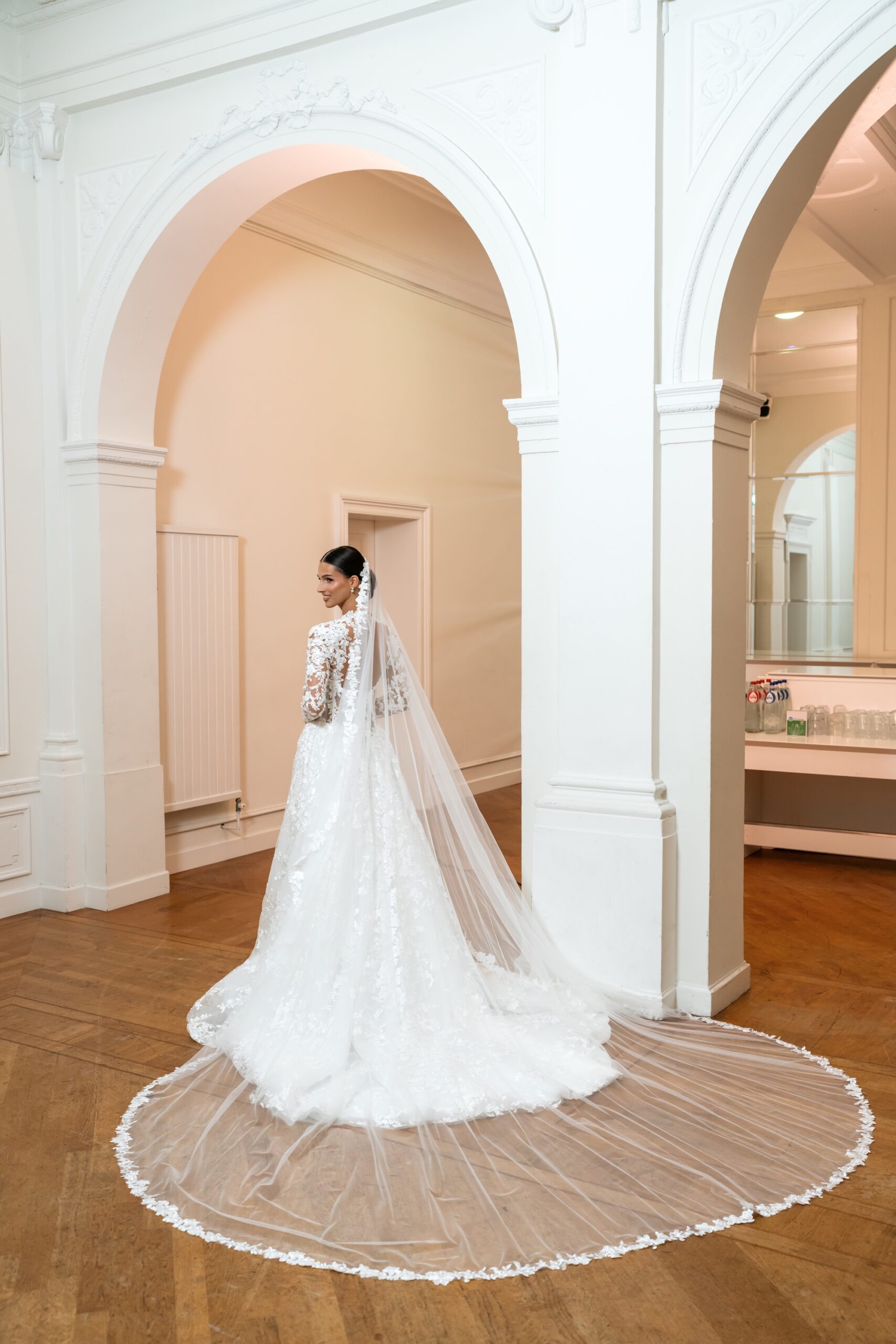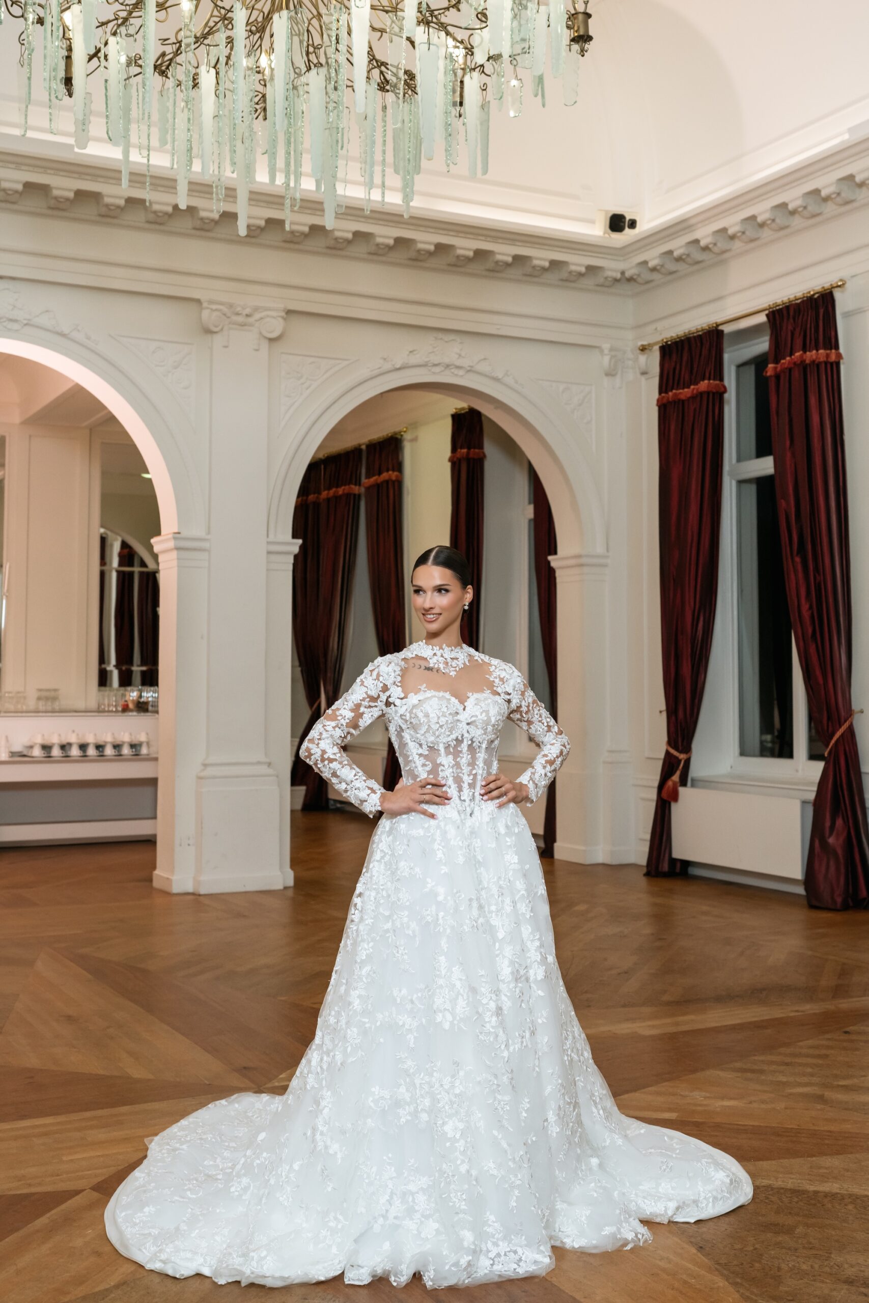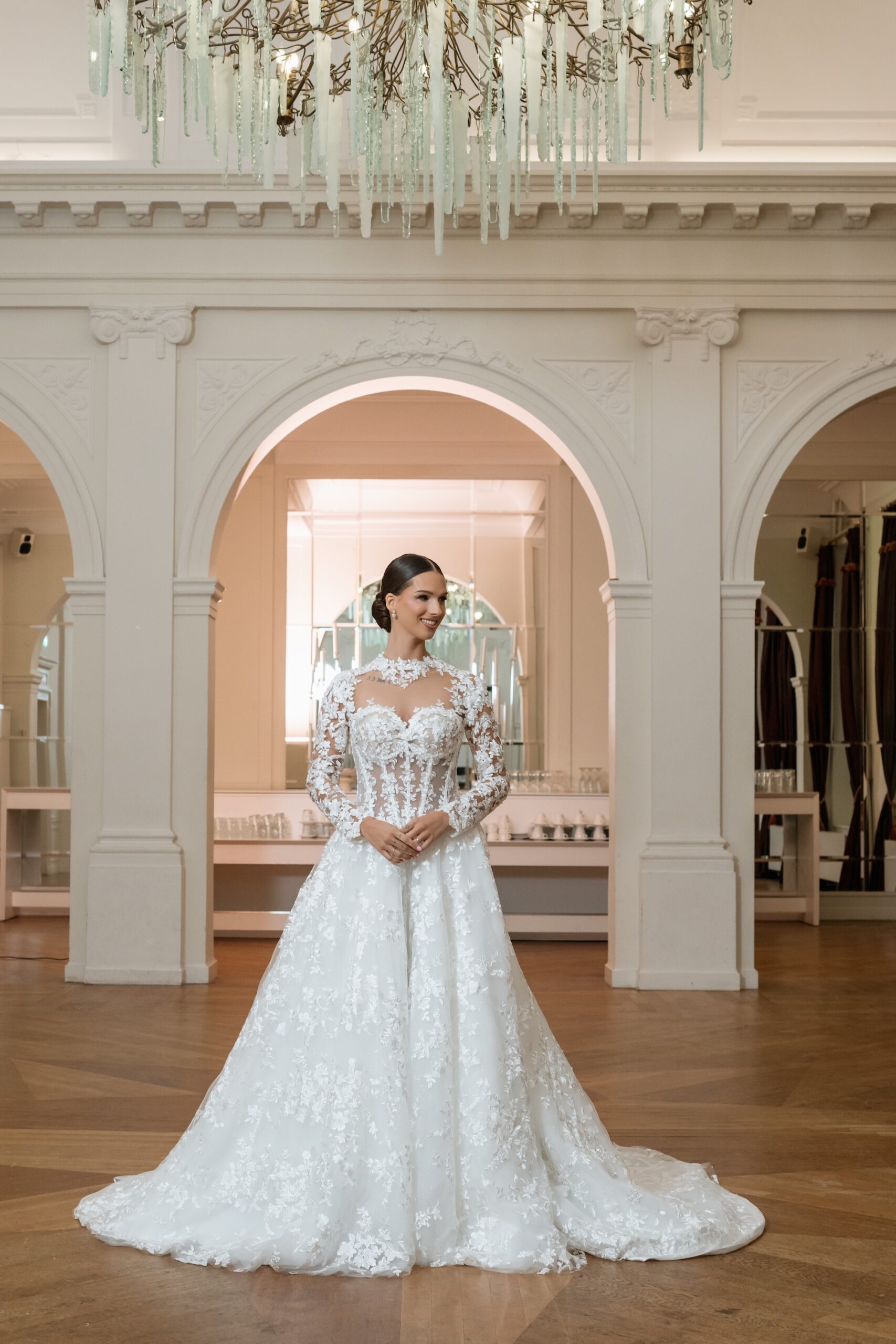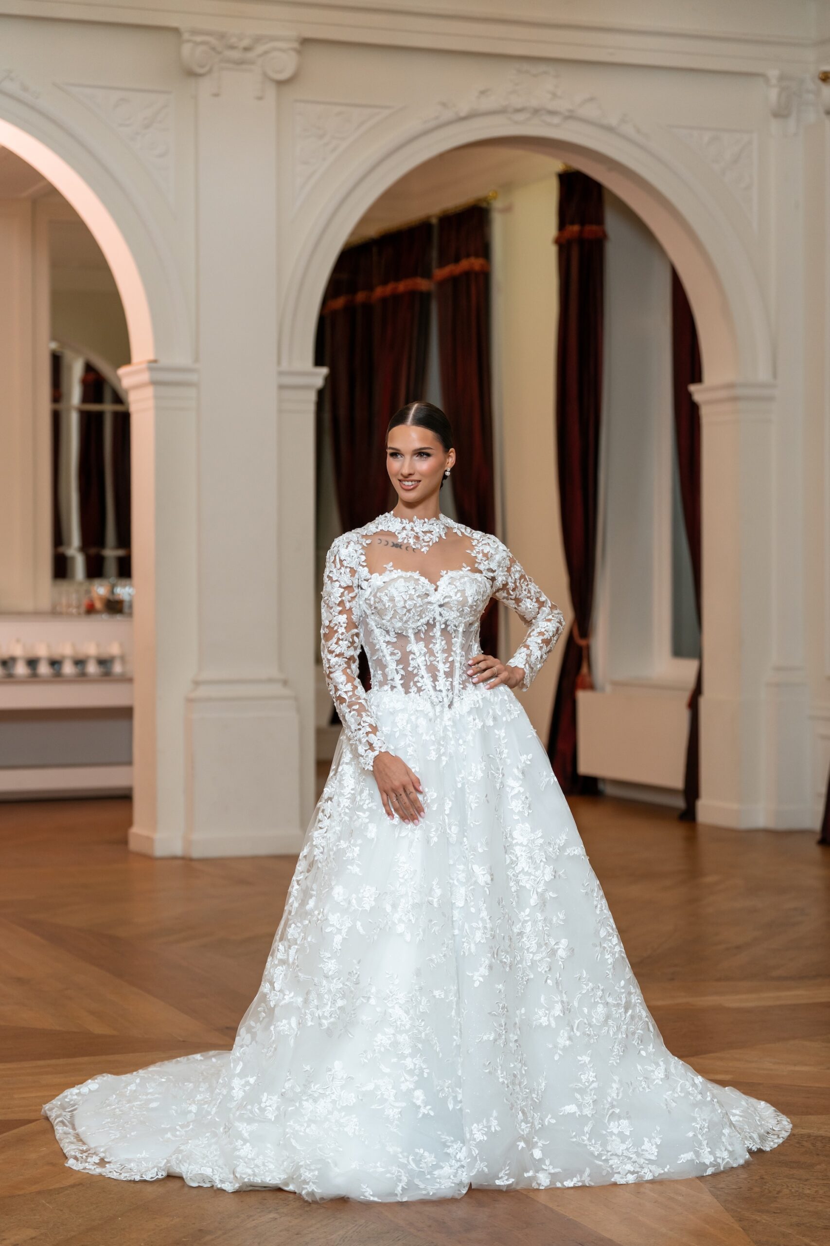 Chique A-lijn trouwjurk met illusie hals en lange kanten mouwen. De rok valt zacht en de sleep geeft een koninklijke look. Ideaal voor bruiden die houden van tijdloze elegantie.