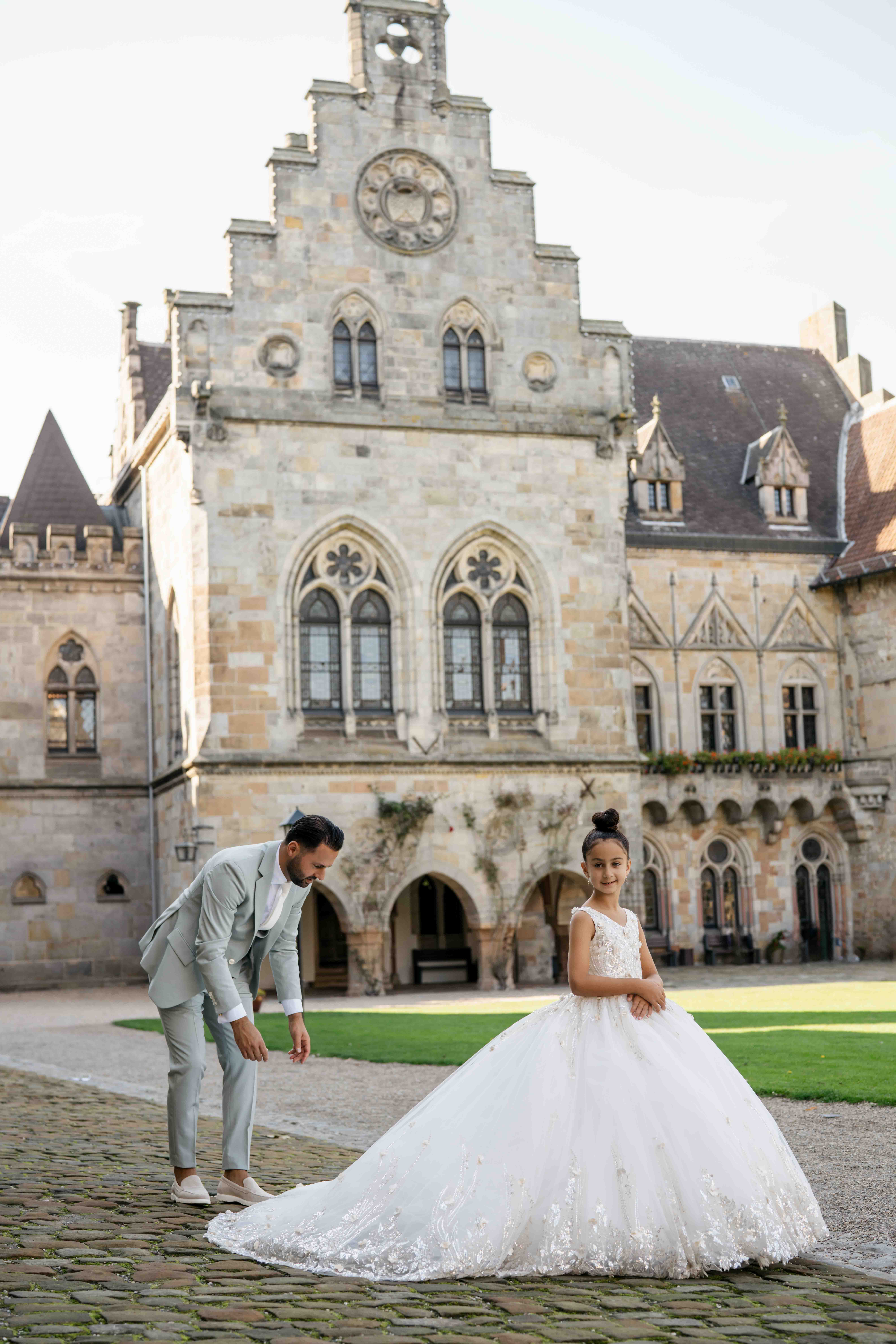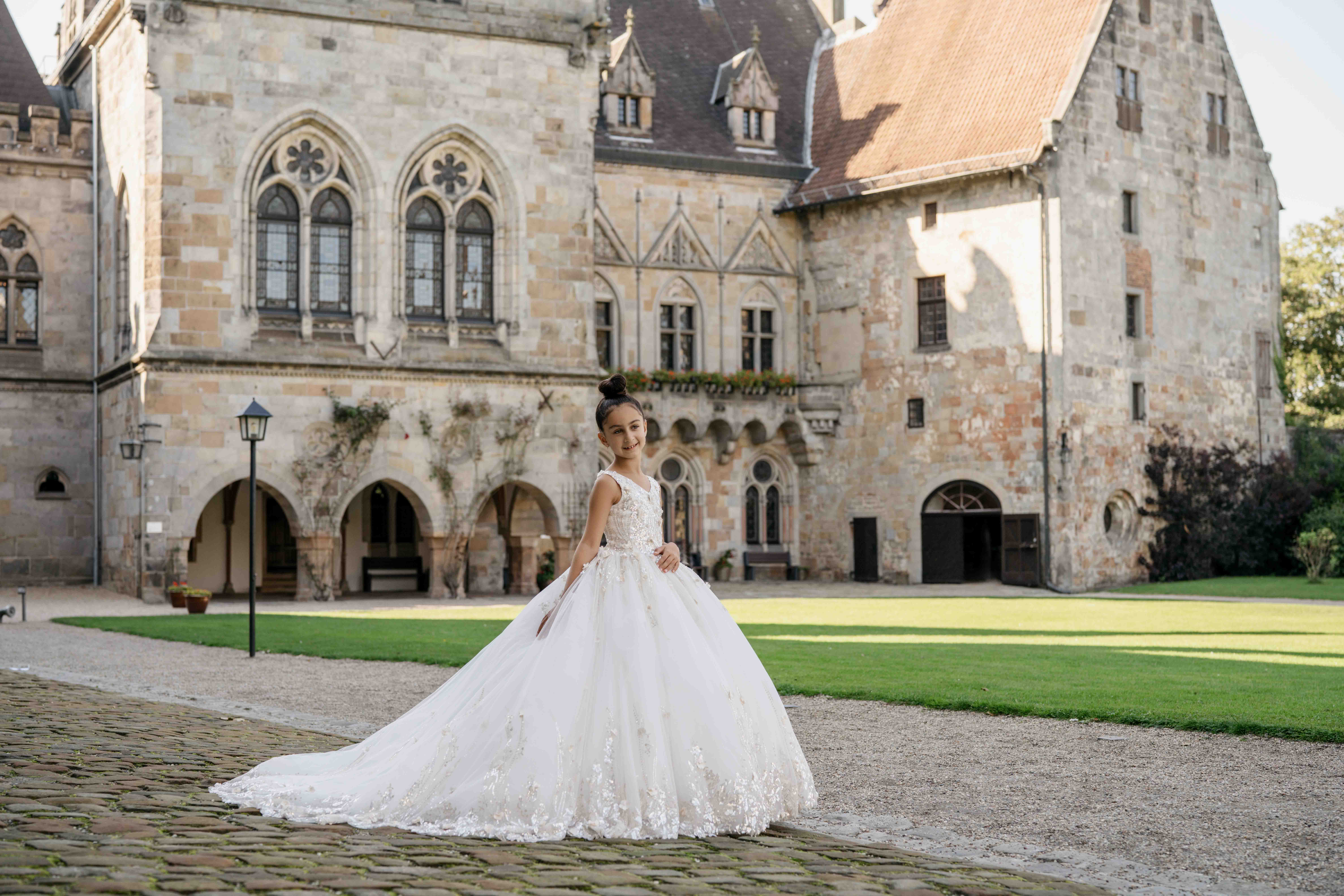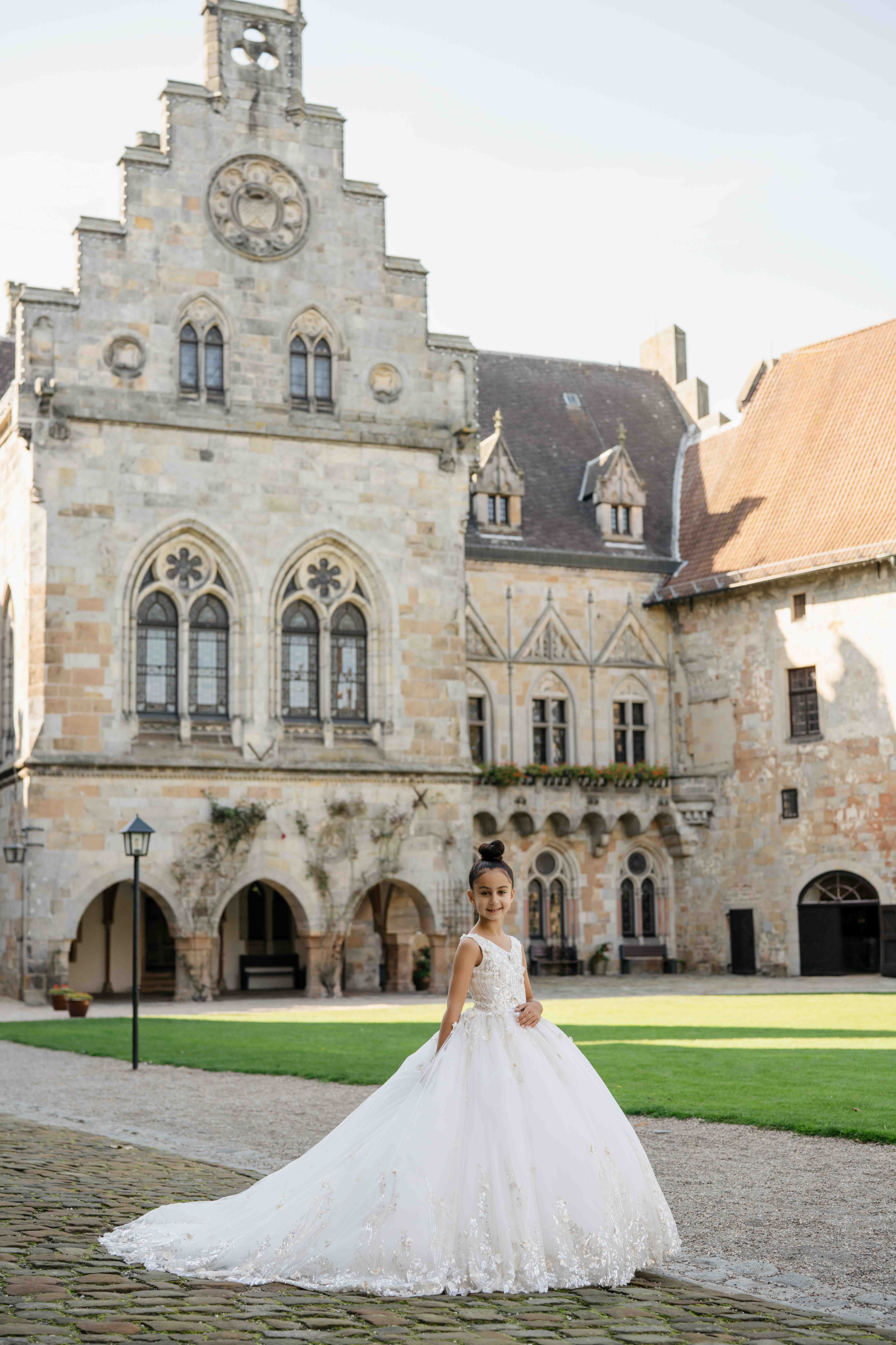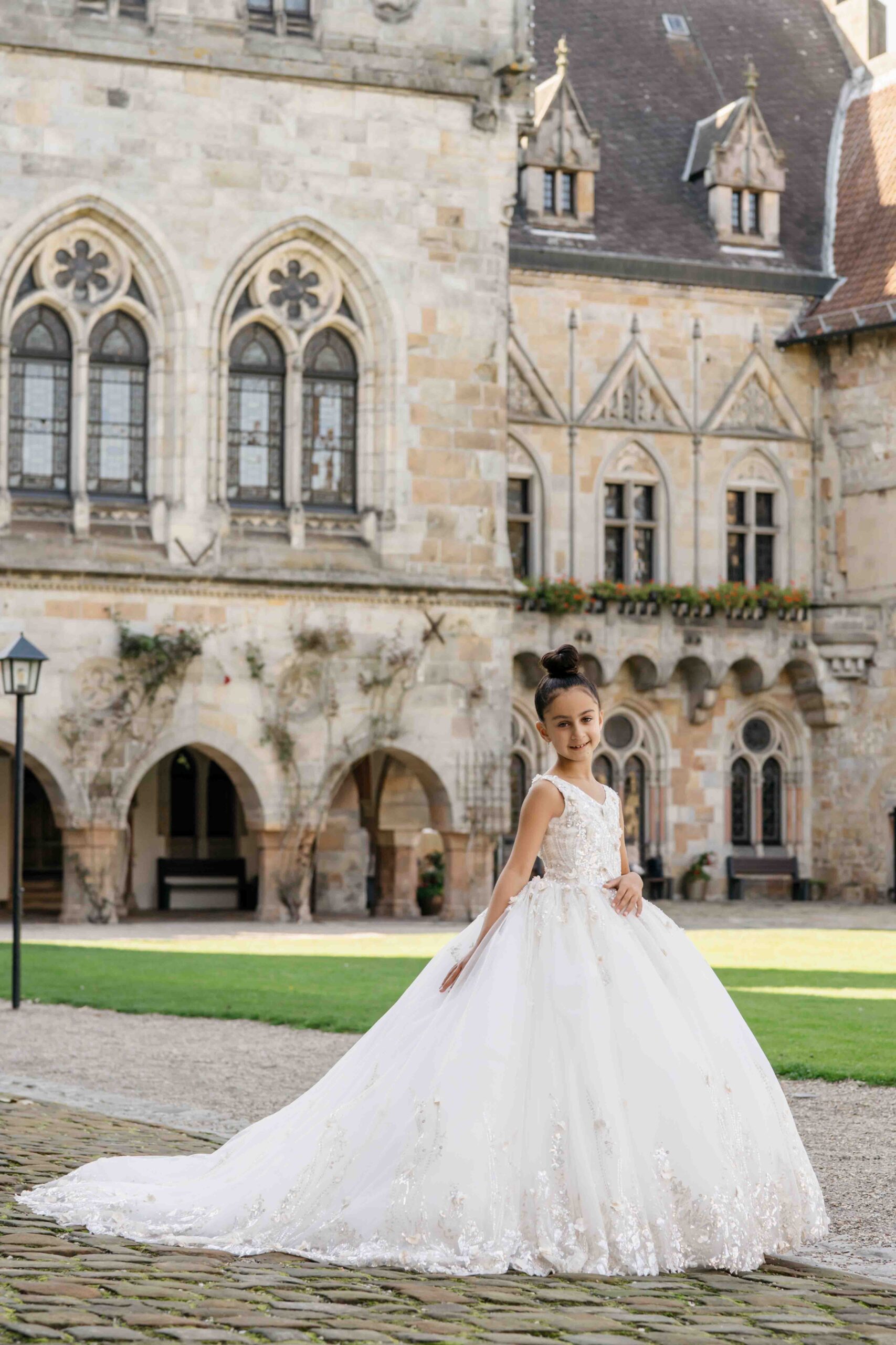 Communiejurk Celina is een prachtige prinses jurk met een V neklijn top, silverbewerkte applicaties met mix van 3D bloementjes. De jurk heeft in de rok ook een mooie glitter tulle en een perfecte sleeplengte! Al onze communiejurken worden naar wens en speciaal op maat gemaakt. Kom deze prachtige communiejurk passen in de winkel!