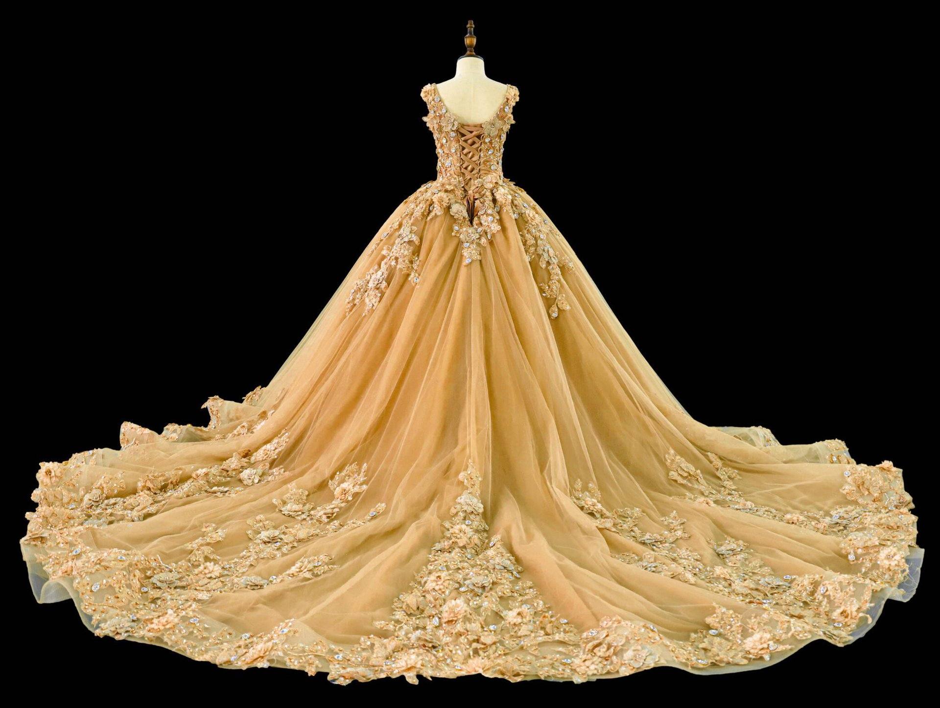 Communiejurk Goud is een prachtige gouden prinses jurk met een corset body / V-hals neklijn en een mooi rijk bewerkt rok. Wil je deze communiejurk met een extra lange sleep of volledig bewerkt rok? Dat is mogelijk! Wij maken alle communiejurken naar wens en op maat!
