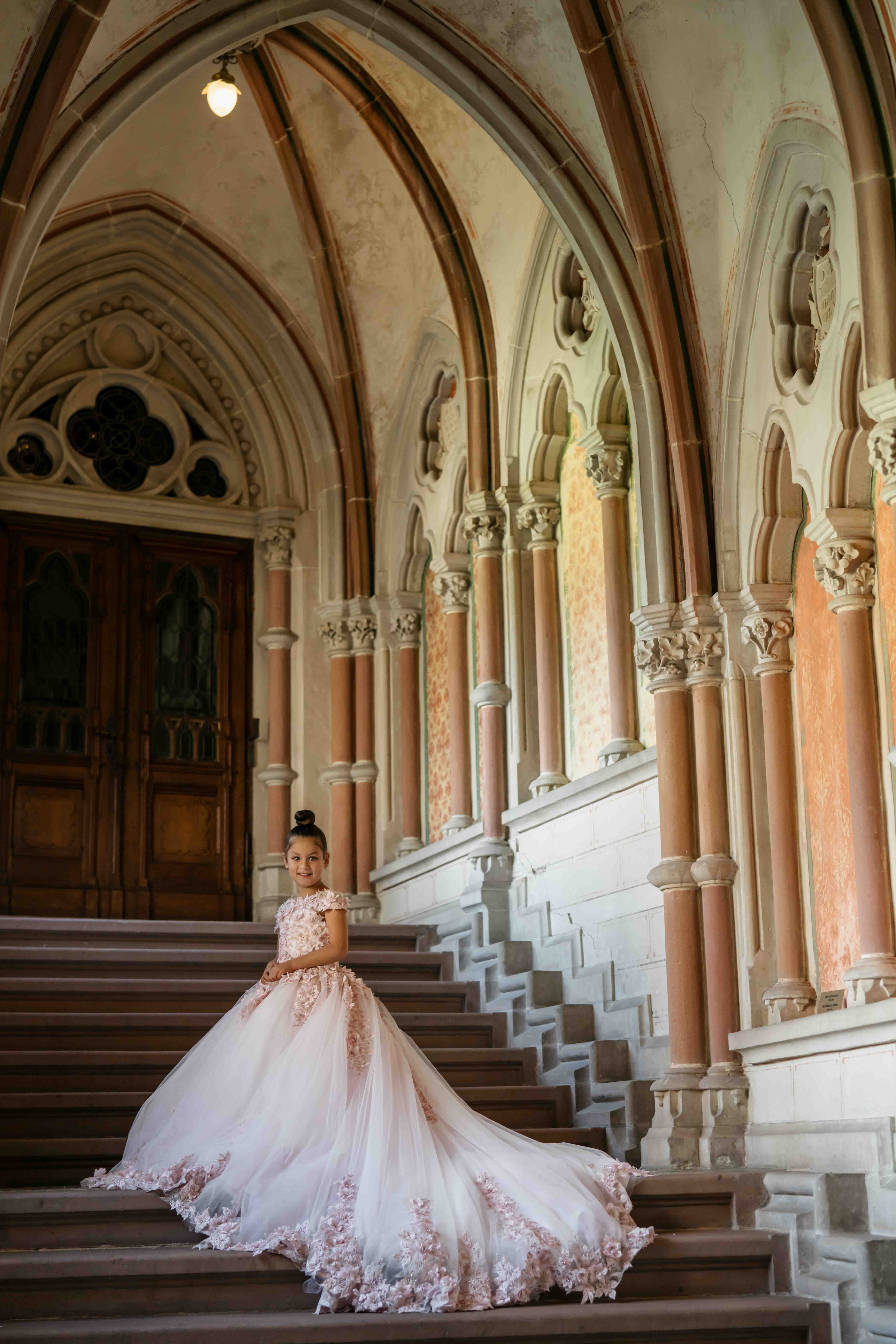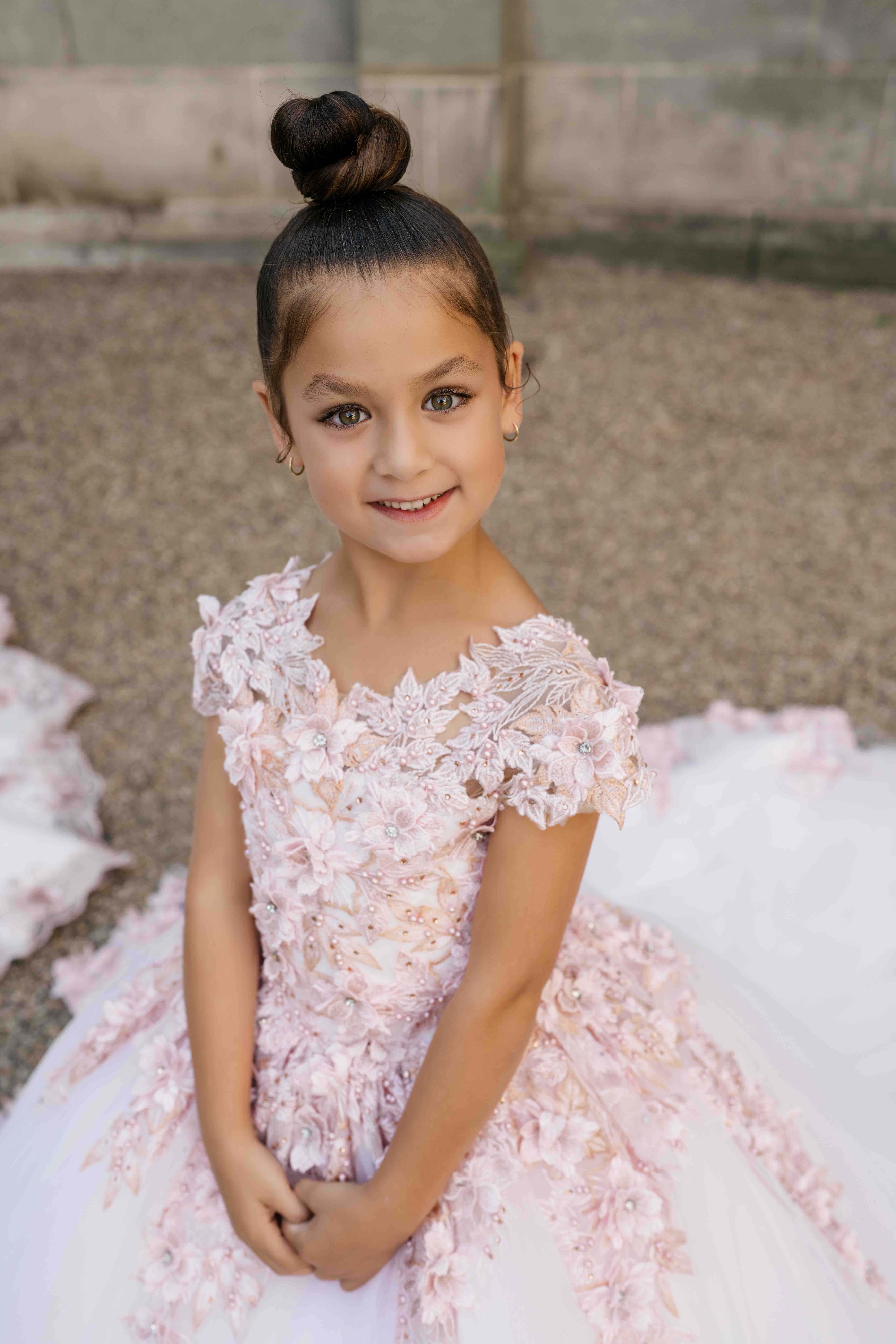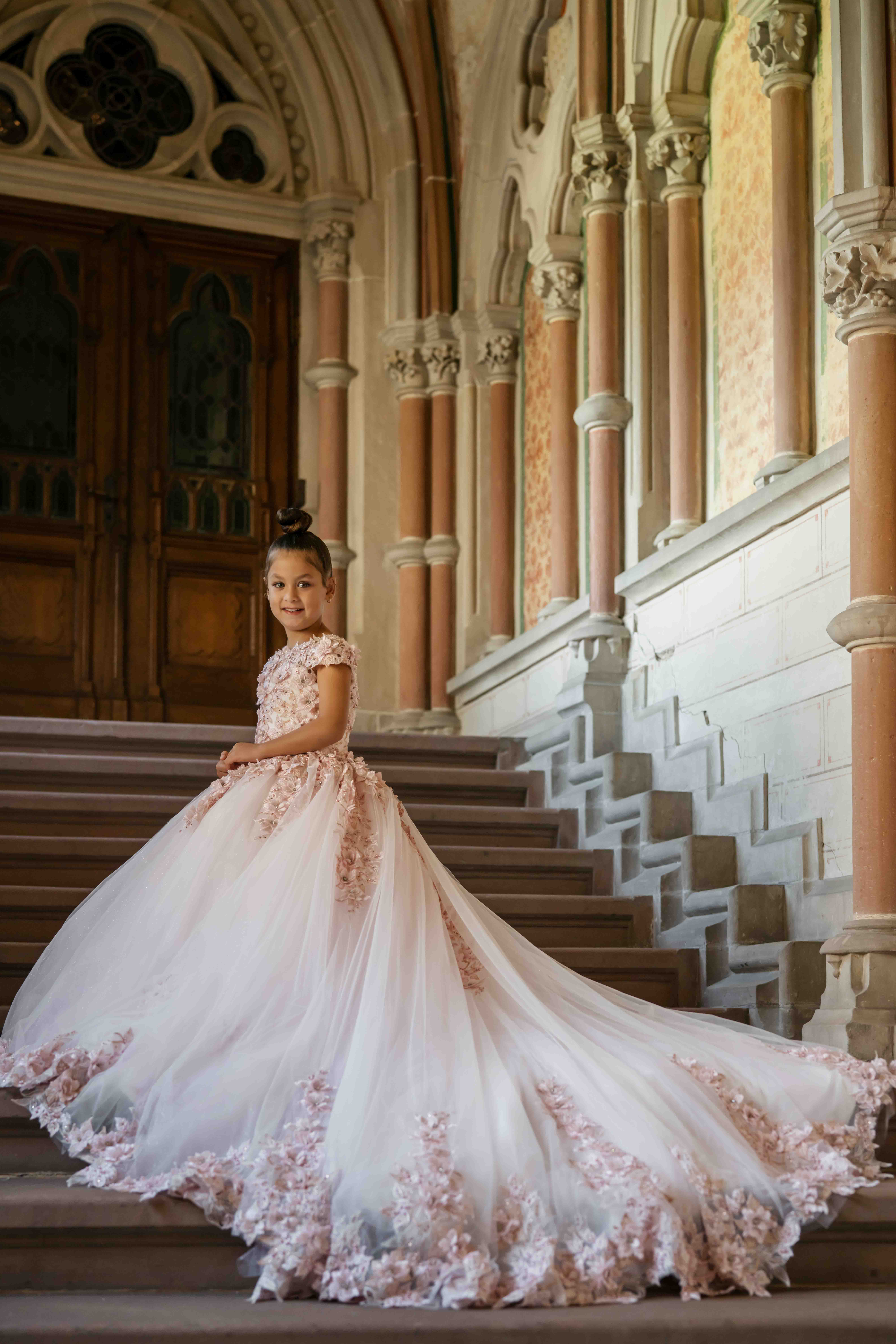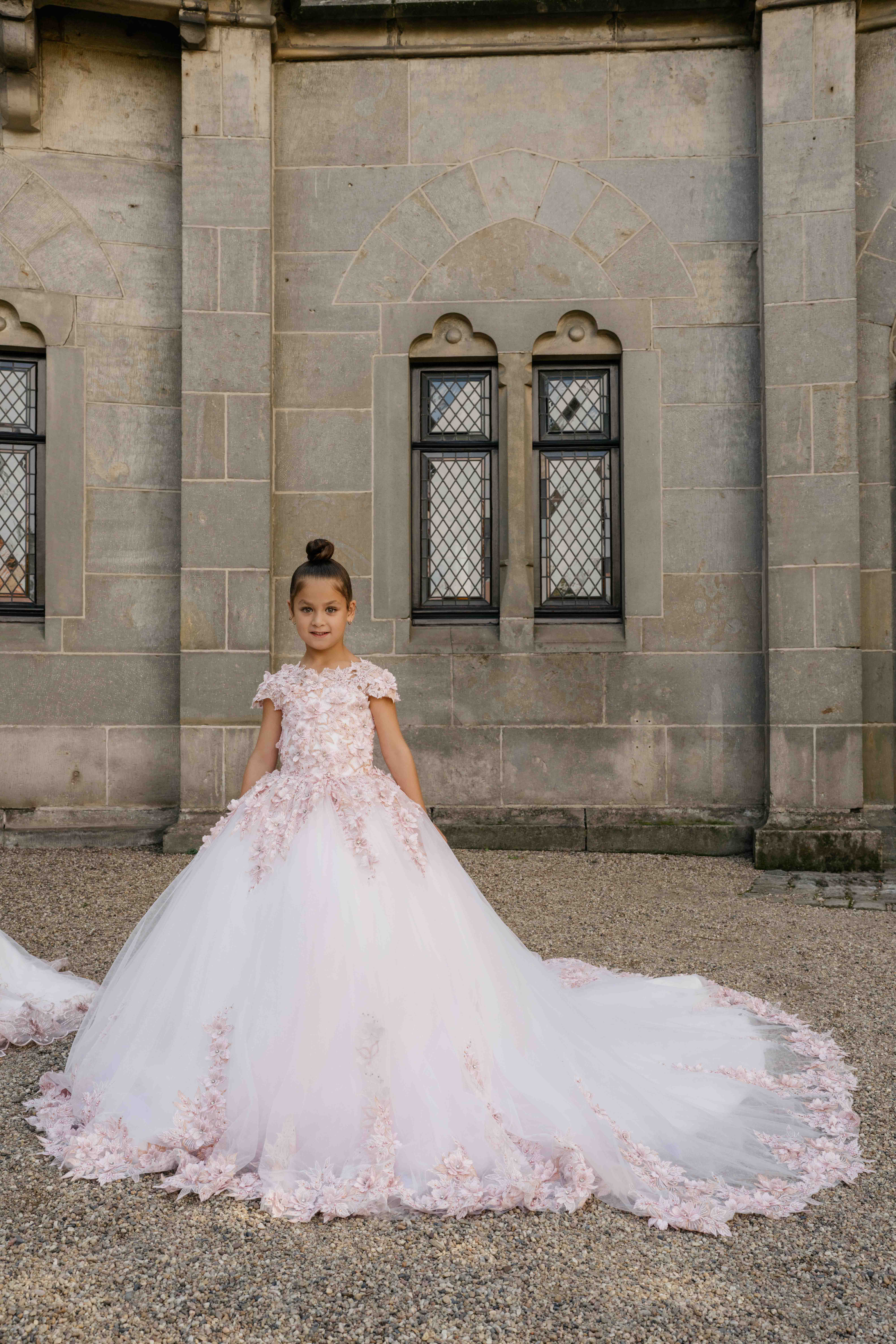 Communiejurk Pink Flower is een prachtig jurk met pink rose 3D bloemen – kant applicaties. De rok bestaat uit meerdere lagen tule, glitters en een tussenlaag van rose tule!