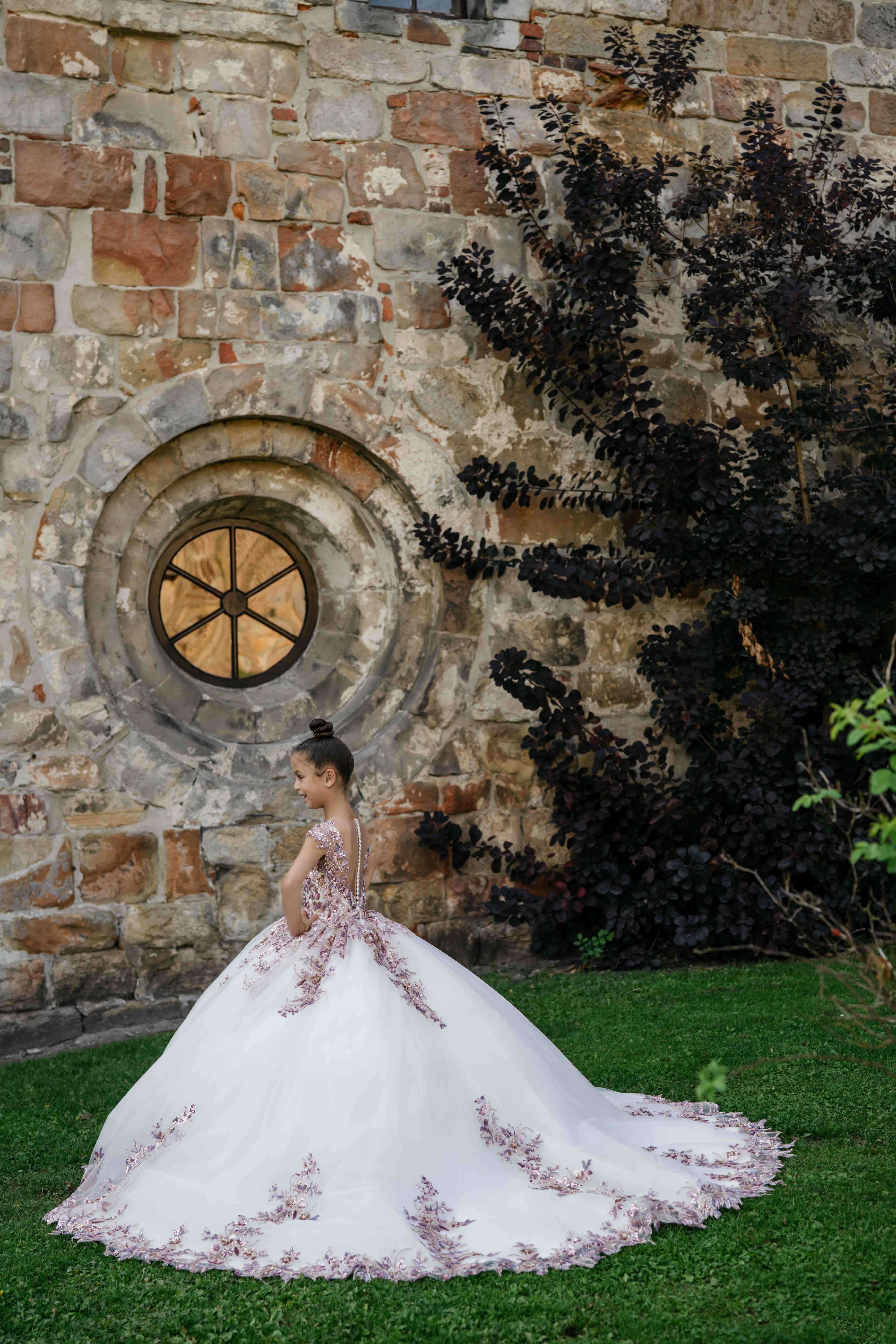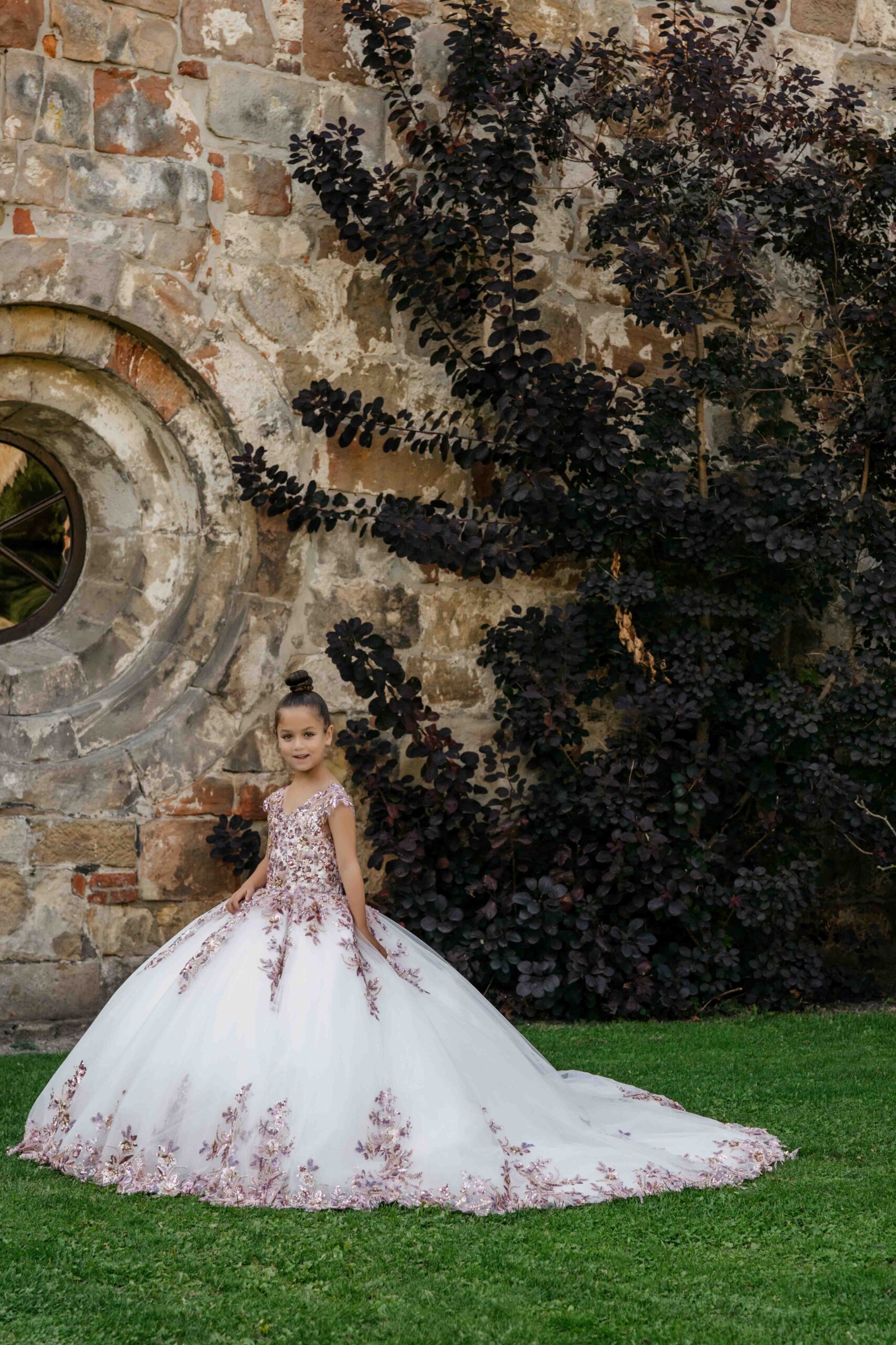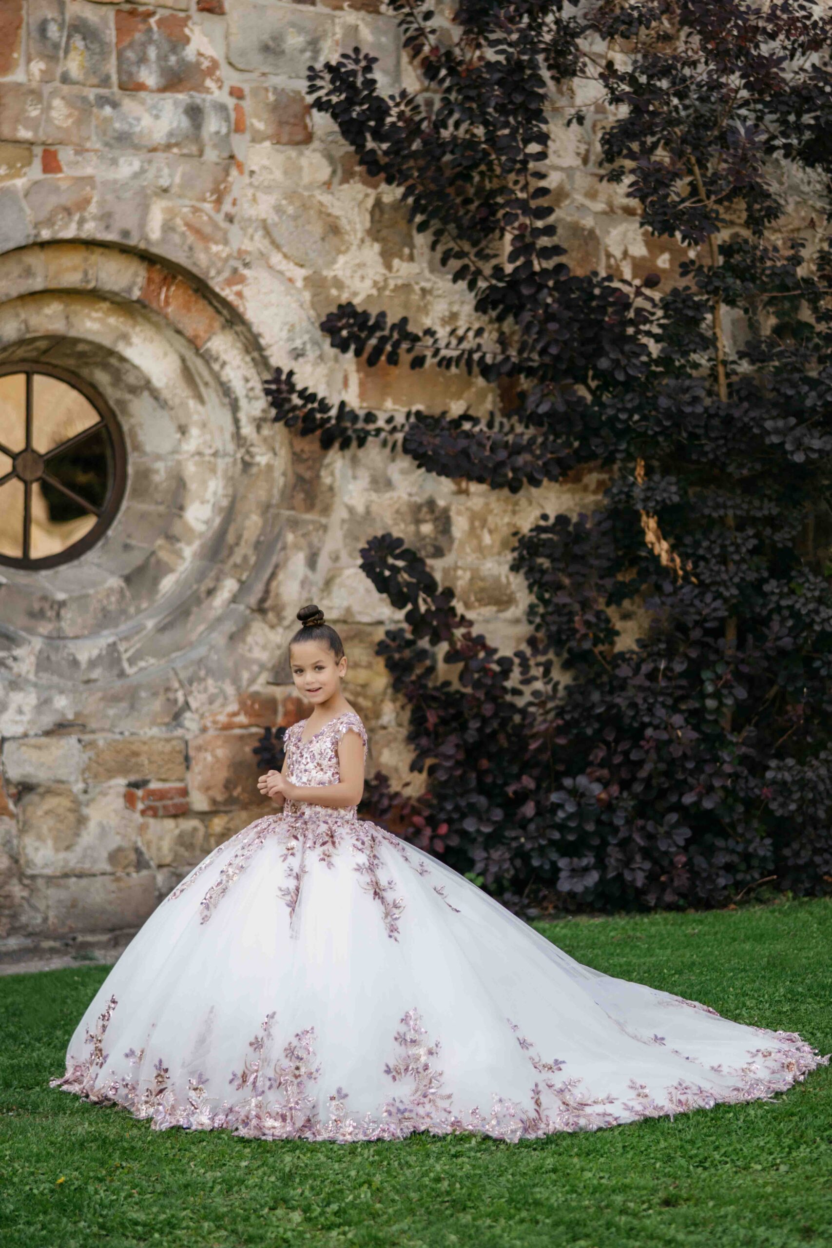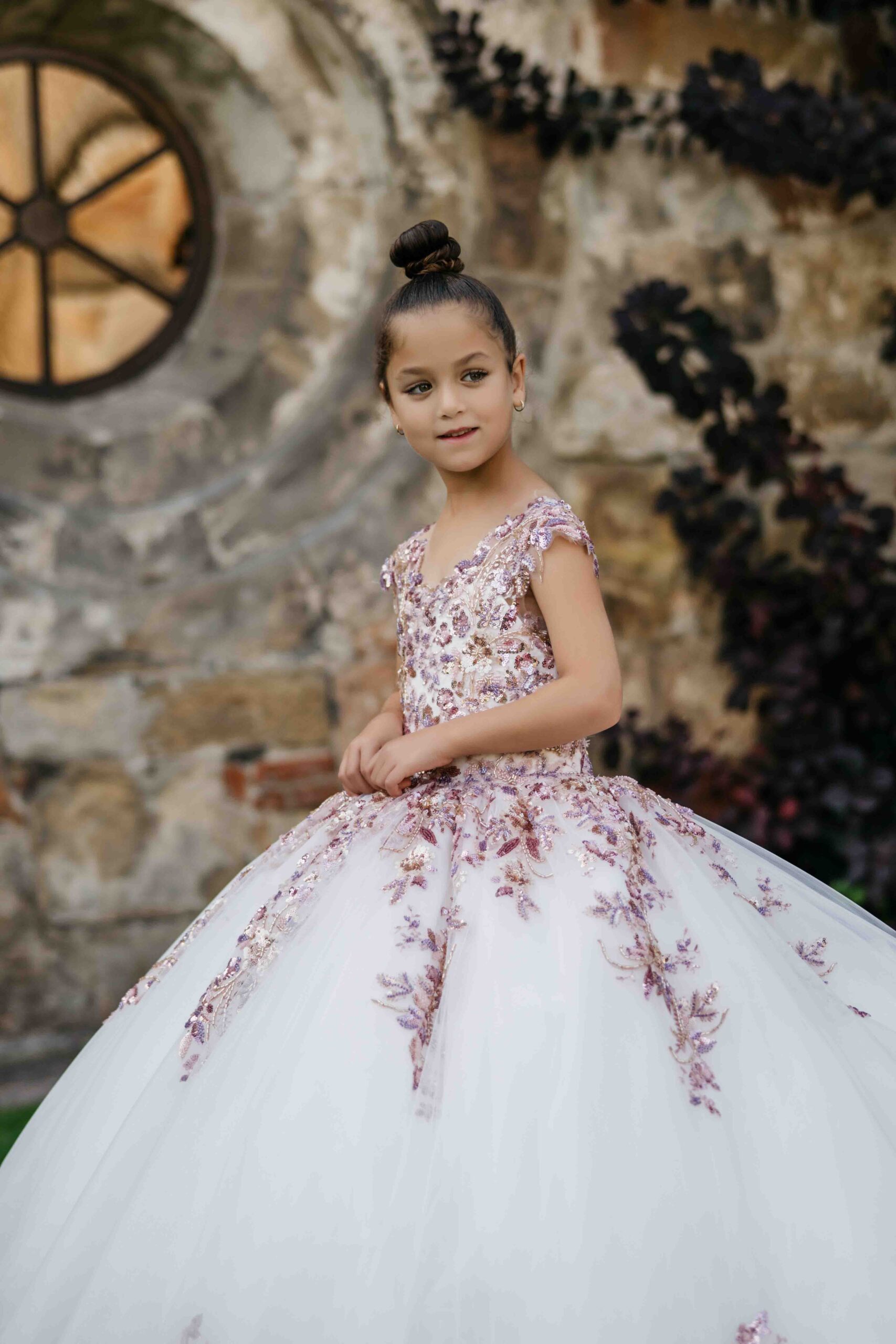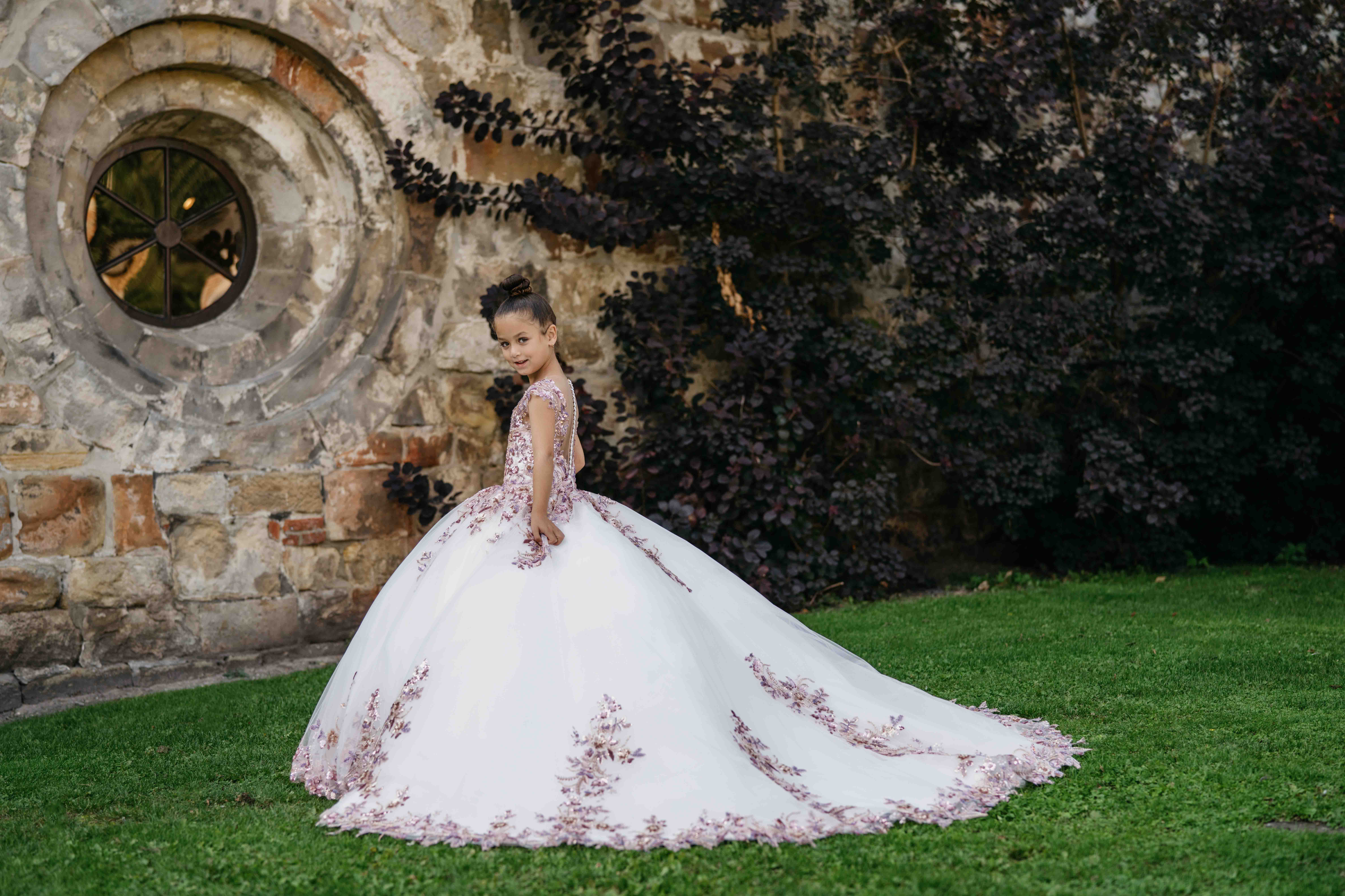 Communiejurk Stella is een prachtige prinses jurk met mooie paarse – goud – silver combi van applicaties. De jurk heeft in de rok ook een mooie glitter tulle en een lange sleep! Al onze communiejurken worden naar wens en speciaal op maat gemaakt. Kom deze prachtige communiejurk passen in de winkel!