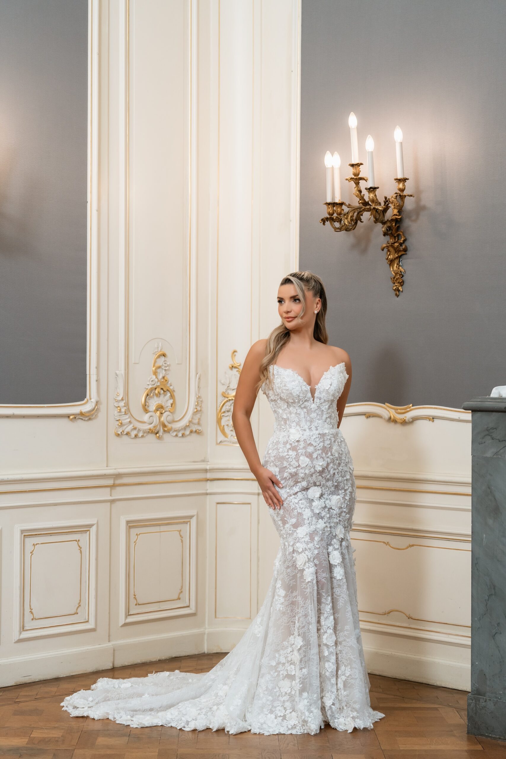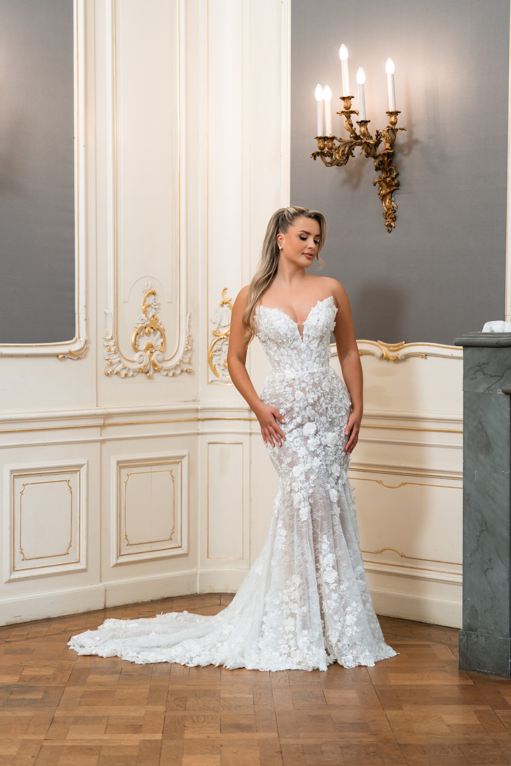 Fit & flare trouwjurk met 3D bloemen, subtiele glans en een vrouwelijke pasvorm. De jurk geeft een luxe en romantische uitstraling en laat je figuur mooi uitkomen.