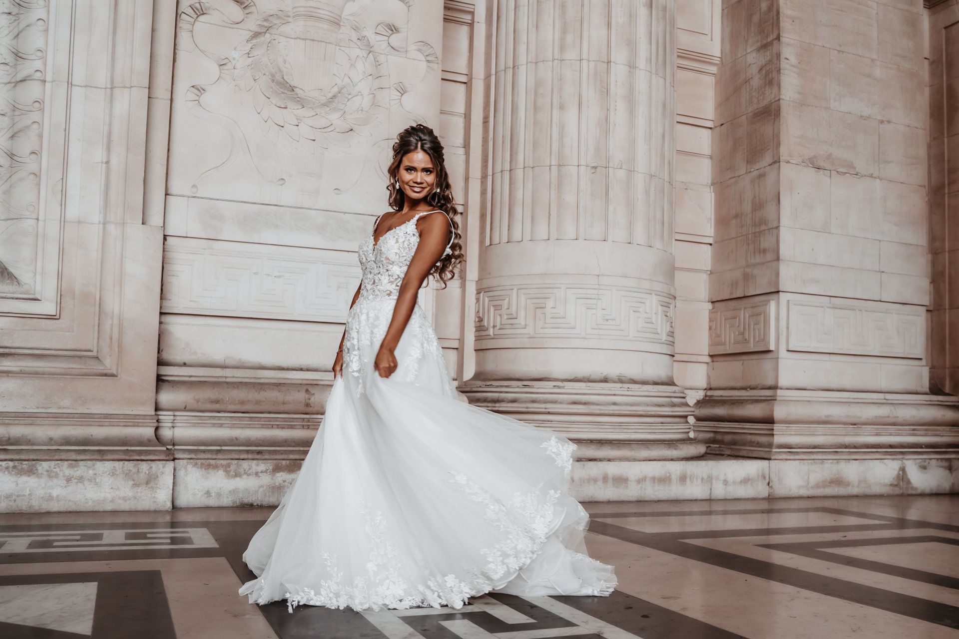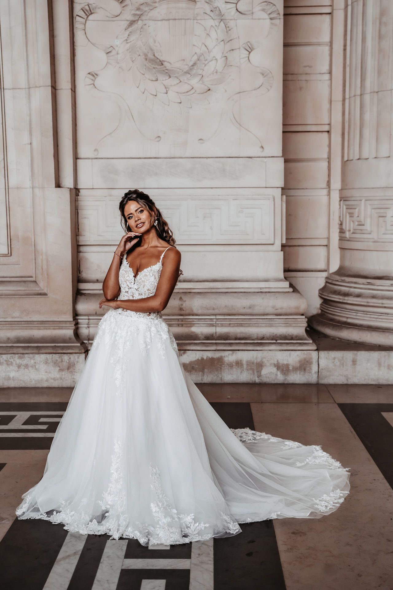 Trouwjurk Lucia is een nieuwe design uit onze collectie A-lijn. De top is transparant gemaakt met mooie bewerkte kant applicatie en de rok is gemaakt van dunne tulle stof. Hou je van een zwierig A-lijn rok met een touch of glitter & glamour? Dan is dit je droomjurk!