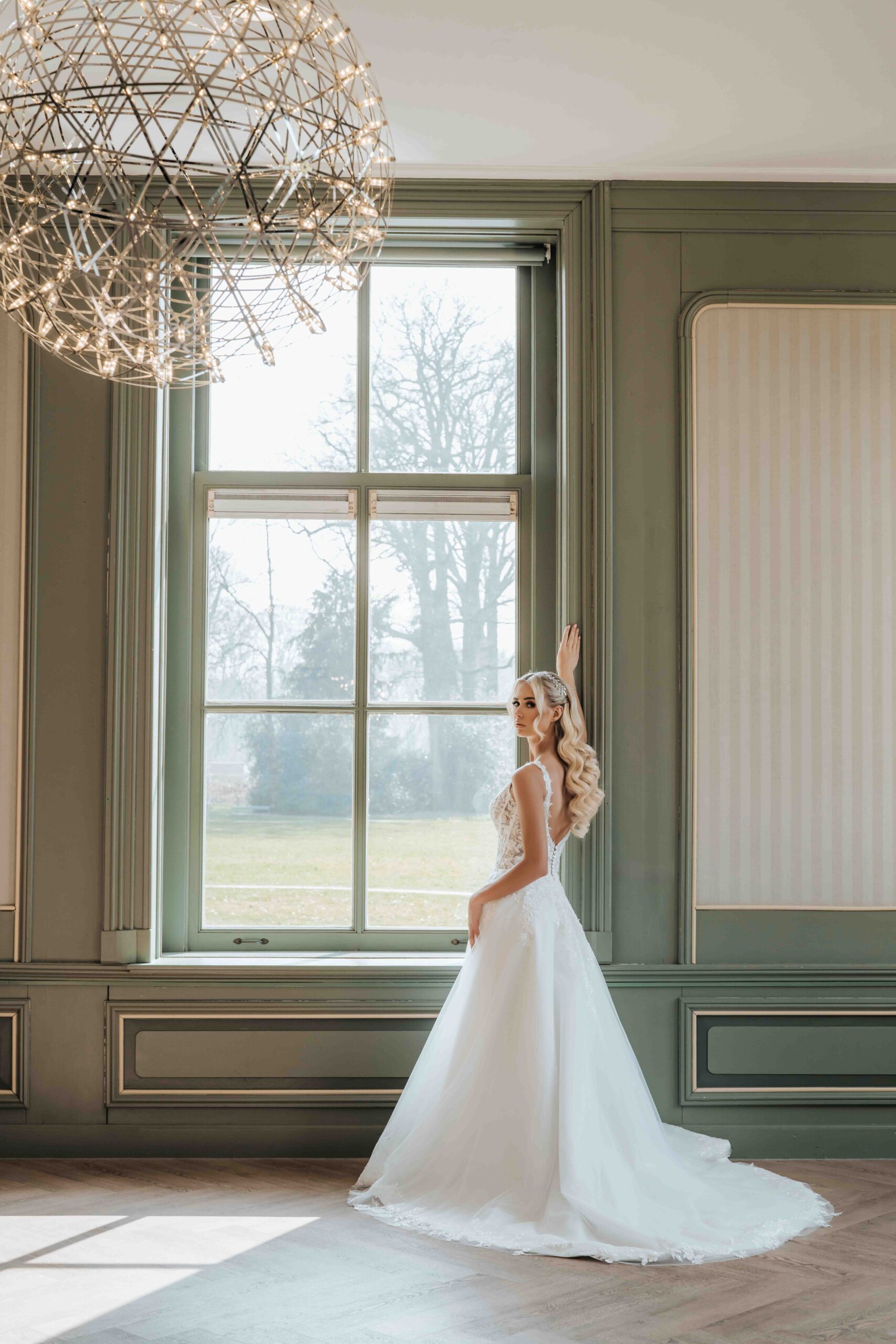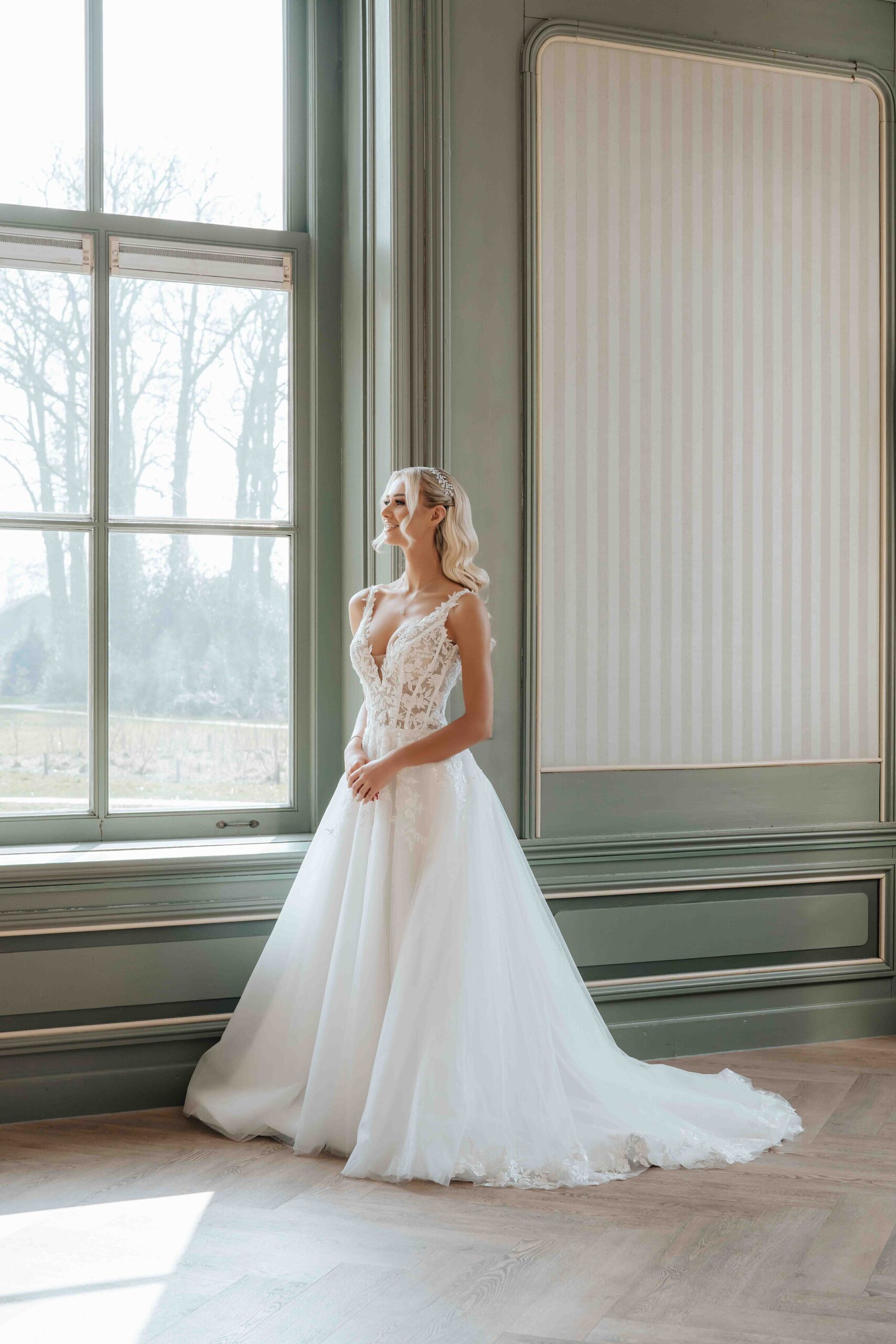 Licht, luchtig en romantisch. Odessa heeft een verfijnde pasvorm en kanten bloemen die subtiel over het lijfje vloeien. Perfect voor een buitenbruiloft of elegante locatie.