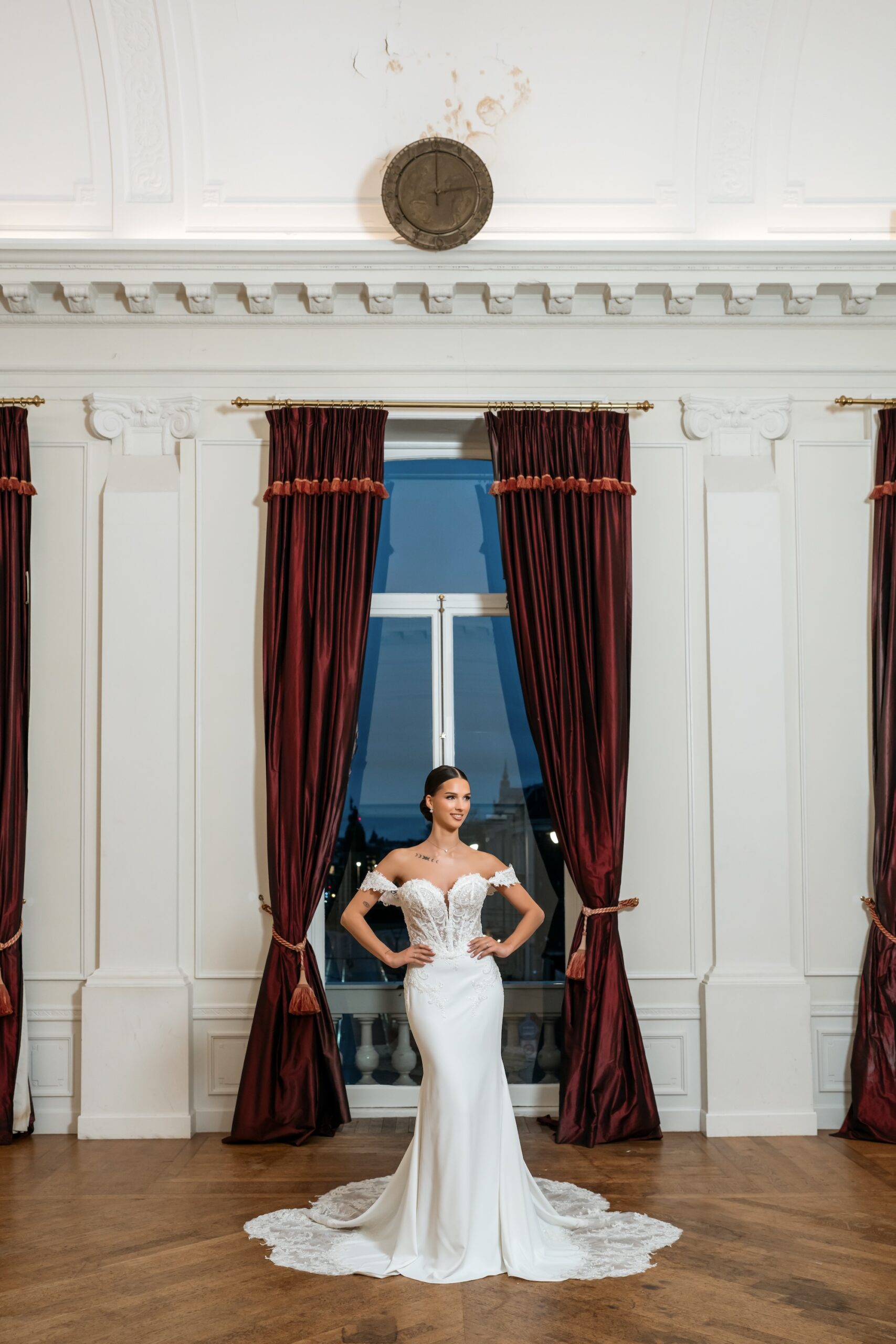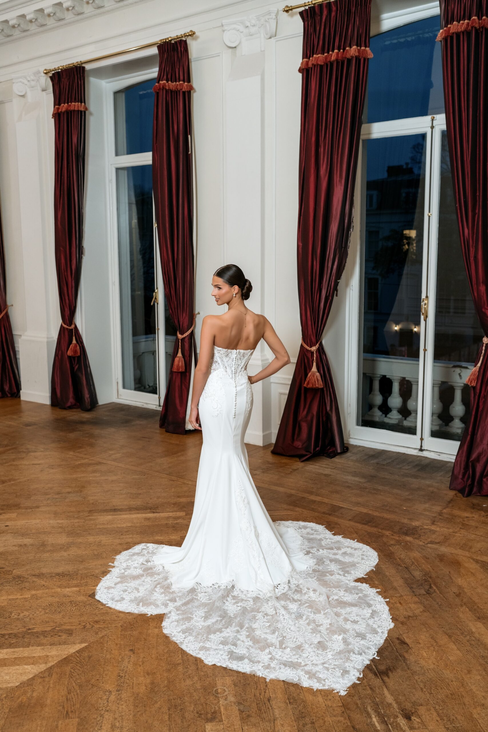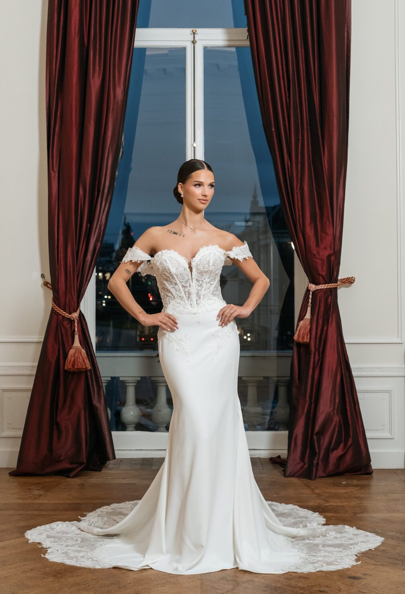 Fit & flare trouwjurk met off-shoulder kanten lijfje en een lange kanten sleep. De jurk voelt modern en romantisch en accentueert je figuur op een elegante manier.