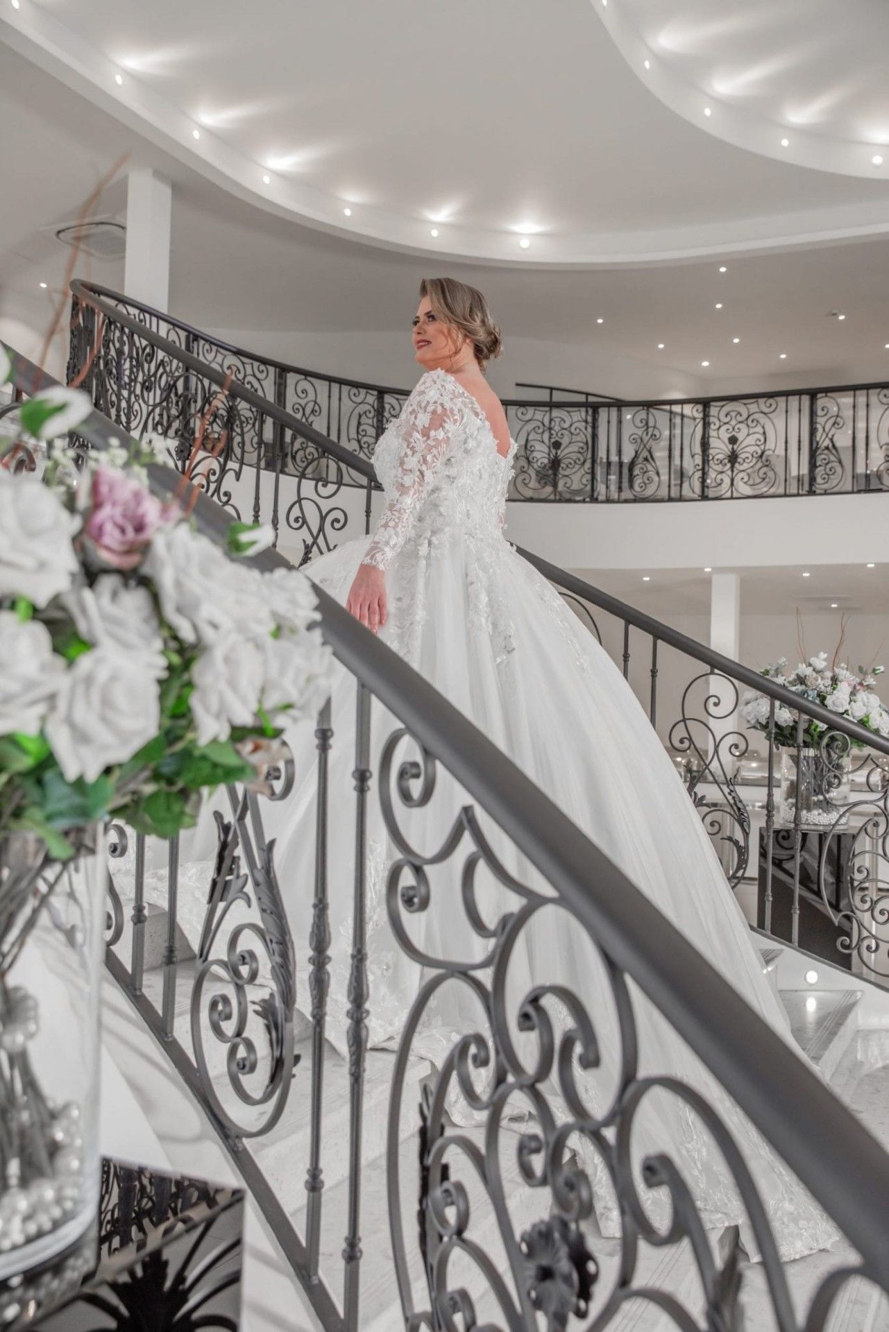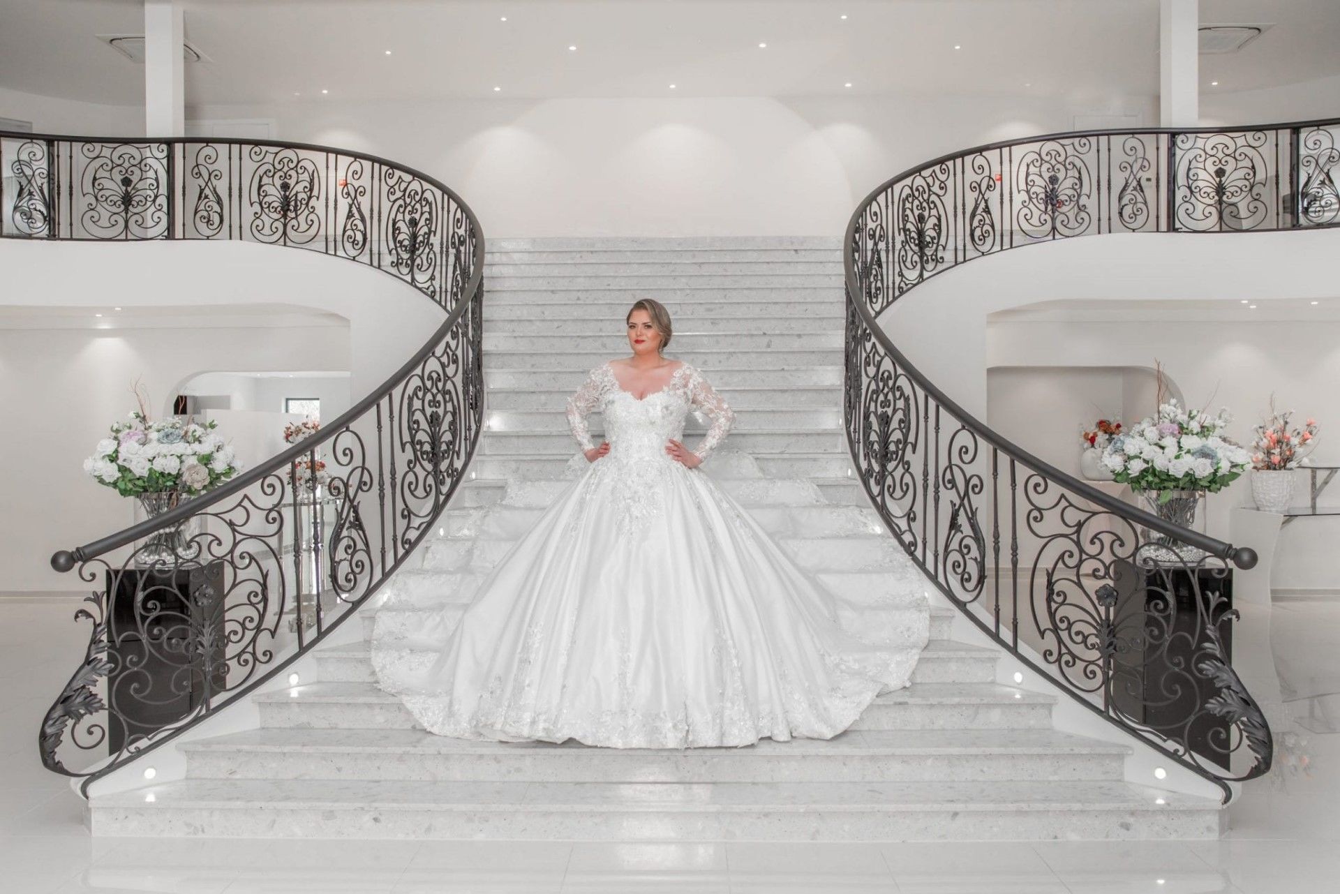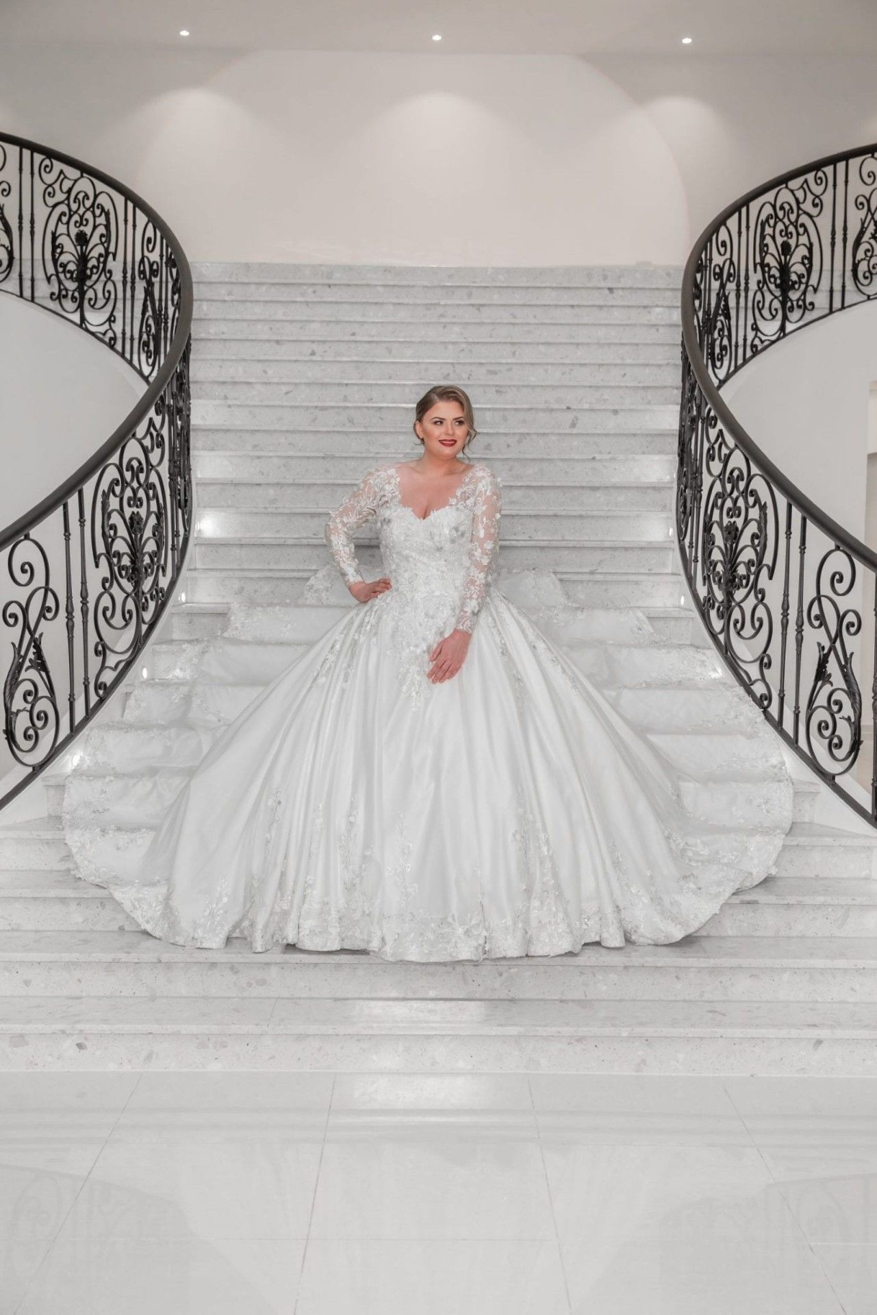 Grote maten trouwjurk Valencia is een prachtige prinses trouwjurk gemaakt van satijn met mooi bewerkte kant applicatie en 3D bloementjes. Deze trouwjurk heeft lange mouwen en een mooie sleep. Bekijk de foto’s voor meer inspiratie of kom gerust deze trouwjurk passen! Alle trouwjurken worden naar wens en op maat gemaakt.