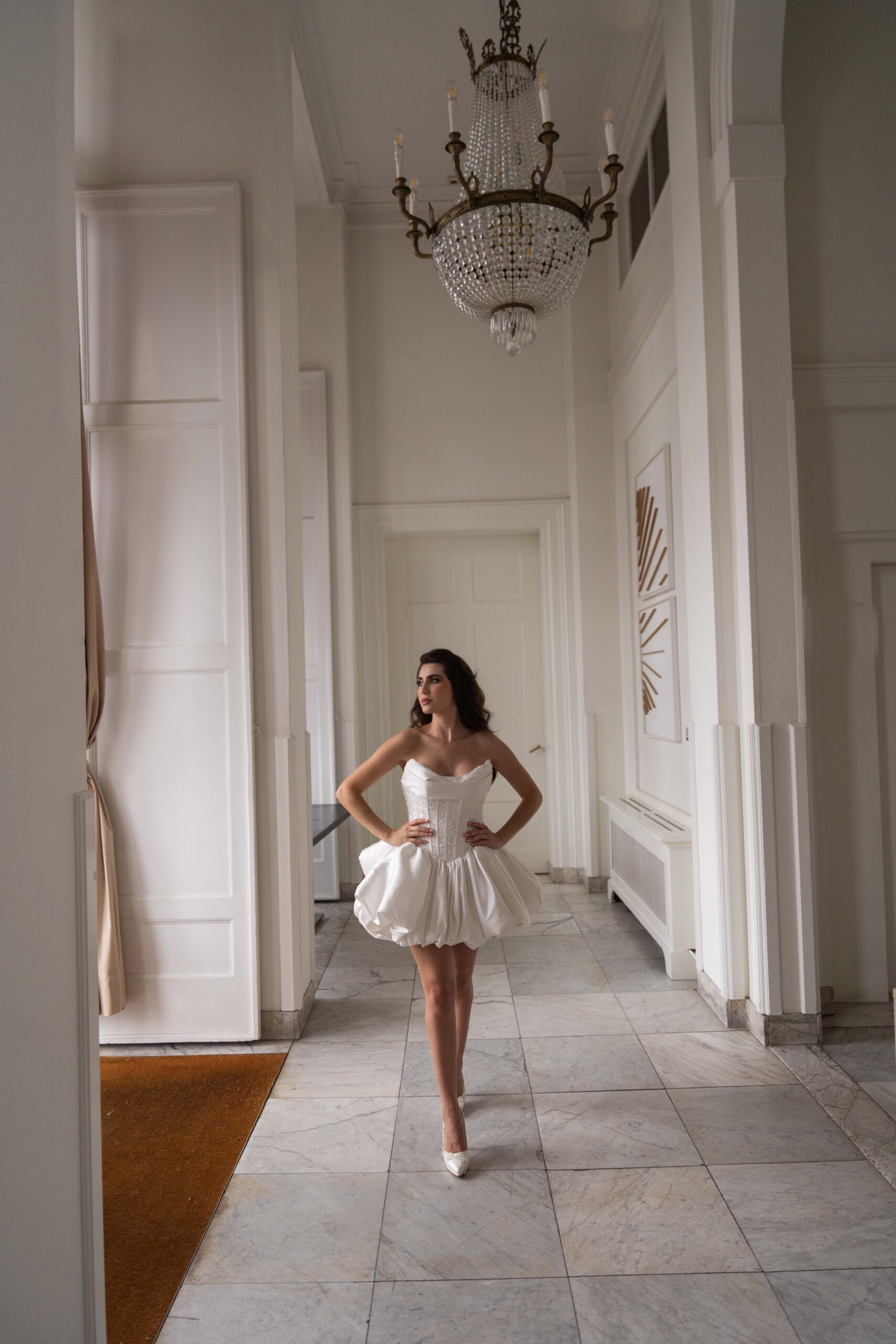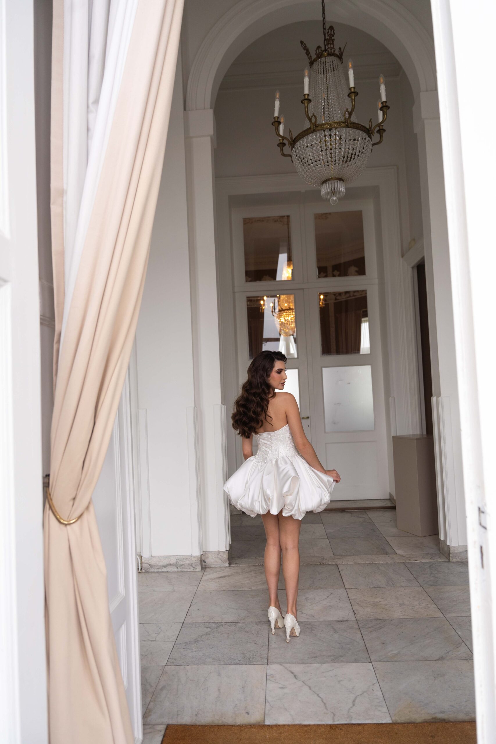 Korte trouwjurk / cocktailjurk ‘Rosa’ de ideale jurk voor in de avond! Lekker dansen met dit prachtig korte trouwjurk is niet alleen erg comfortabel maar ook super mooi! De top is mooi bewerkt met tranparante steentjes. De geplooide satijnen rok zorgt voor een leuke uitstraling tijdens het dansen! Deze korte trouwjurk wordt naar wens en op maat gemaakt. Kom dit jurkje passen in de bruidswinkel!