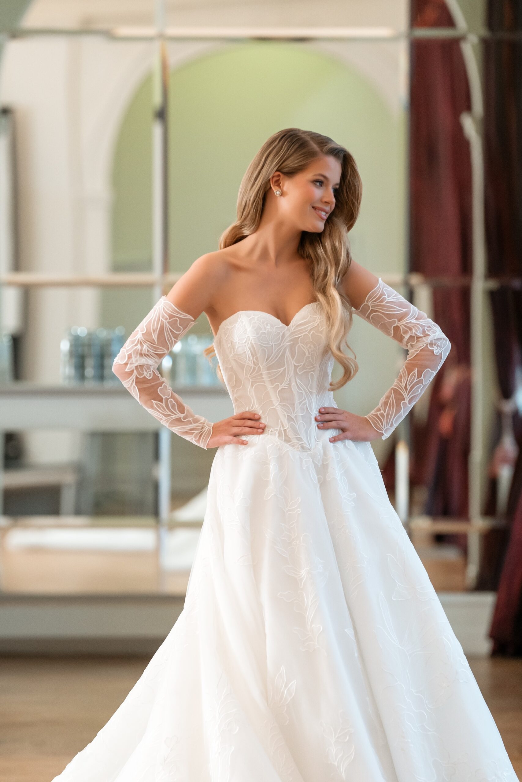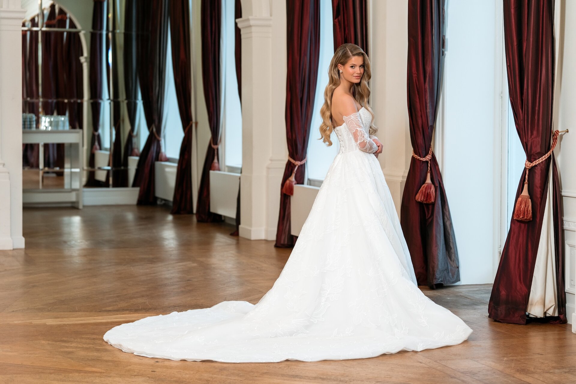 Prinsessenjurk met romantisch korset, transparante mouwen en een vallende volle rok. De 3D kantbloemen stof en lange sleep zorgen voor een droomachtige, indrukwekkende uitstraling.