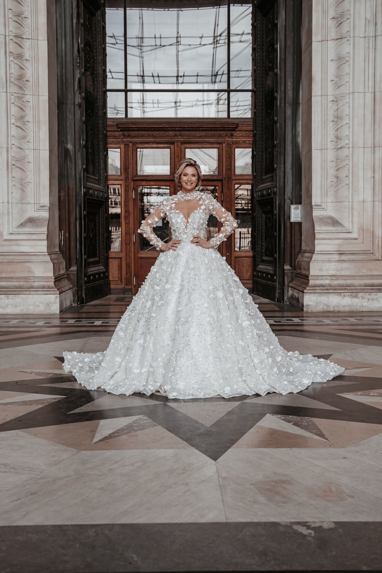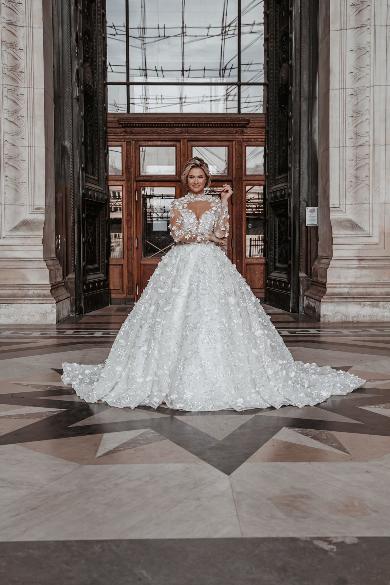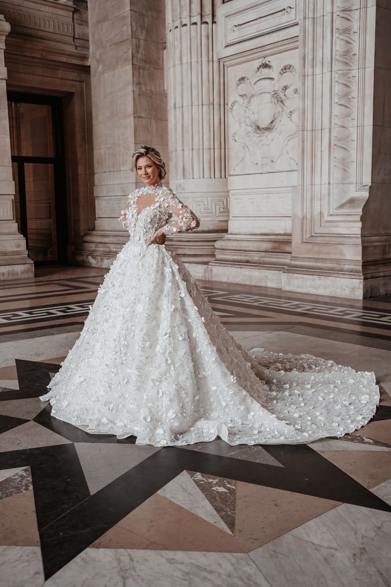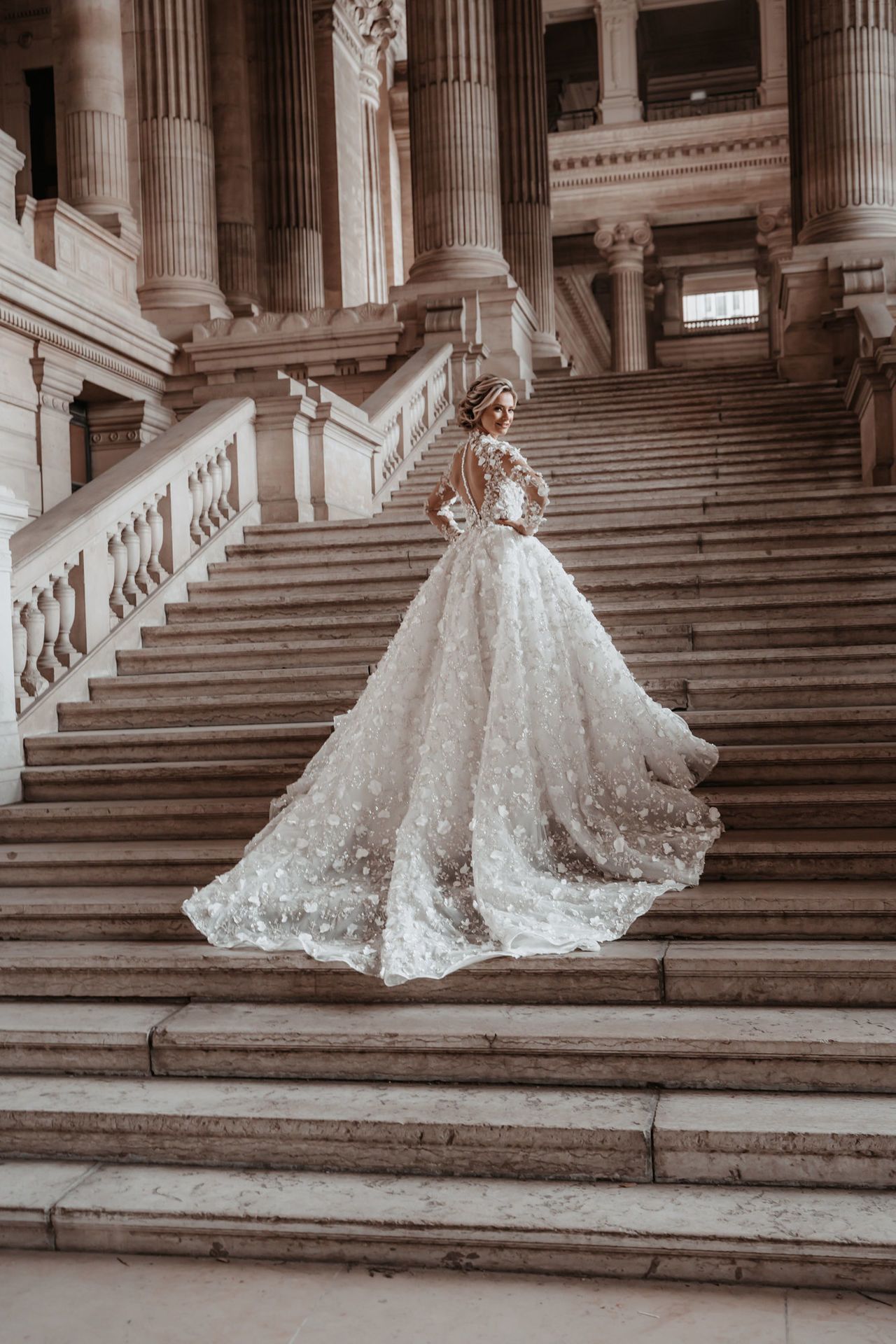 Trouwjurk Demi is een prinses jurk met een prachtige 3D bloemen / steentjes stof. De top heeft een mooie kraag & lange mouwen, de rok is volledig bewerkt met kleine & grote 3d bloemen en heeft een mooie lange sleep.