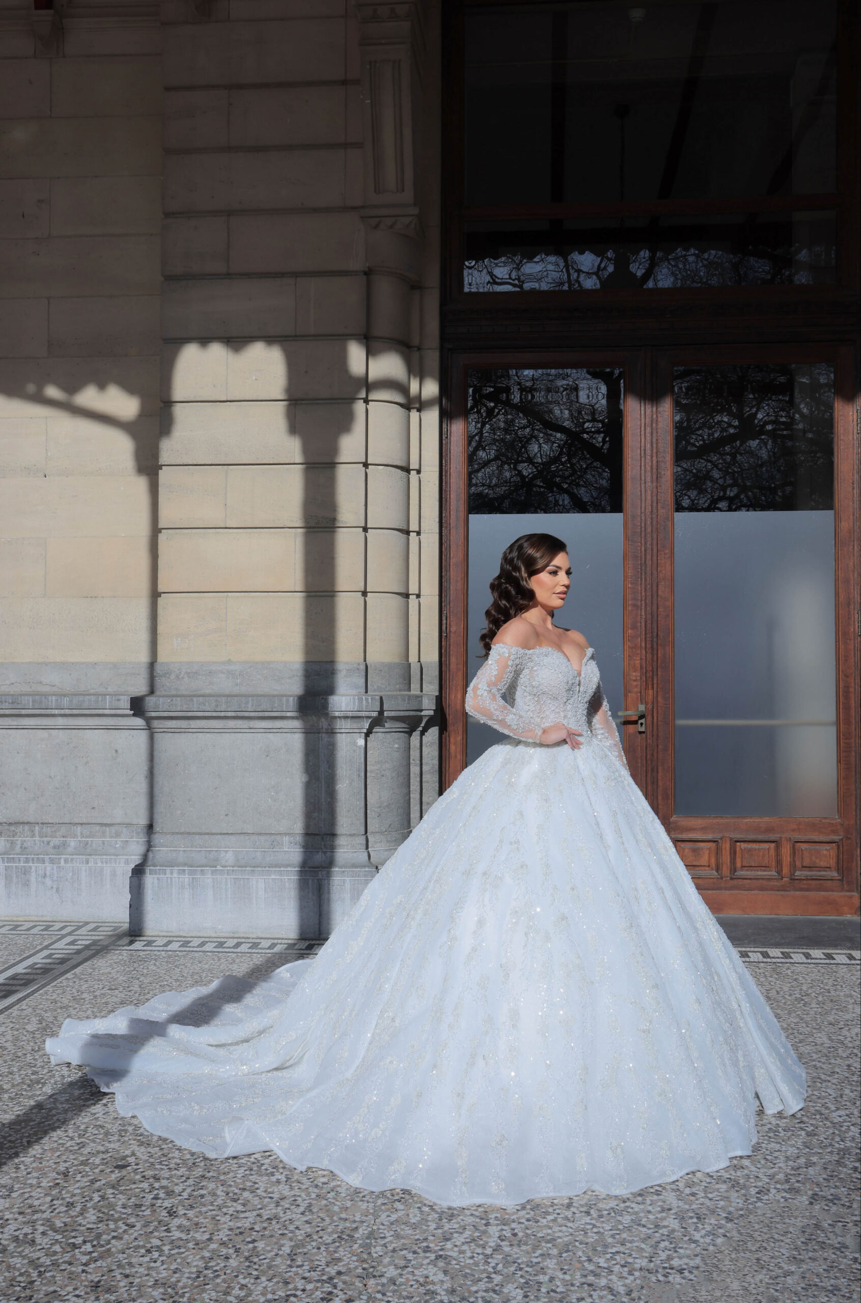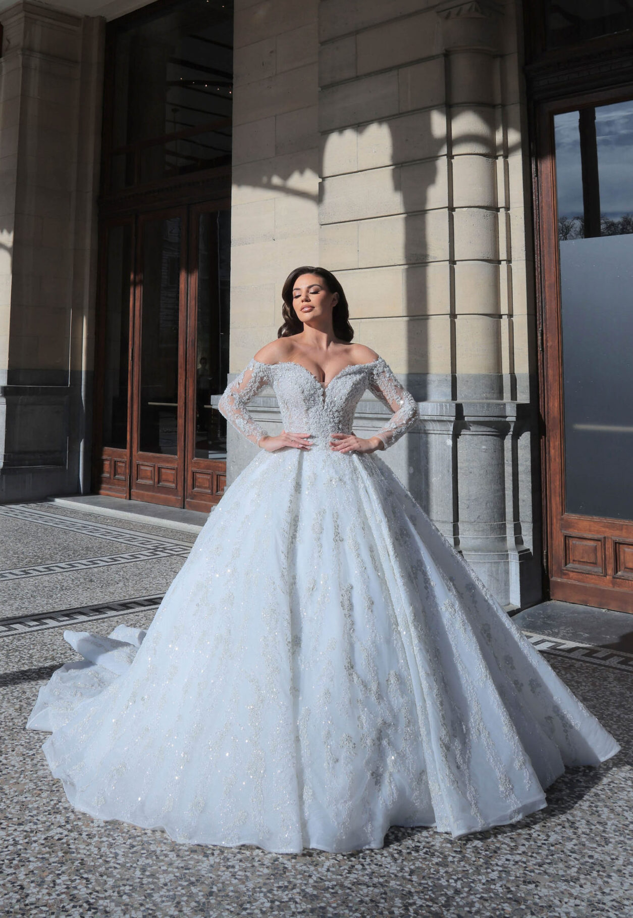 Trouwjurk Stella gemaakt van mooi bewerkte applicatie met steentjes. Een mooie halslijn van off shoulders mouwen met een extra diepe decolleté. Kom deze prachtige trouwjurk met lange sleep bewonderen in onze bruidswinkel te Zeist.