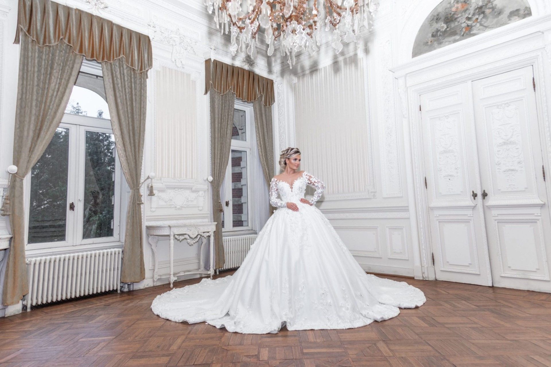 Trouwjurk Amira is onze favoriet. Een mooie prinses trouwjurk gemaakt van satijn en bewerkte kantstof/steentjes/3D bloementjes. De neklijn bestaat uit een diepe decolleté, met lange mouwen en een mooie diepe V rug. Een beauty! Kom deze prachtige bruidsjurk passen in onze bruidswinkel! De bruidsjurk wordt volledig naar wens en op maat gemaakt.