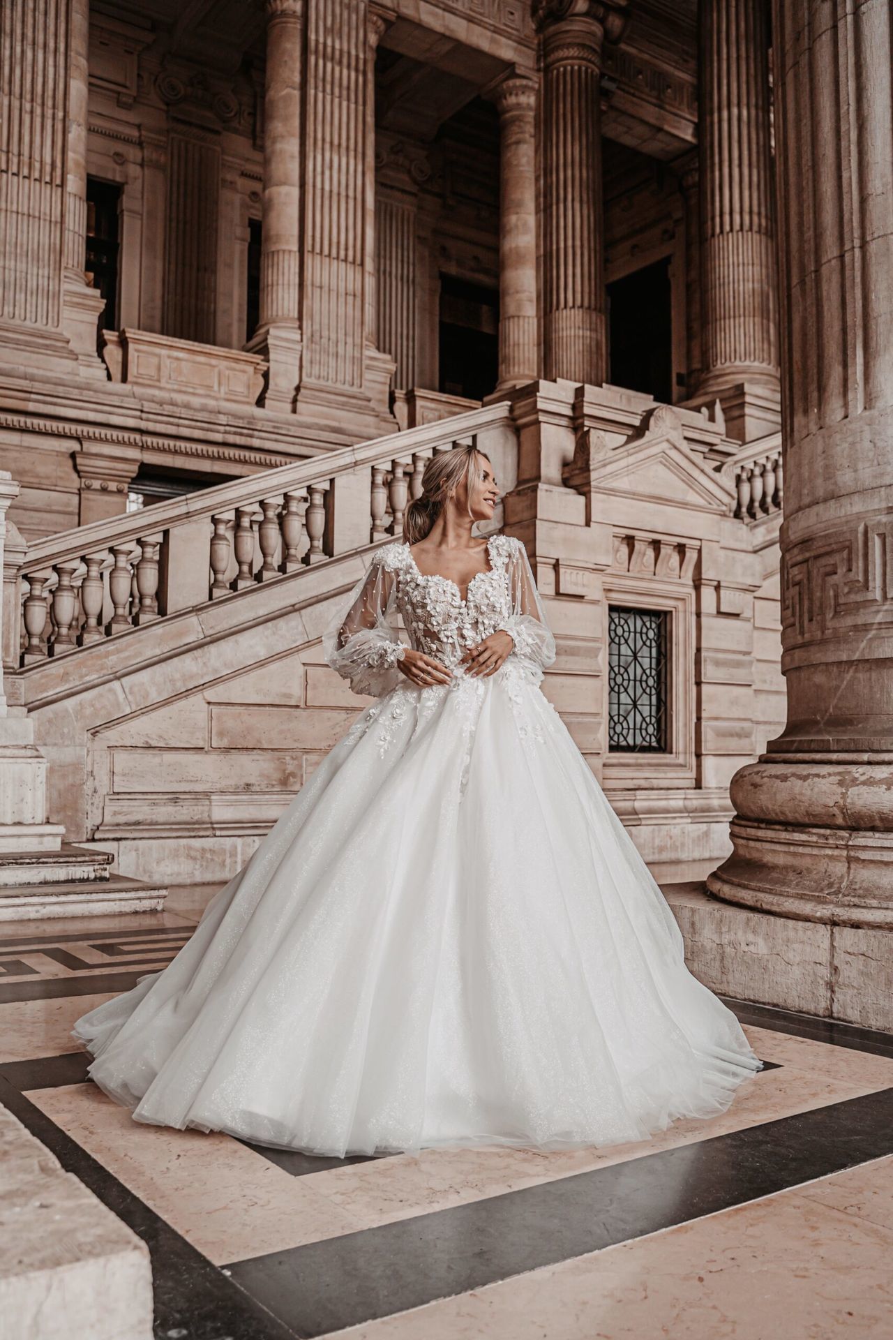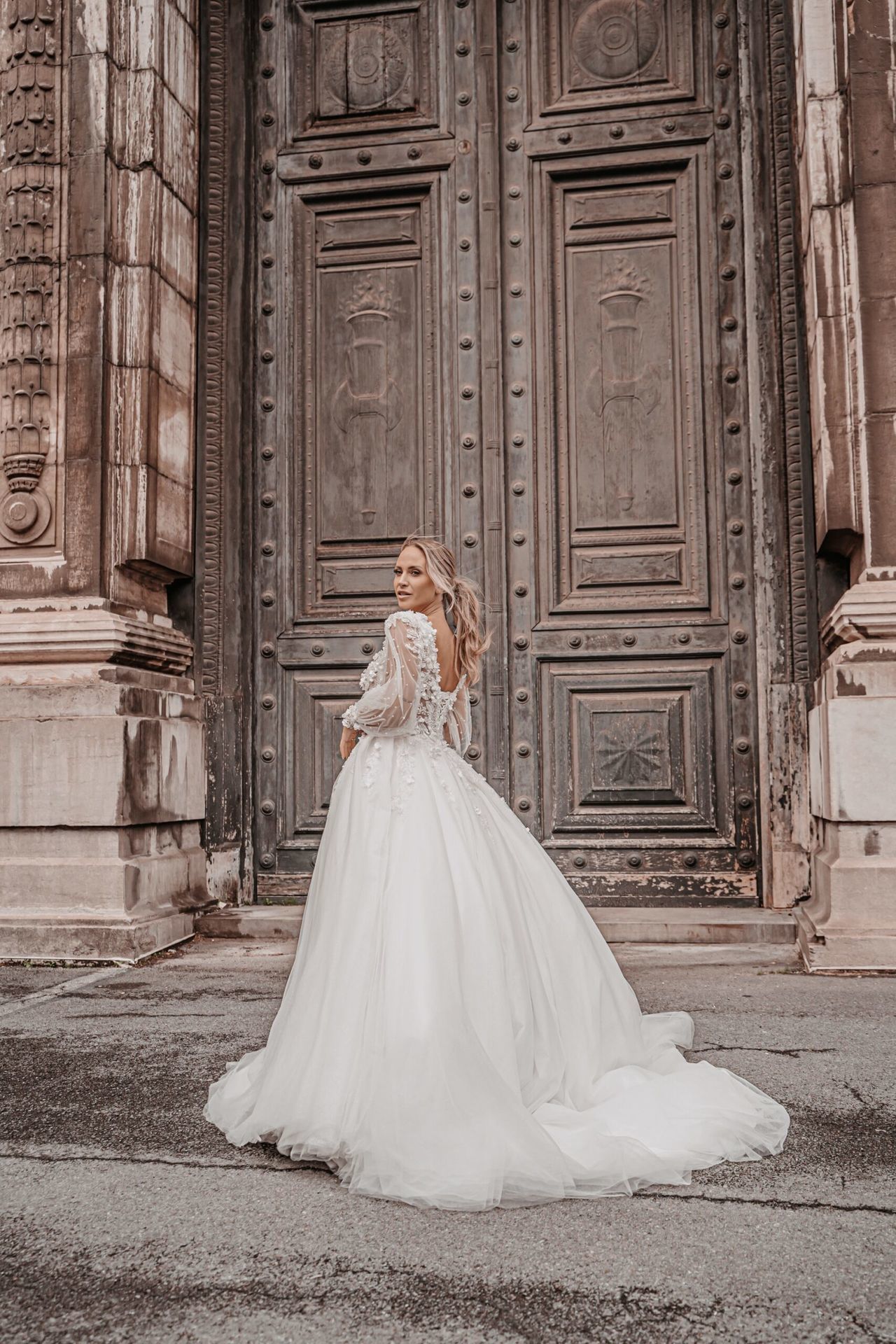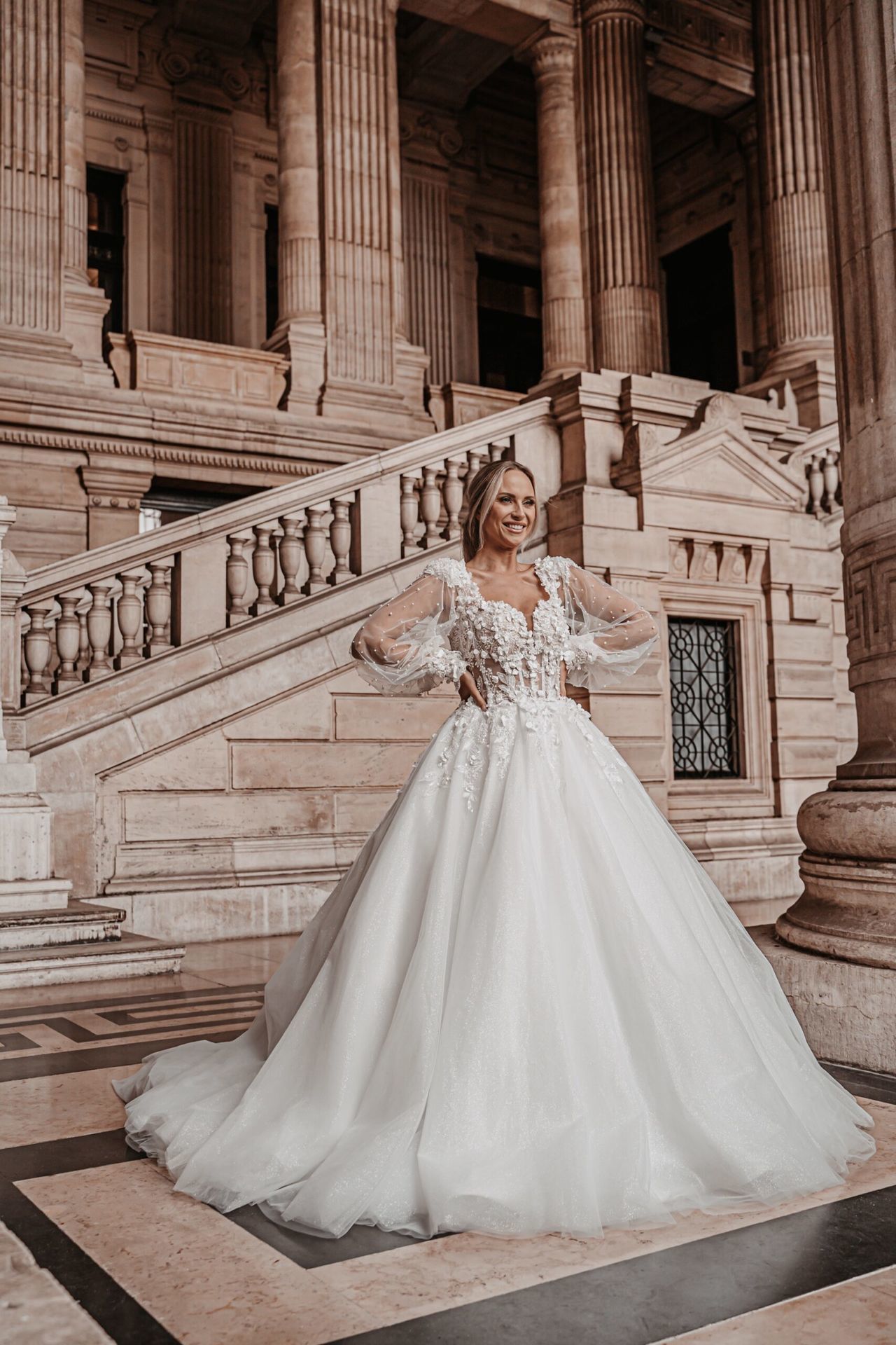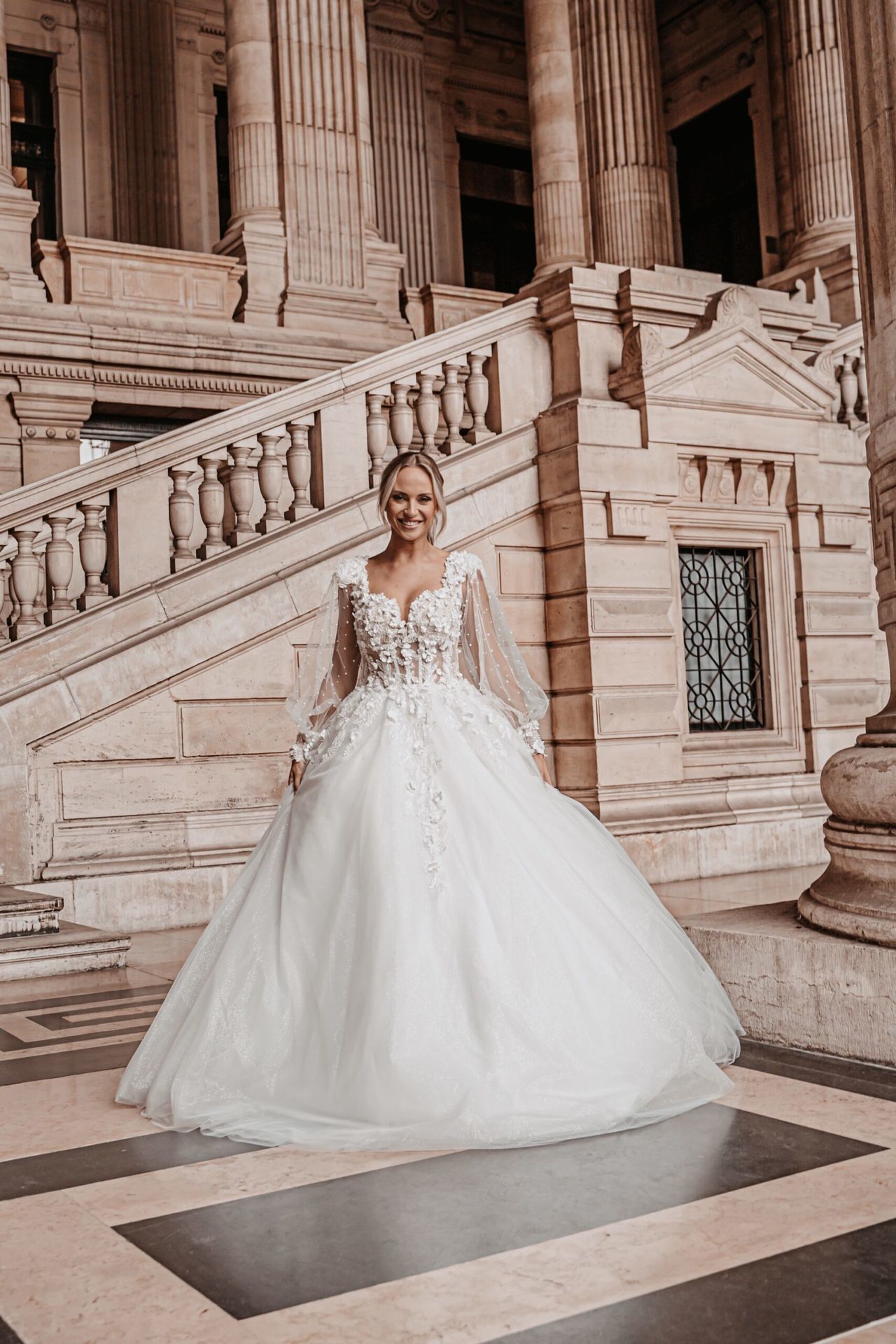 Angela is een romantische en authentieke A lijn trouwjurk, de jurk heeft een transparante top met 3D bloemen, diepe decolleté en gepofte mouwen met daarop parels. Ook de rok is niet te missen met de prachtige glitter tulle en een wat kortere sleep, Echt een dream dress!