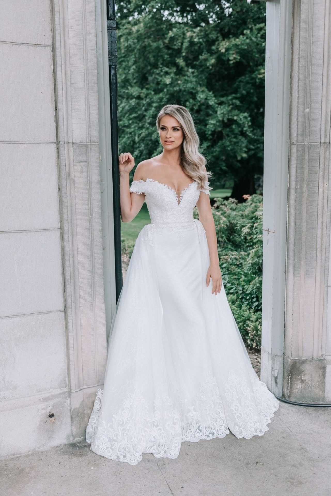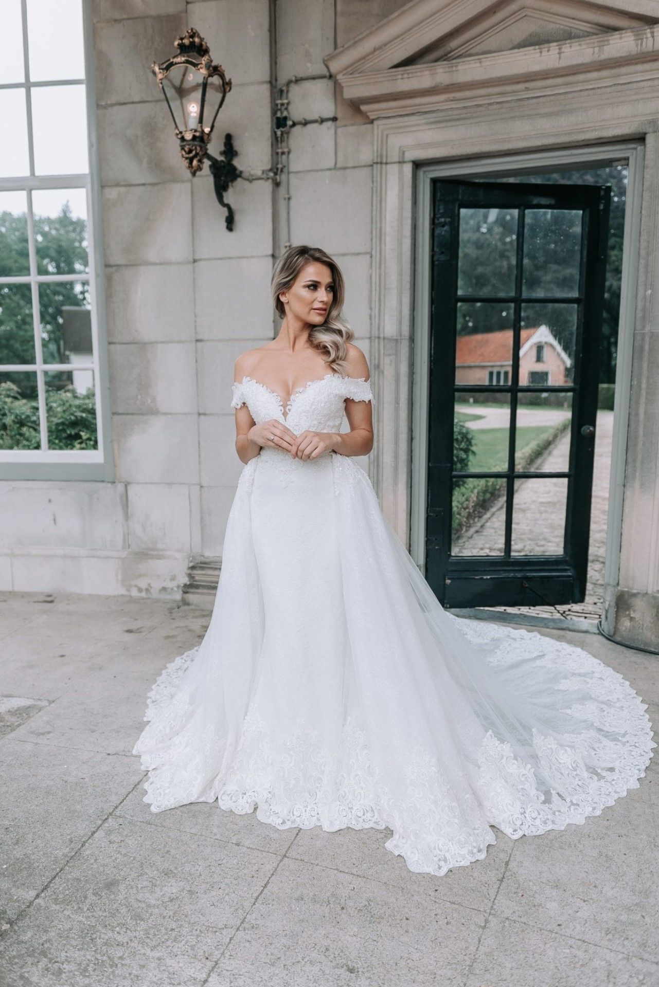 Deze trouwjurk kan ook besteld worden zonder de afklikbare rok. Wij maken alles naar wens en speciaal op maat.