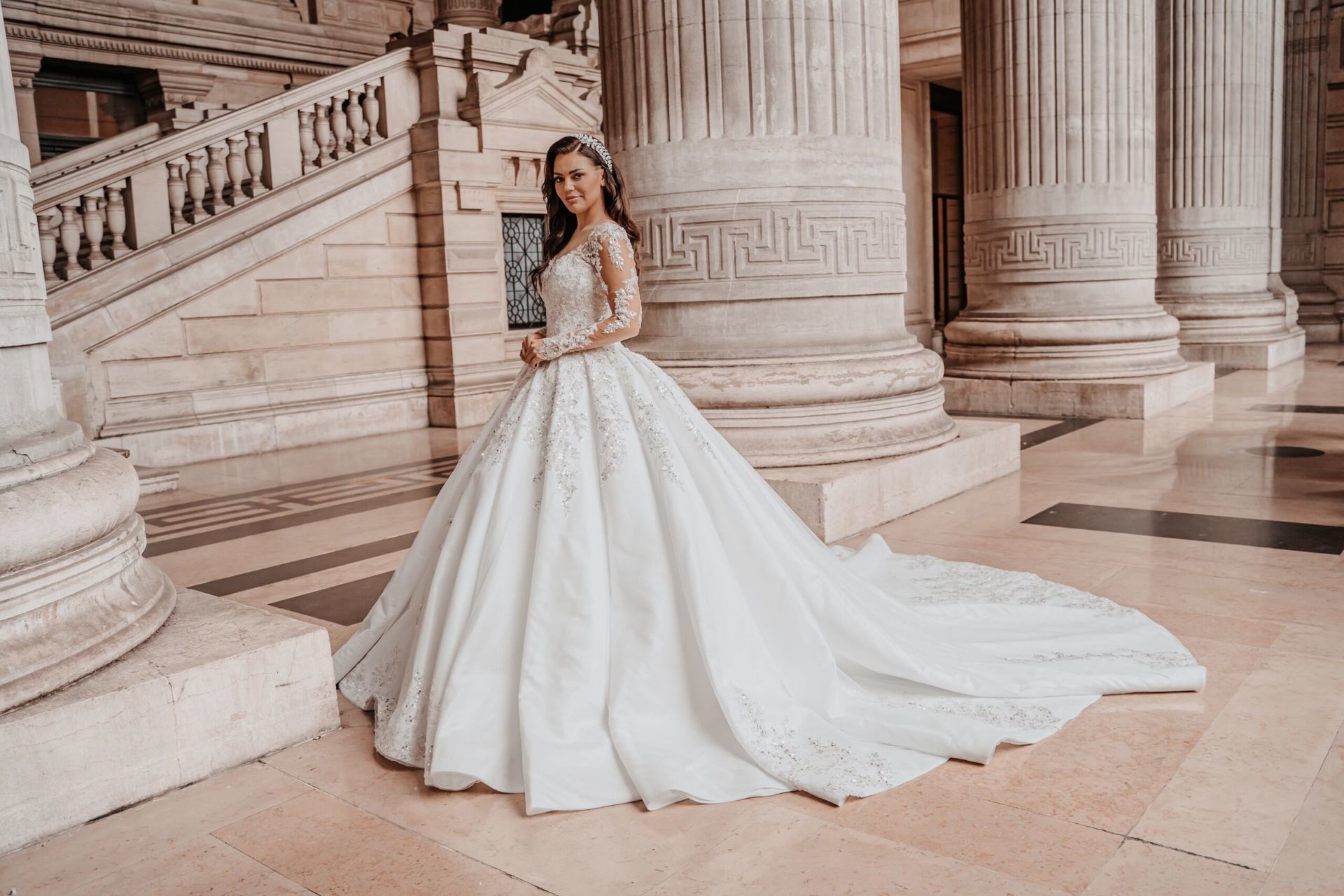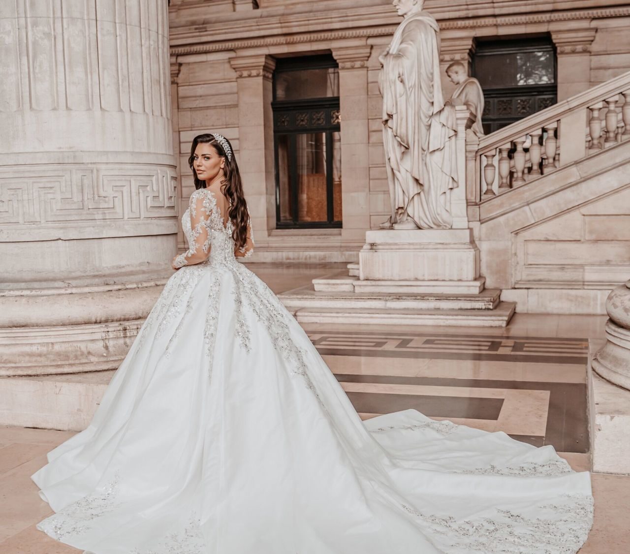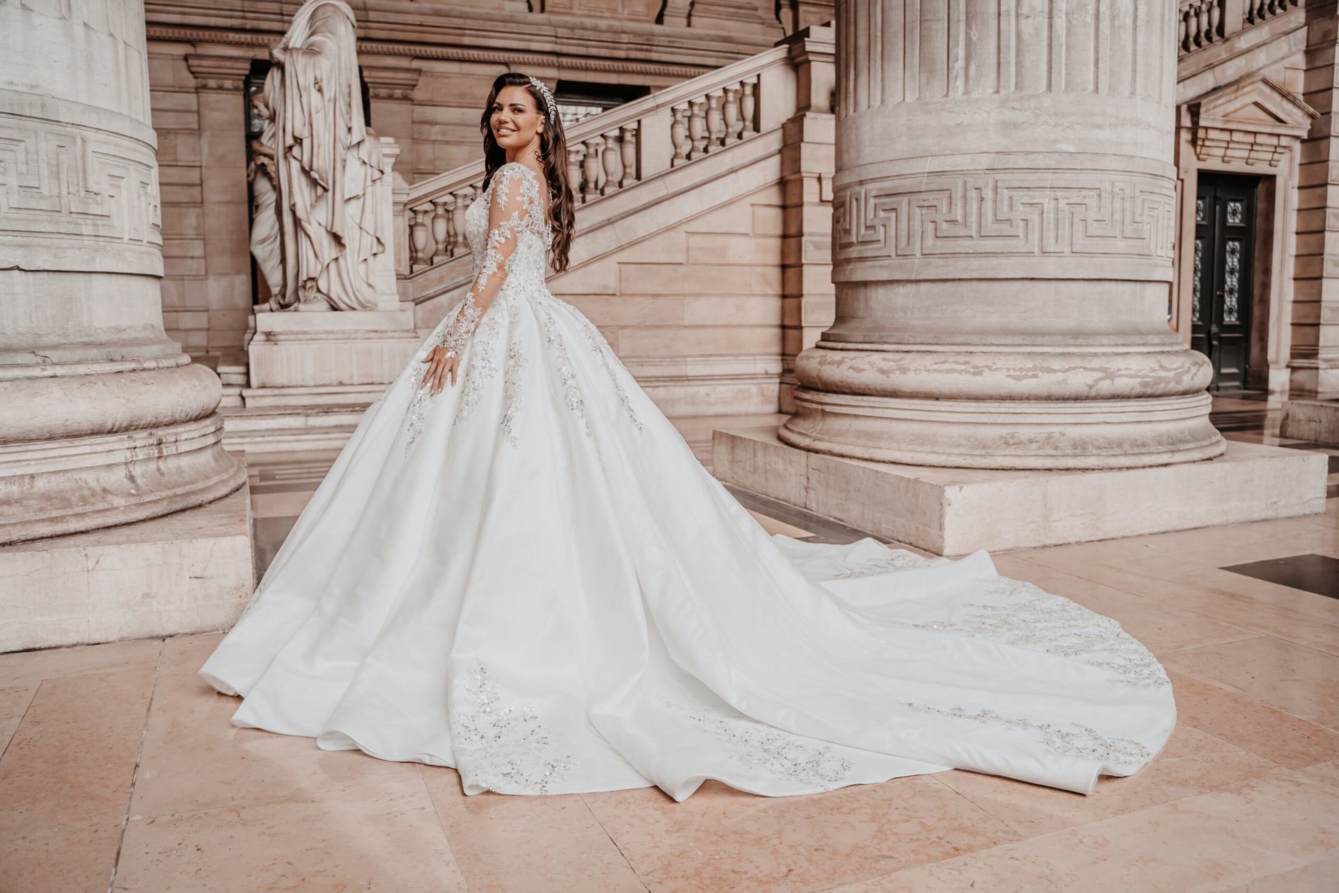 Trouwjurk Candy is een elegante prinses trouwjurk met veel glitter & glamour. De top is gemaakt van mooie bewerkte silver applicatie met lange mouwen. De rok is van mooie verharde satijn met glitter tulle. De trouwjurk is helemaal af met een lange bewerkte sleep.