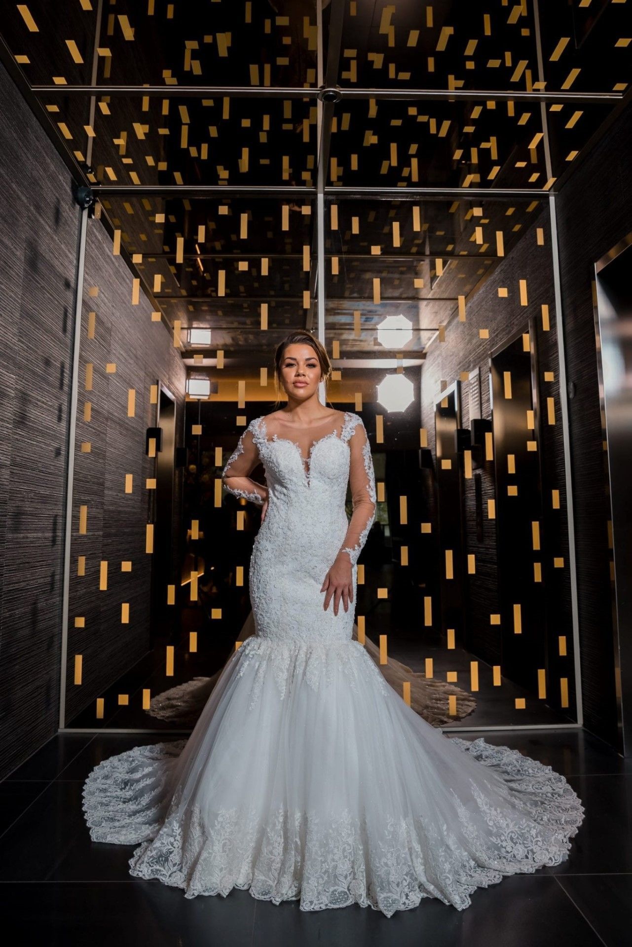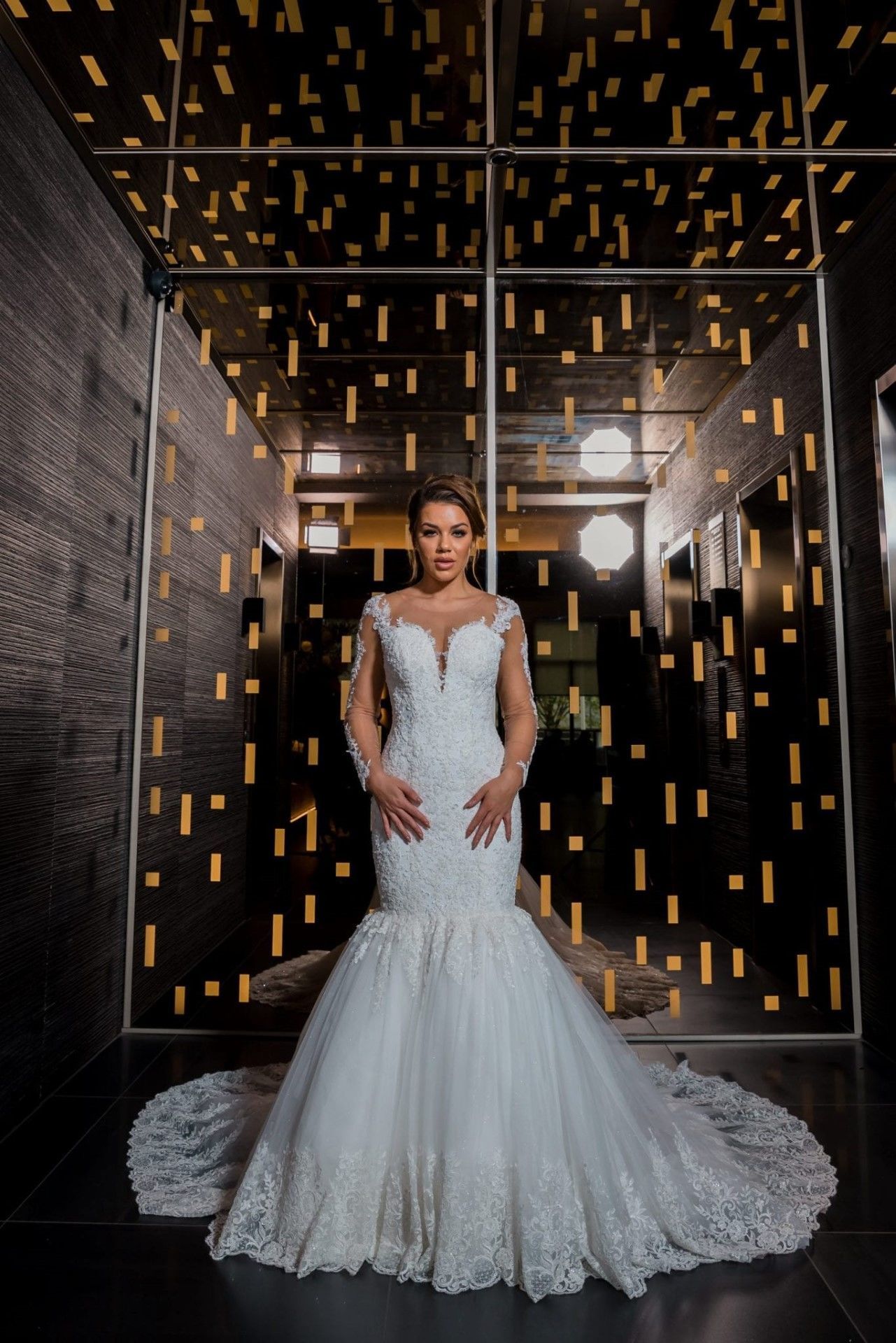 Deze zeemeermin trouwjurk is uniek door de rok, de rok heeft extra volume, 8 lagen tulle en een mooie lange sleep. De body is volledig bewerkt met kant + steentjes en heeft een diepe decolleté, lage rug en lange mouwen. De bruidsjurk wordt naar wens en op maat gemaakt.