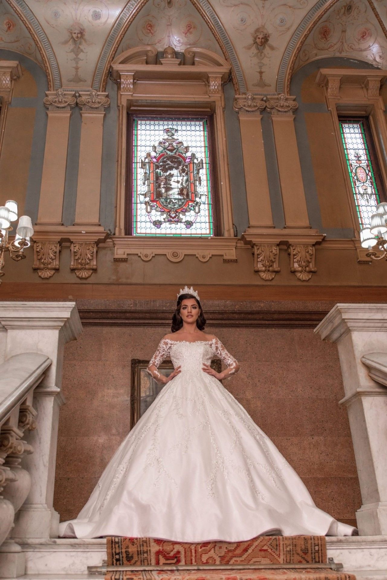 Prachtige prinses trouwjurk gemaakt van satijn met tulle en kantbewerkingen. De neklijn is gemaakt van off shoulders met lange mouwen, huidskleur tulle, wijde rok met een lange sleep. De bruidsjurken worden naar wens en speciaal op maat gemaakt.