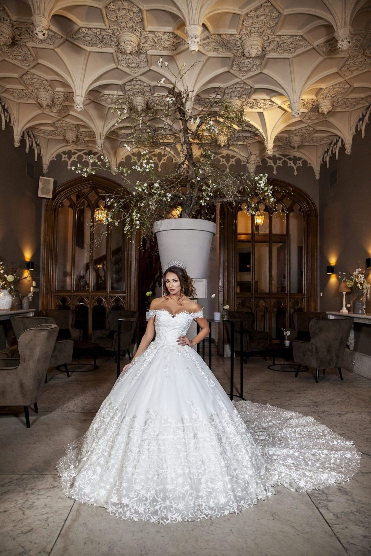 De trouwjurk Celina heeft niet veel beschrijving nodig, aangezien de foto’s van deze trouwjurk genoeg zeggen. Een extra lange sleep die prachtig is afgewerkt met kant applicaties! De bruidsjurk wordt geheel naar wens en op maat gemaakt.