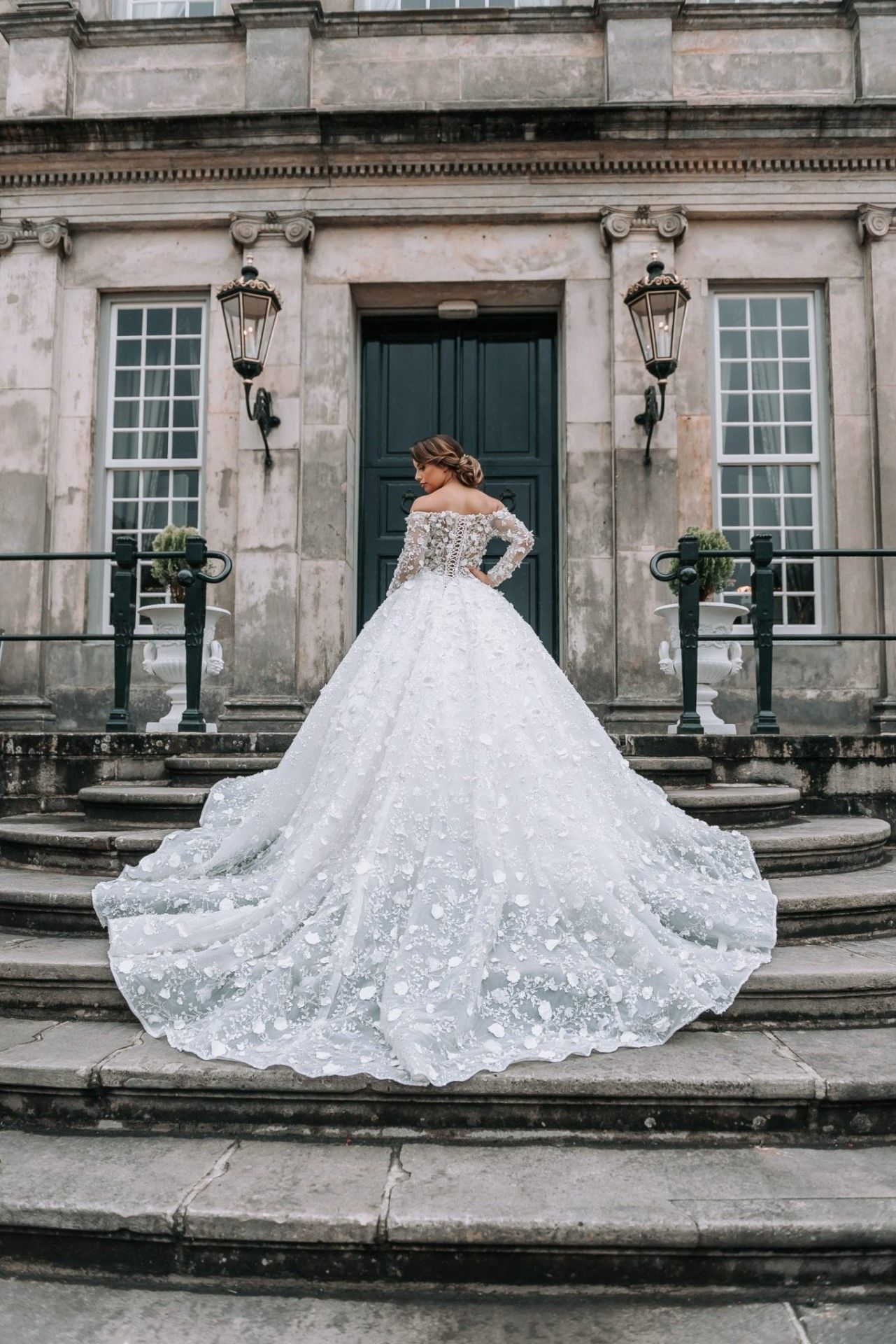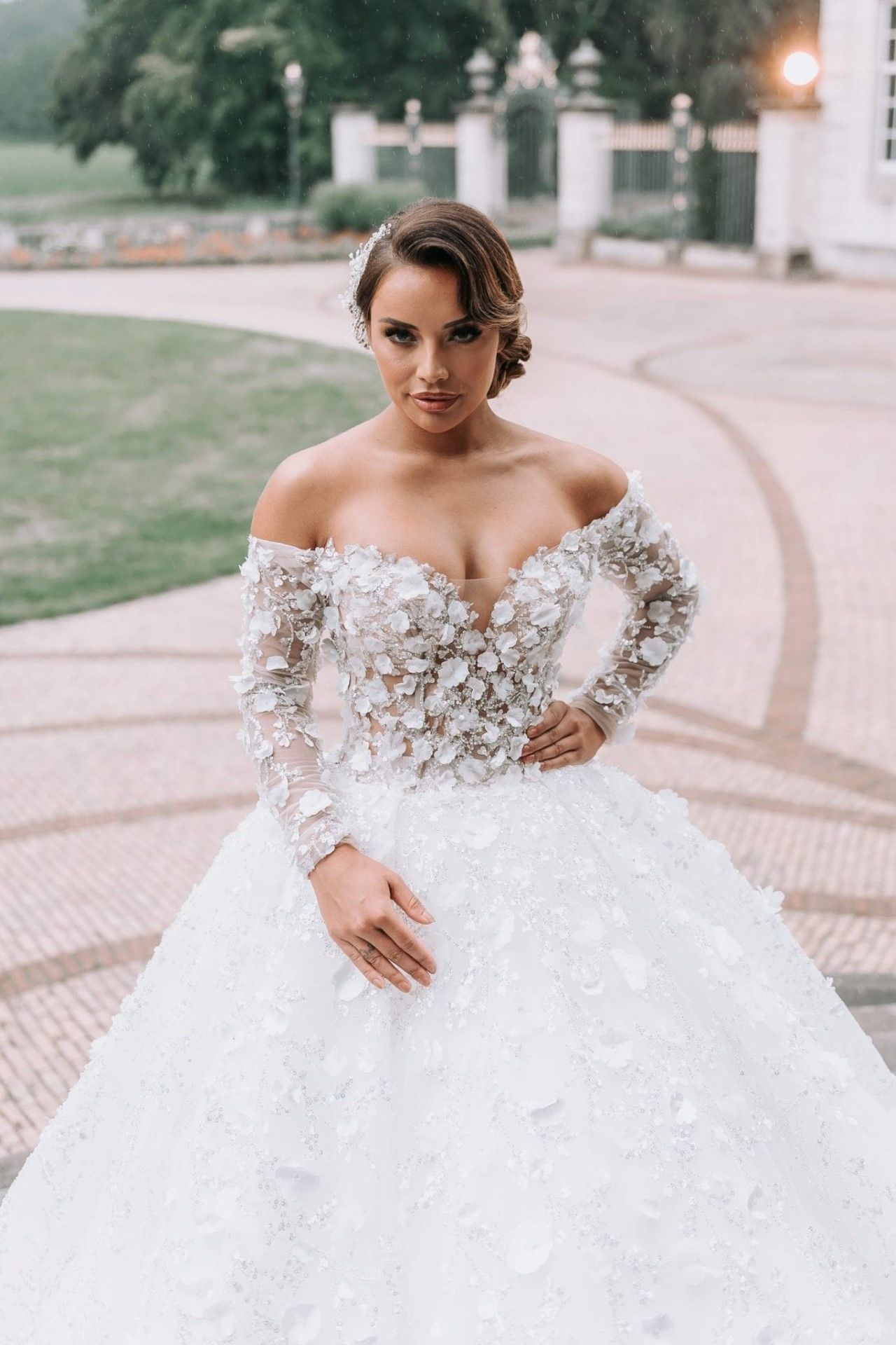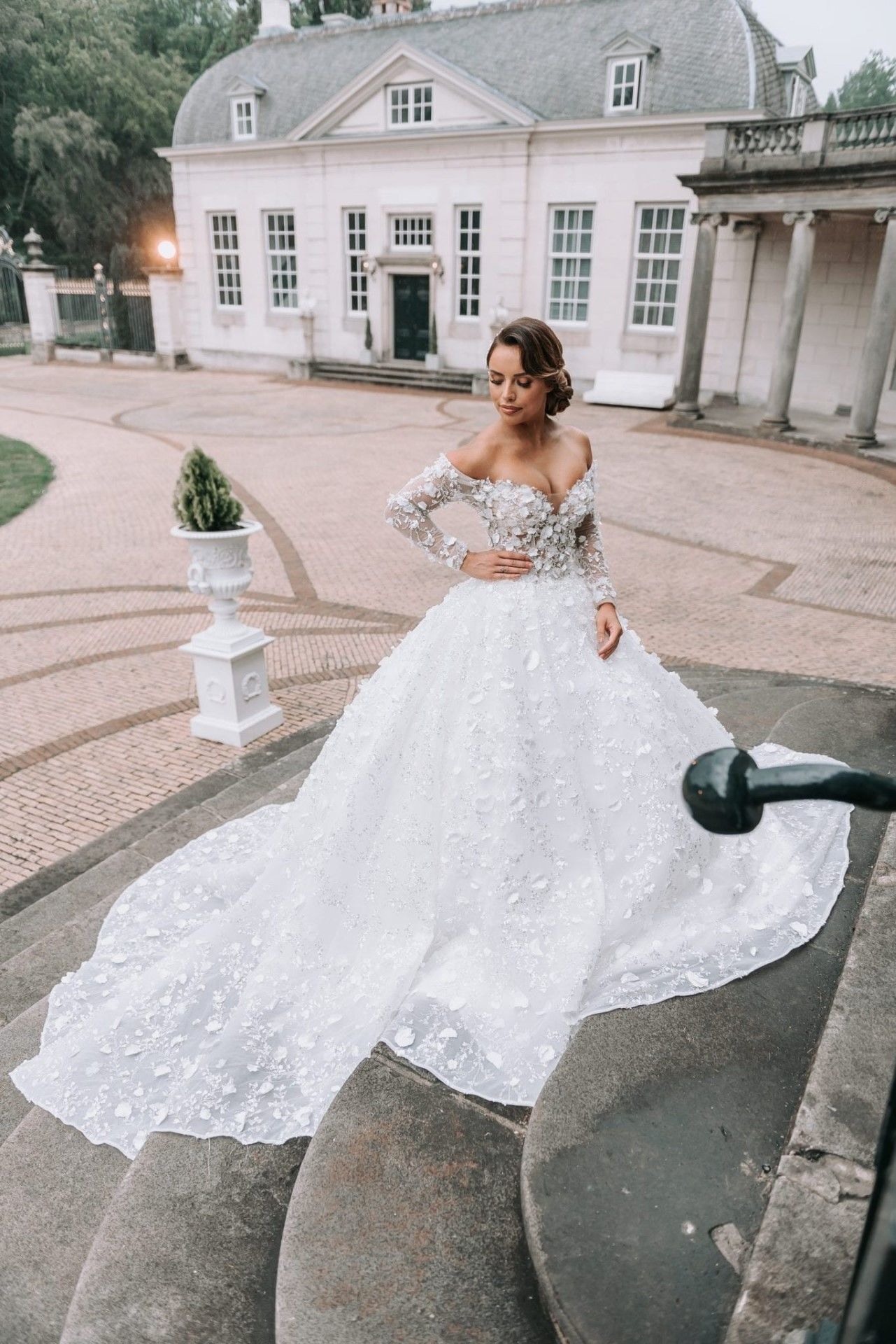 Trouwjurk Dahlia is prachtig bewerkt met steentjes en 3D bloementjes over de gehele jurk. De Off shoulders neklijn met mouwen zorgt ervoor dat je schouders er mooi en elegant uitkomen. Deze trouwjurk heeft een lange sleep, uiteraard is het mogelijk om de lengte van de sleep aan te passen naar wens.