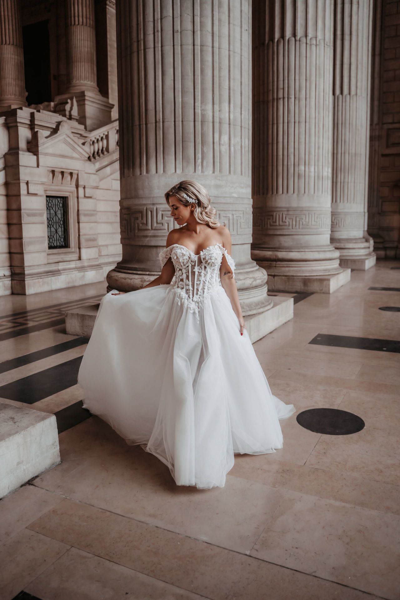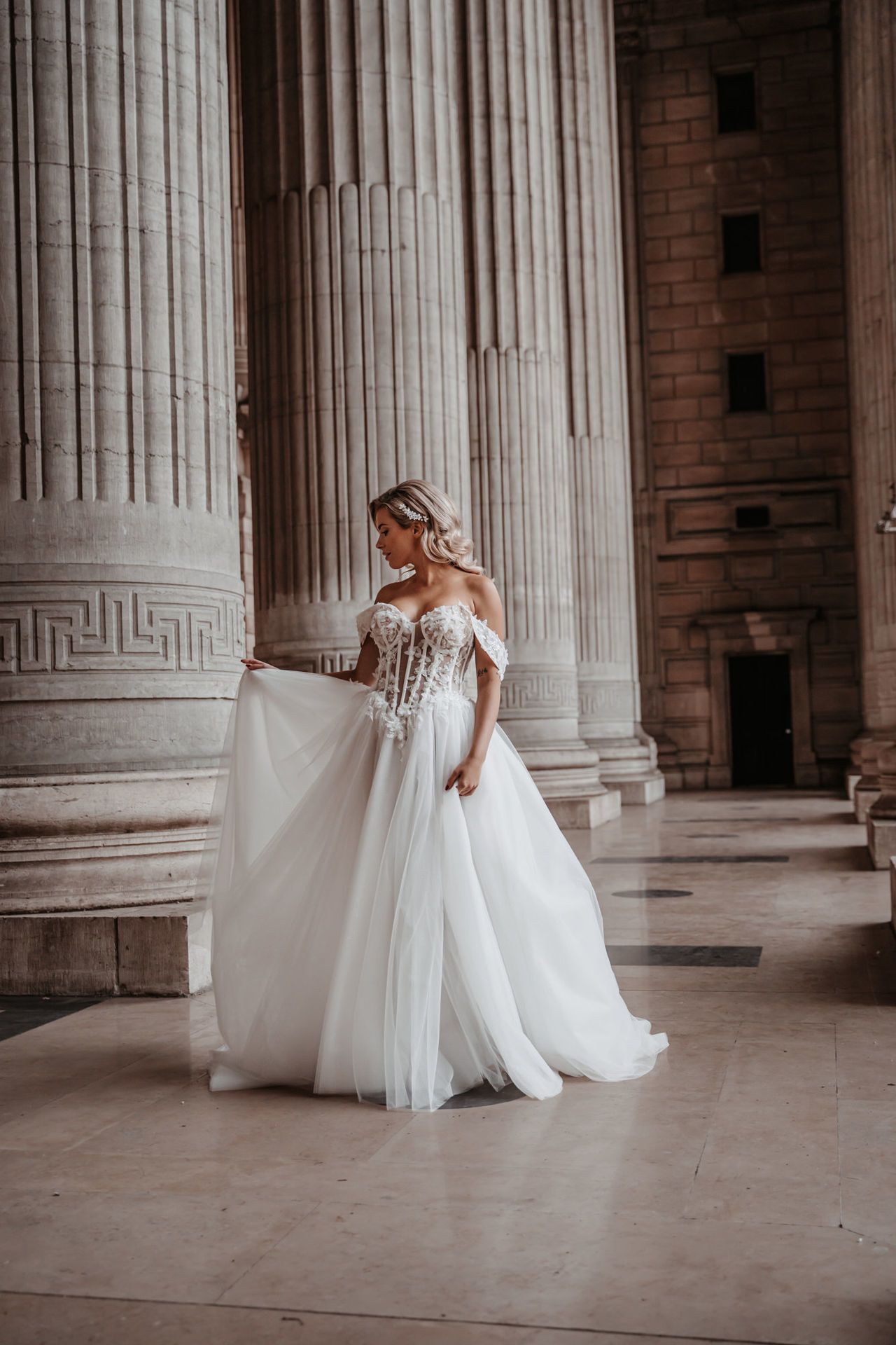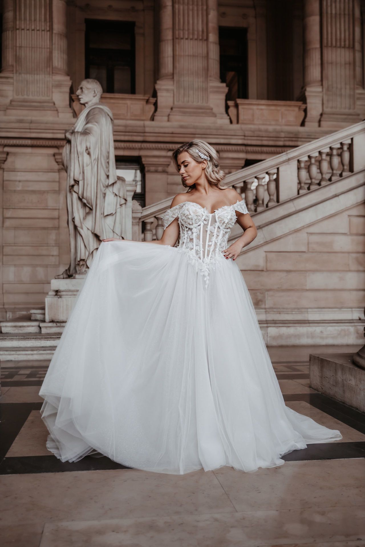 Trouwjurk Ella is gemaakt van een prachtige transparante top met speciale applicatie van bloementjes en steentjes. De rok is volledig gemaakt van tule waardoor je een mooi zwierig effect creëert. De bewerkte armbandjes zijn afklikbaar.