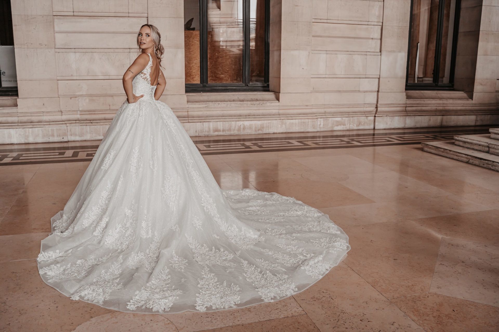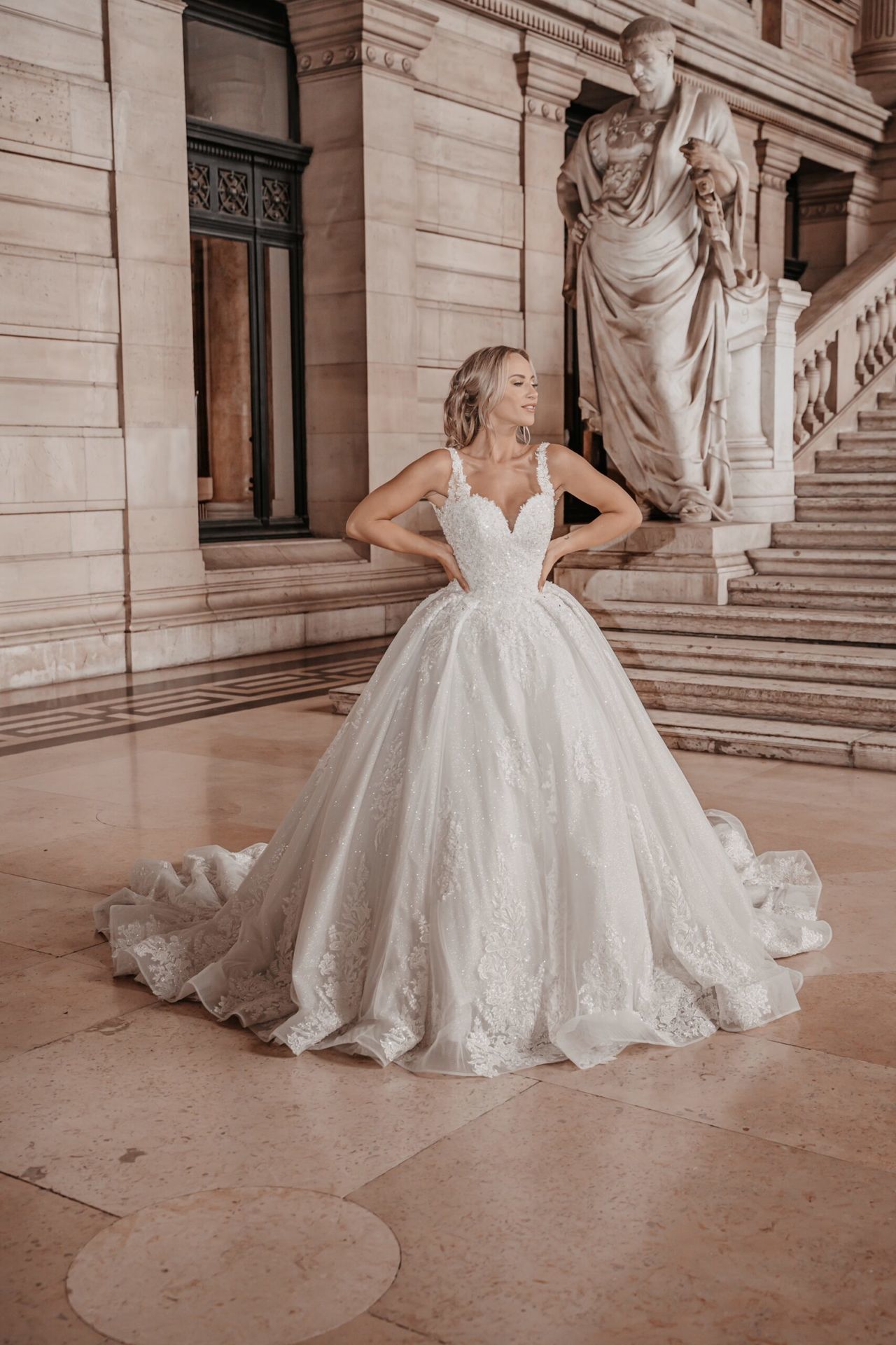 Trouwjurk Esther is een prachtige prinses trouwjurk met een mooie glitter tulle en hand bewerkte kant applicaties met witte steentjes. Haar achterkant heeft een lange sleep, corset sluiting en een lage rug. Een mooie sluier met glitter tulle en kant applicaties maken de jurk natuurlijk helemaal af.