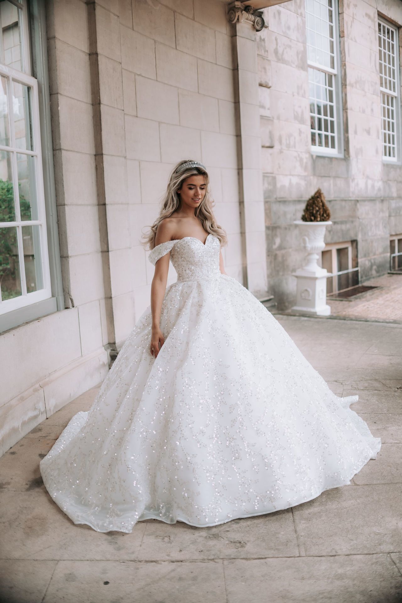 Trouwjurk Jamy is een prinses jurk met een prachtige bewerkte steentjes/3D bloemen stof. De trouwjurk is gemaakt van de mooie stof satijn met een vol bewerkte steentjes/3D bloemen stof. De trouwjurk heeft een prachtige lange sleep en afklikbare off schouderbandjes.