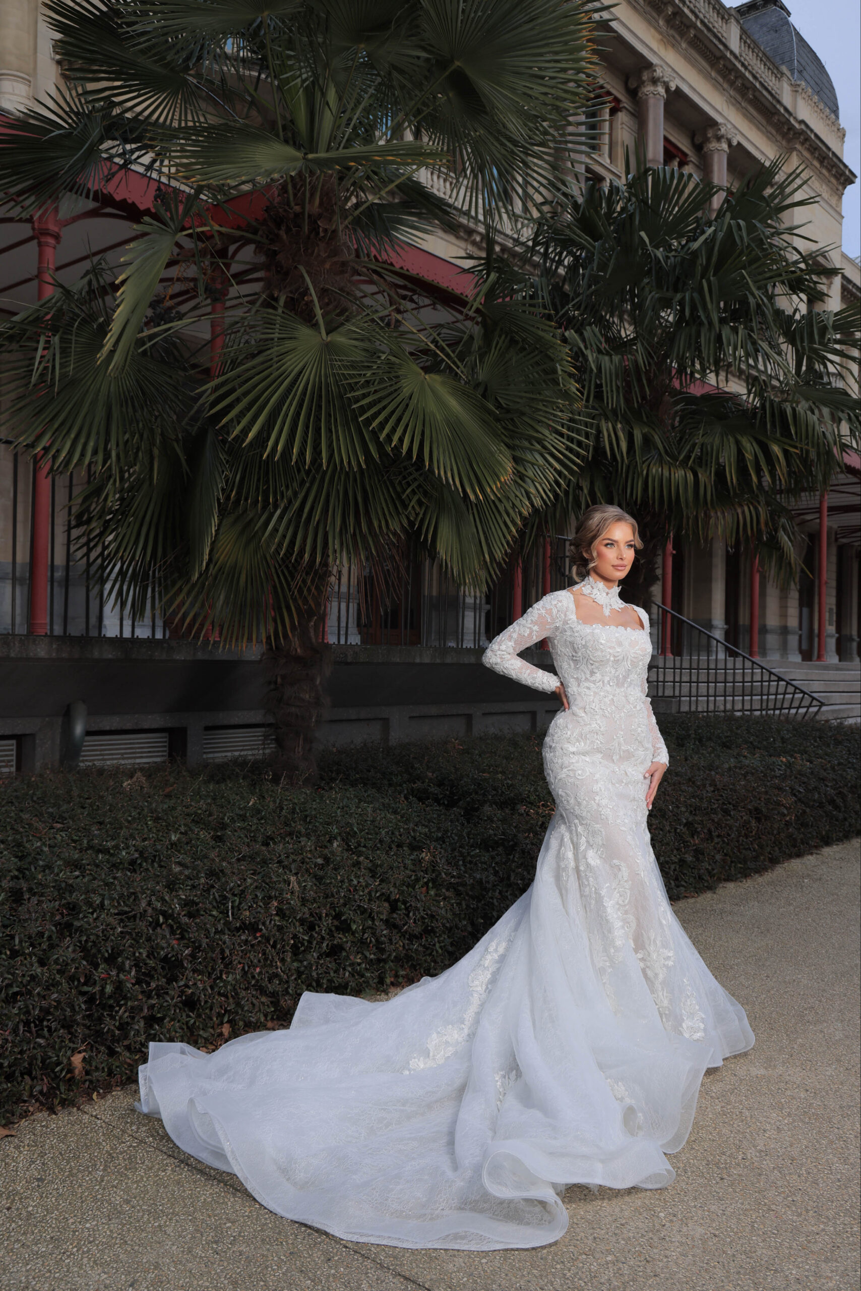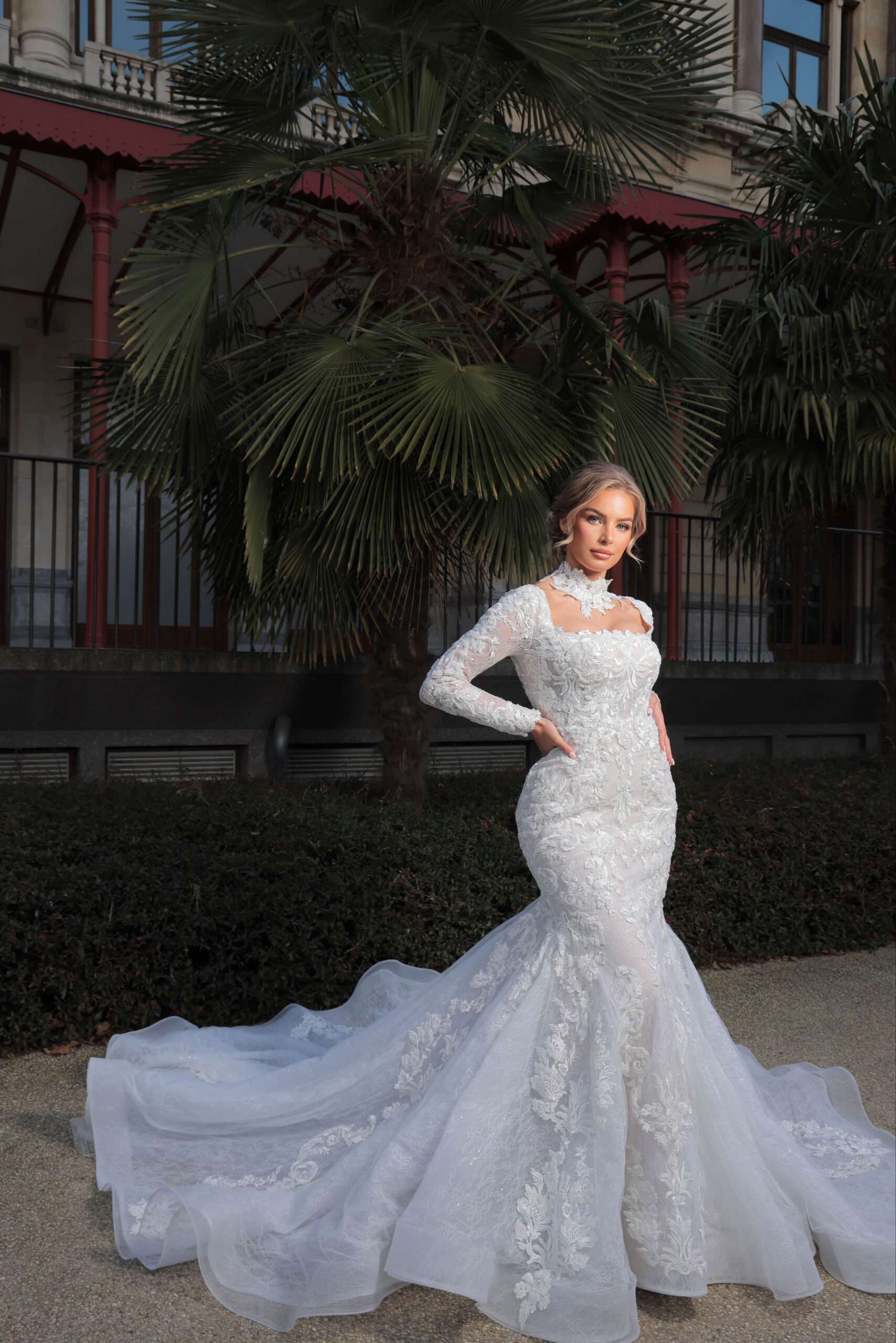 Trouwjurk Kathelijne heeft een mooie vierkant halslijn met een prachtige afklikbare kanten kraag. De trouwjurk is gemaakt van mooie kantenstof in combinatie van tule met bewerkte kant applicaties. Laatste mooie kenmerk is de lange sleep van deze prachtige zeemeermin trouwjurk.