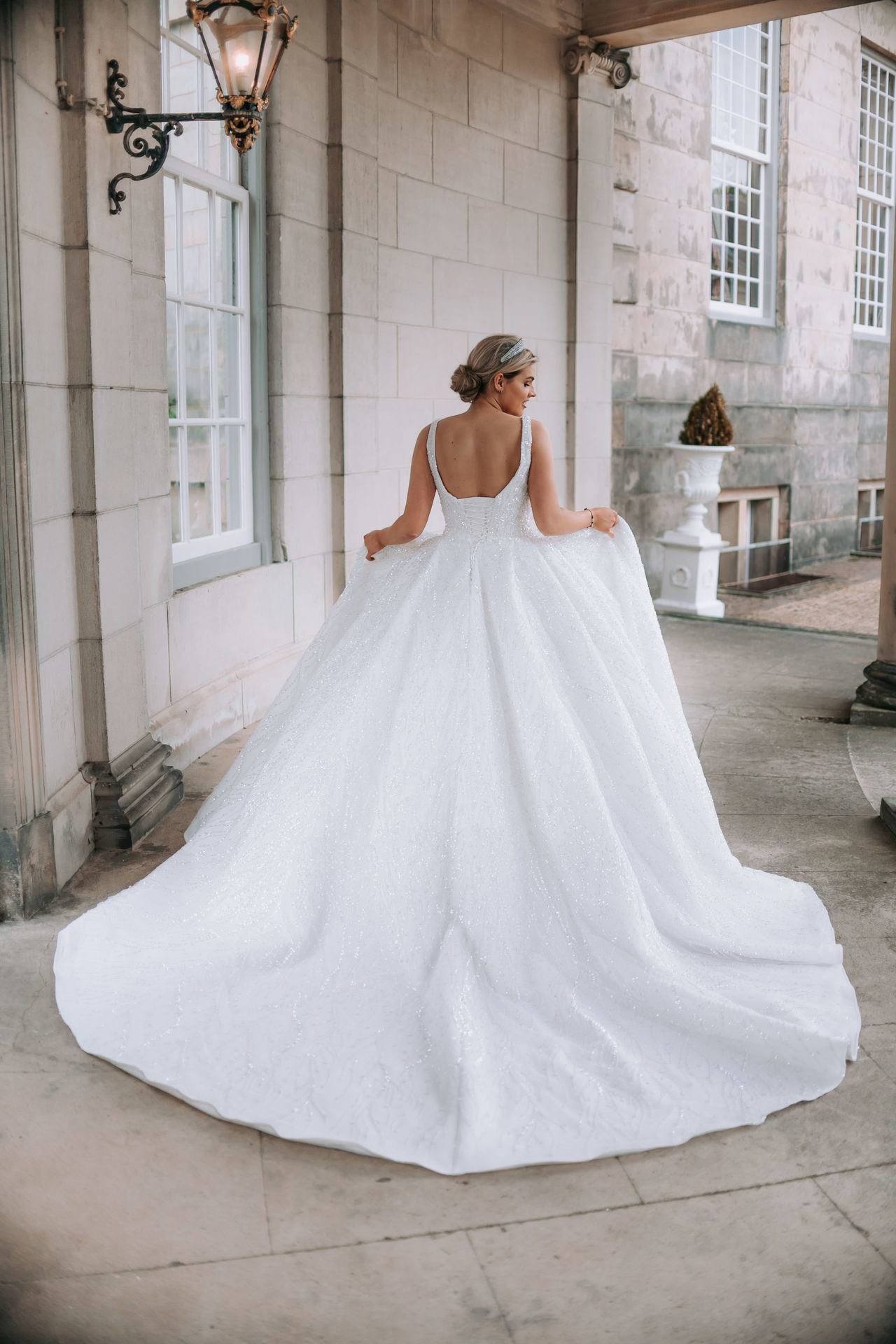 Trouwjurk Kristel is een prinses jurk met een prachtige bewerkte steentjes stof. De trouwjurk is gemaakt van de mooie stof satijn met een vol bewerkte steentjes stof. De achterkant van deze trouwjurk is gemaakt van een mooie corset sluiting. De sleep toch langer maken? Dat kan, de trouwjurk wordt geheel naar wens en op maat gemaakt.
