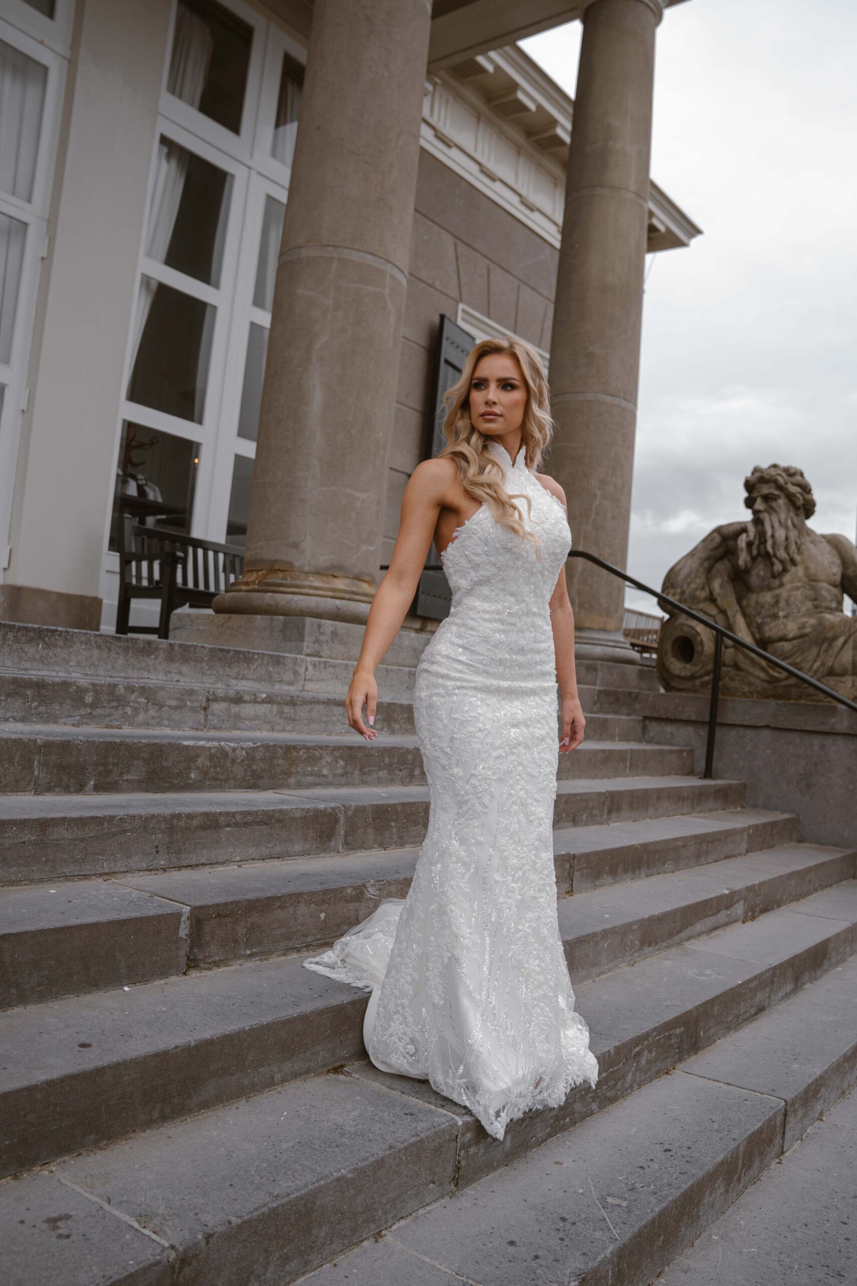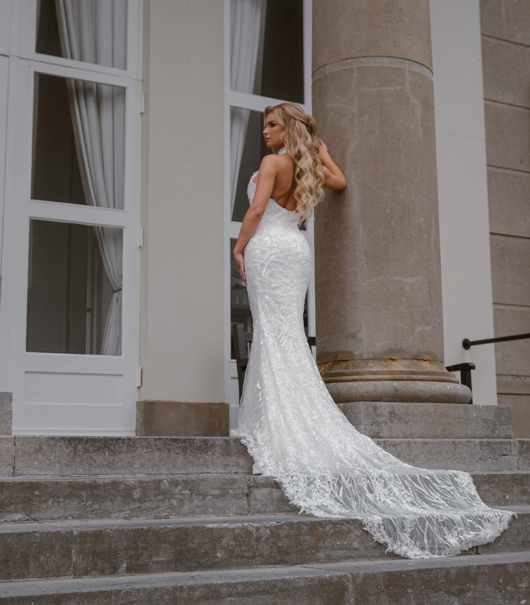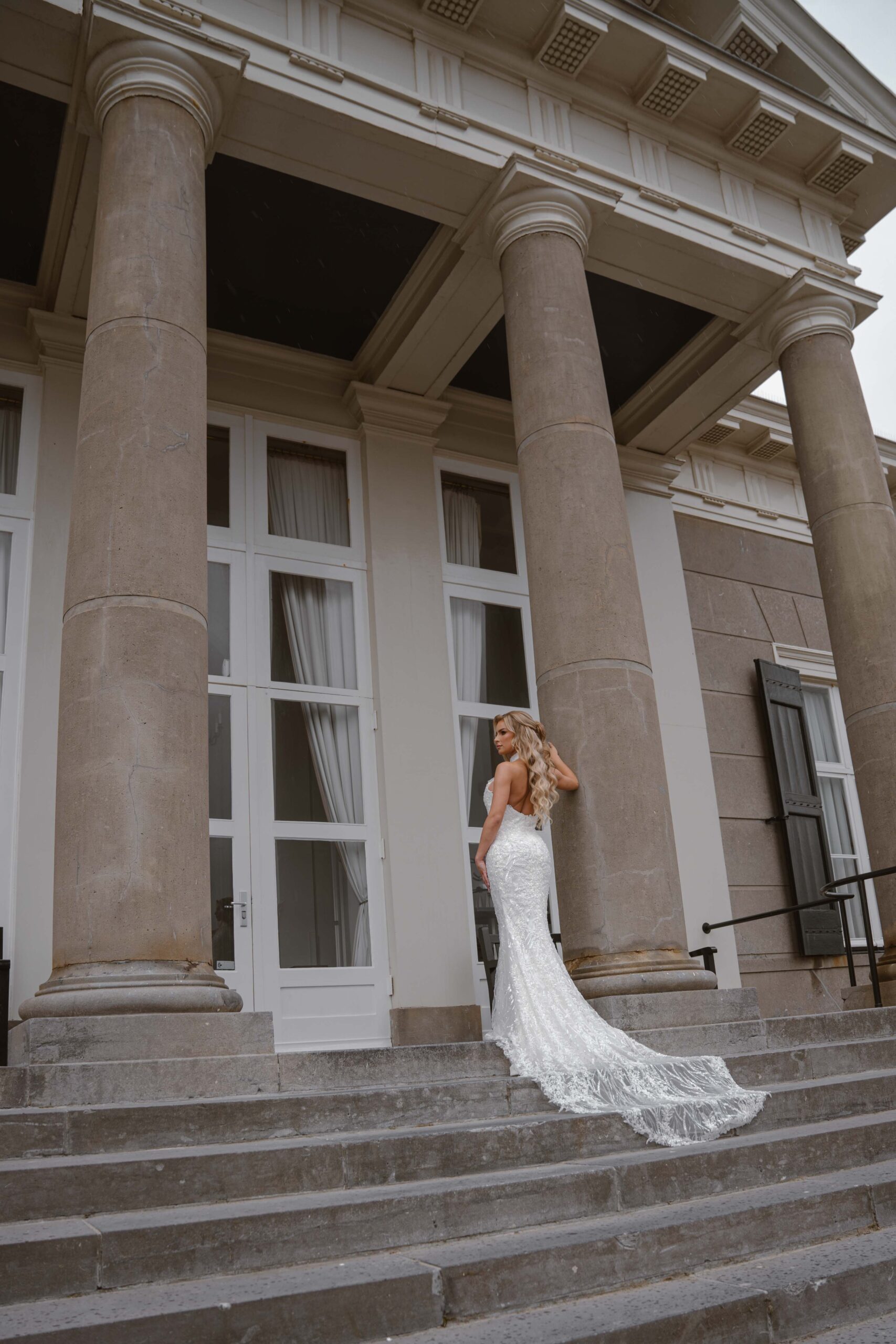 Trouwjurk Linde heeft een speciale neklijn, namelijk een korte kraag. Een mooi lage rug gecombineerd met een transparante sleep. Kom deze prachtige trouwjurk bewonderen in onze bruidswinkel te Zeist!