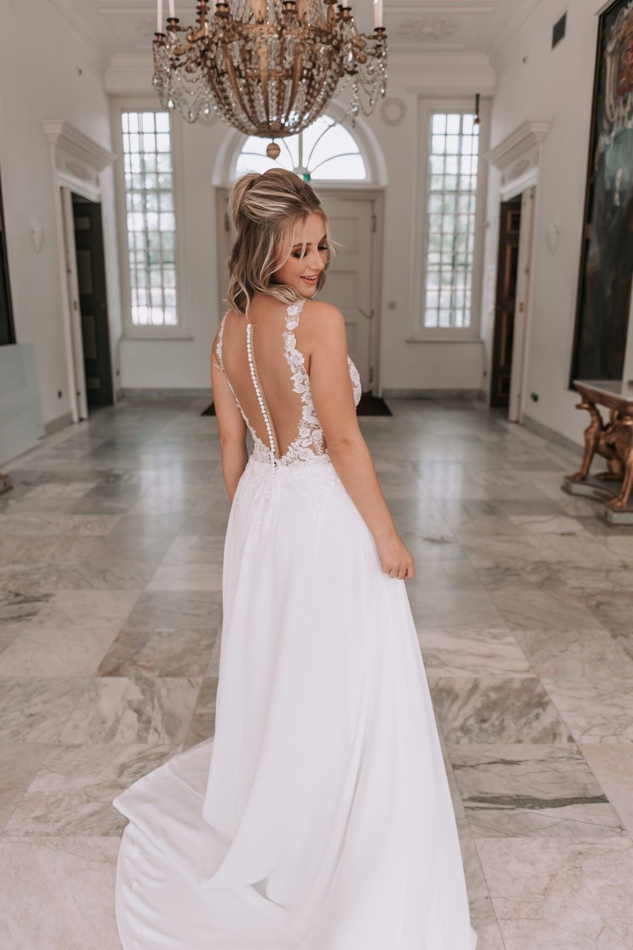 Trouwjurk Lotte is een A-lijn chiffon jurk met een mooie split. De trouwjurk is gemaakt van een transparant body die volledig bewerkt is met bloemen applicaties en transparante steentjes. De rok is gemaakt van mooie zachte chiffon stof en de lage/open rug is bewerkt met knoopjes. De trouwjurken worden volledig naar wens en op maat gemaakt.