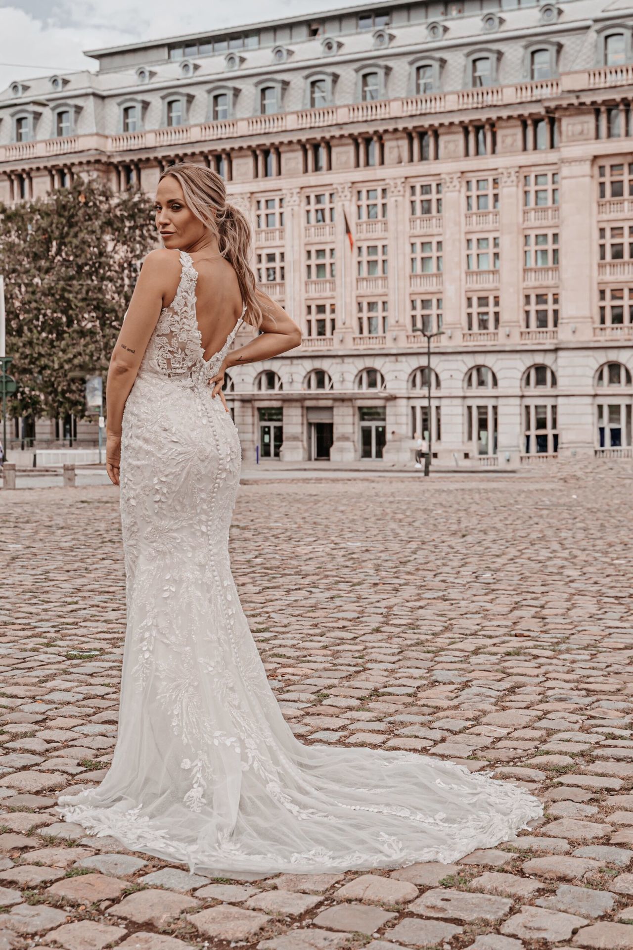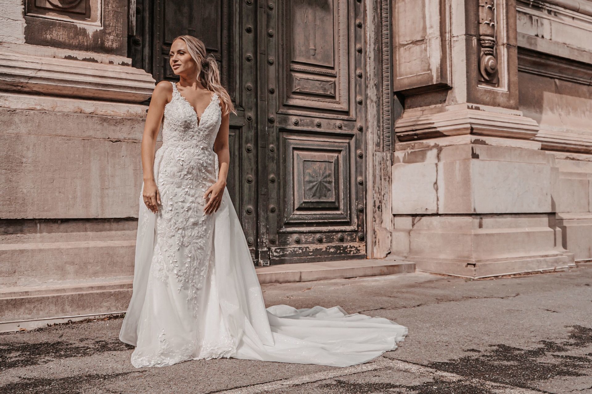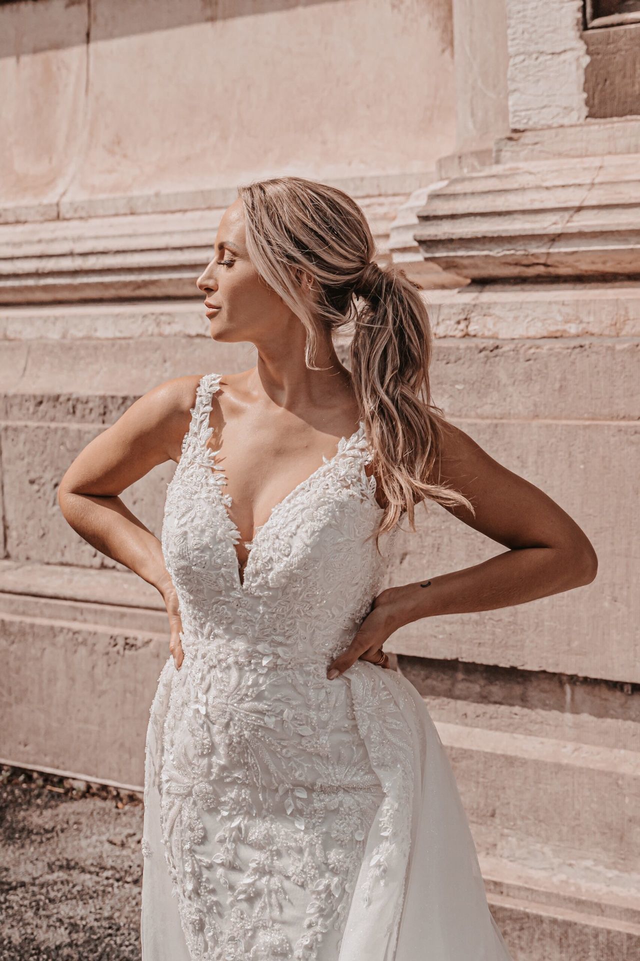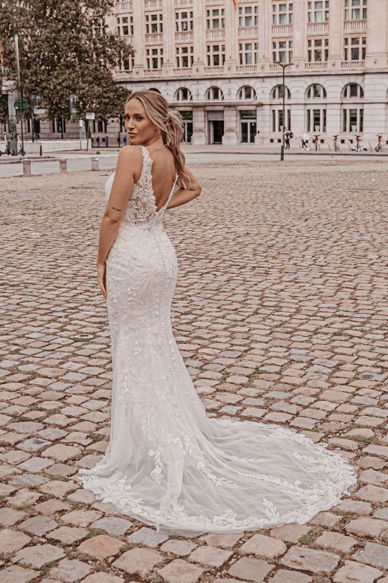 Op zoek naar een prachtig bijzonder trouwjurk waarmee je overdag tijdens de ceremonie indruk kan maken met een grote rok, maar in de avond toch nog comfortabel kunt dansen? Dan is Trouwjurk Lucy voor jou gemaakt! Dit is een mooi stretch zeemeermin model volledig bewerkt met kantapplicaties en steentjes, met daarnaast een afklikbare rok gemaakt van een kanten riempje en glitter Tulle. Ideaal!