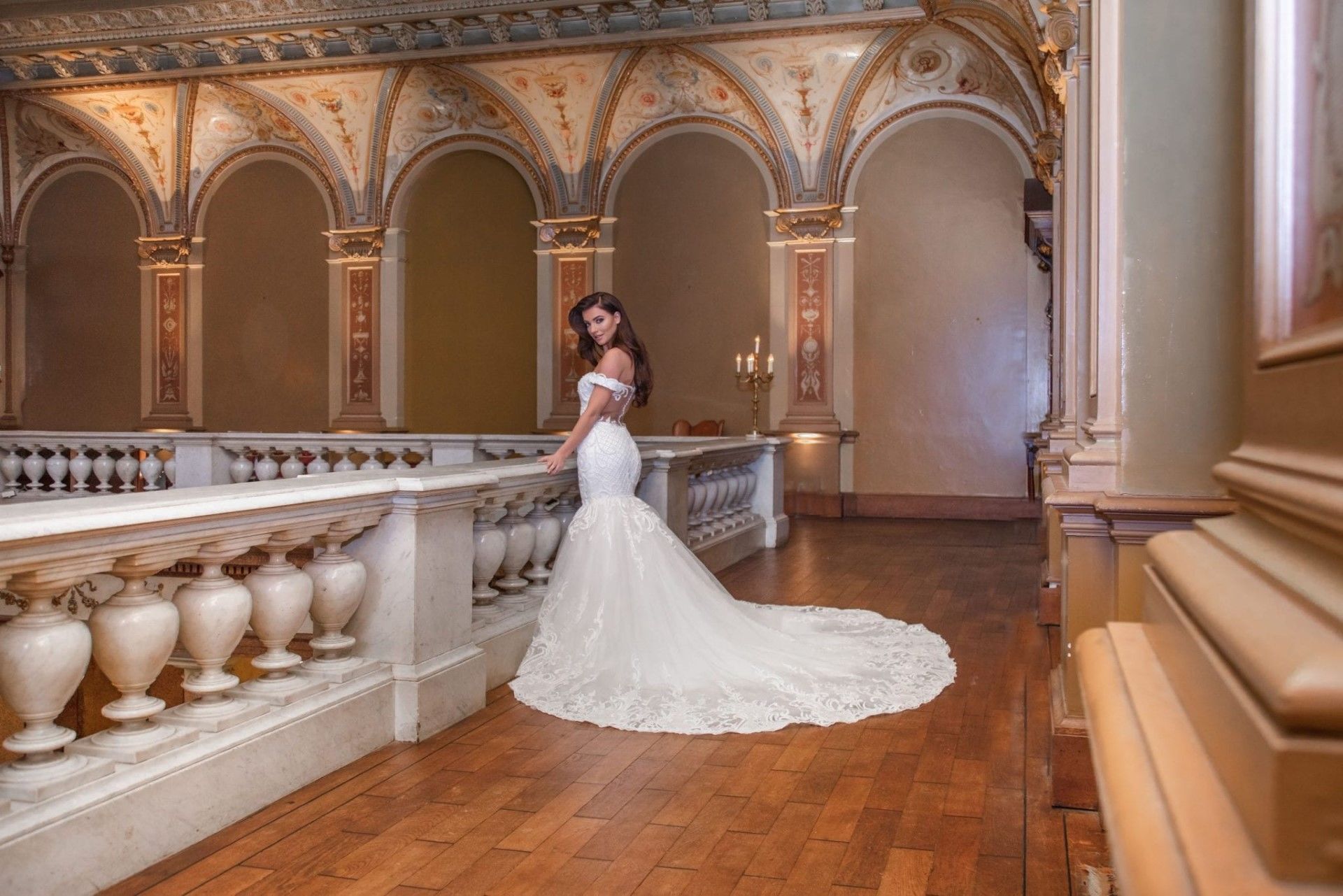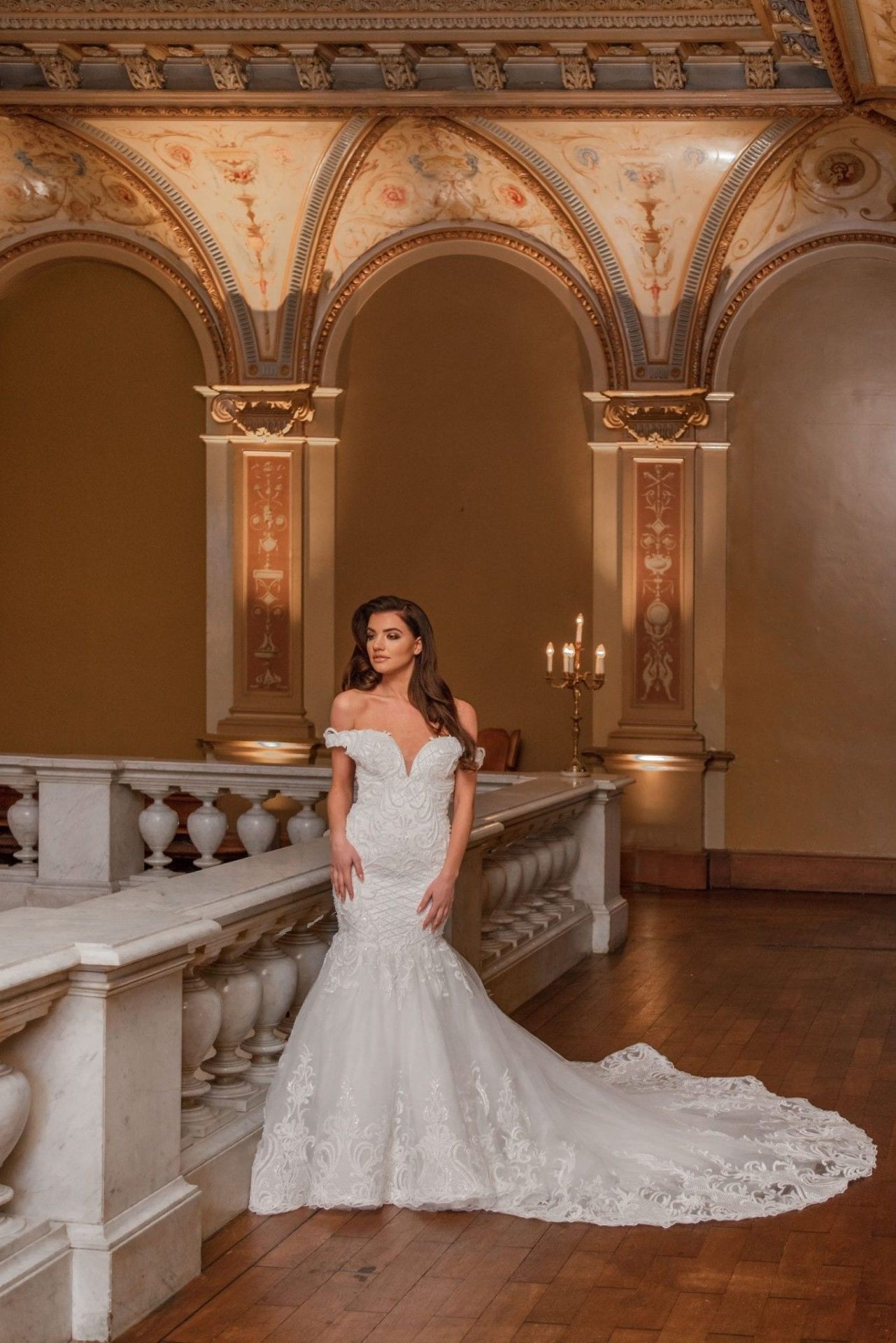 Zeemeermin trouwjurk Mandy is een unieke design die volledig hand bewerkt is, de body en de rok bevat mooie dikke kantbewerkingen die vol bewerkt zijn met de hand. De bewerkingen bevatten parels, kraaltjes en steentjes. De jurk heeft een mooie decolleté, off-shoulder bandjes, lage rug en een prachtige lange sleep met kantrand. Dit is een echte “Say yes to the dress” bruidsjurk! Dus kom langs in onze winkel en beleef het gevoel!