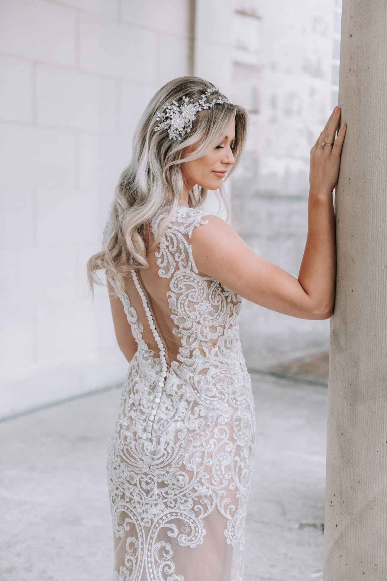 Trouwjurk dat geheel transparant is gemaakt, maar toch op de juiste plekken mooi afgewerkt met prachtige bewerkte kant. Kenmerk van deze prachtige trouwjurk is de vol bewerkte kantstof en uiteraard dat het mooi transparant is gemaakt. De sluiting van de rug is gemaakt van kleine knoopjes satijn.