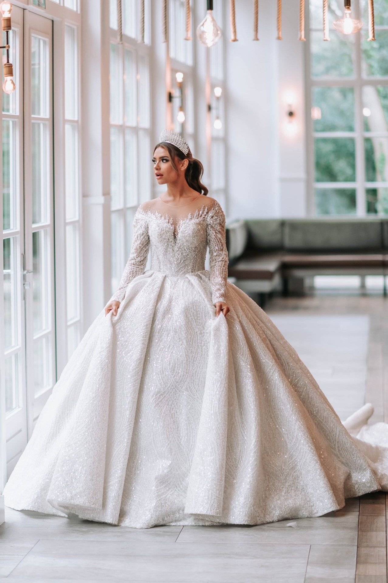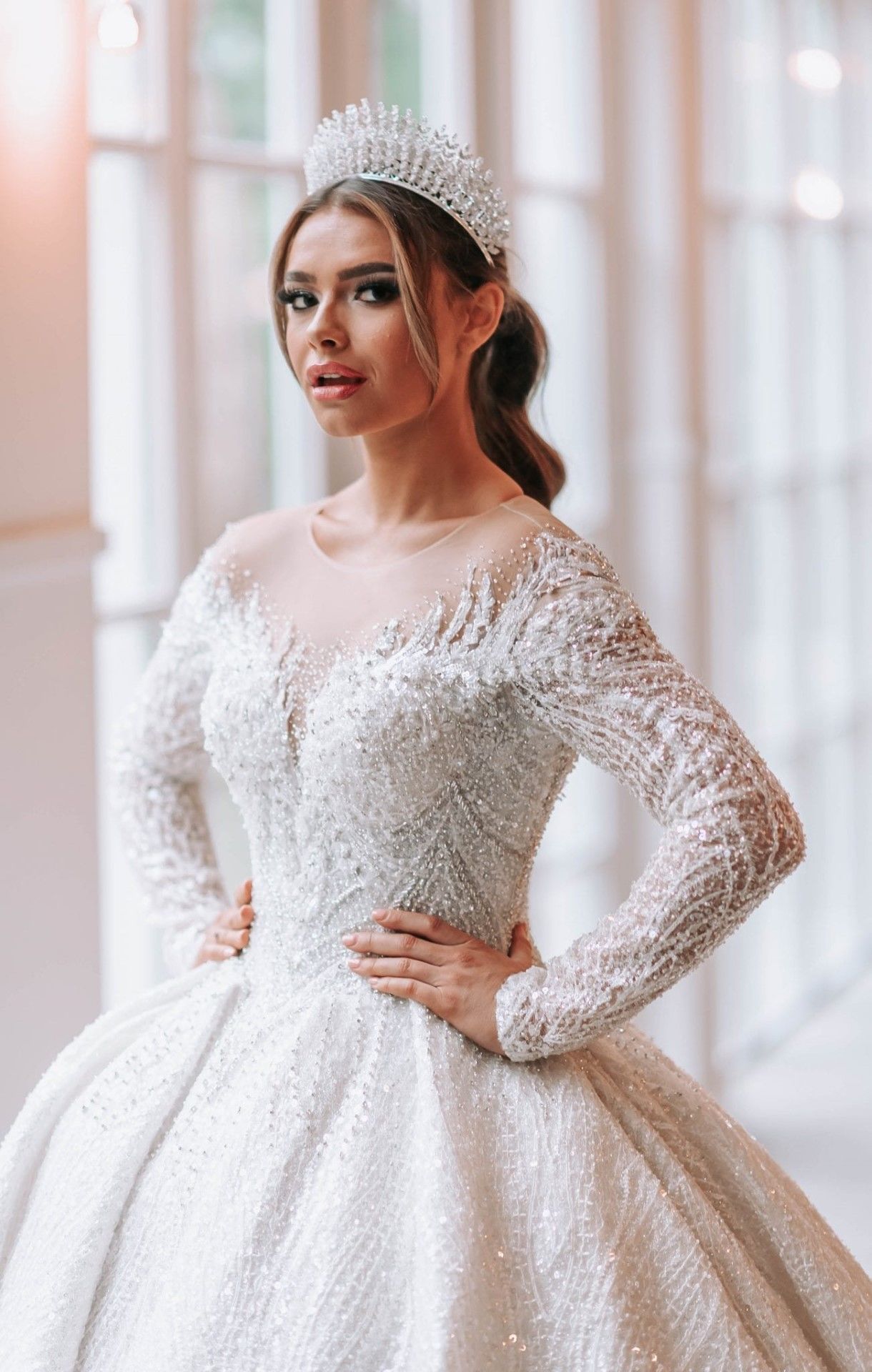 Trouwjurk Mary straalt uit met alle glitter & glamour als een ware droomjurk! Volledig bewerkt met lange mouwen, lange sleep en een mooie off-shoulders lijn met decolleté. Een echte prinses trouwjurk!