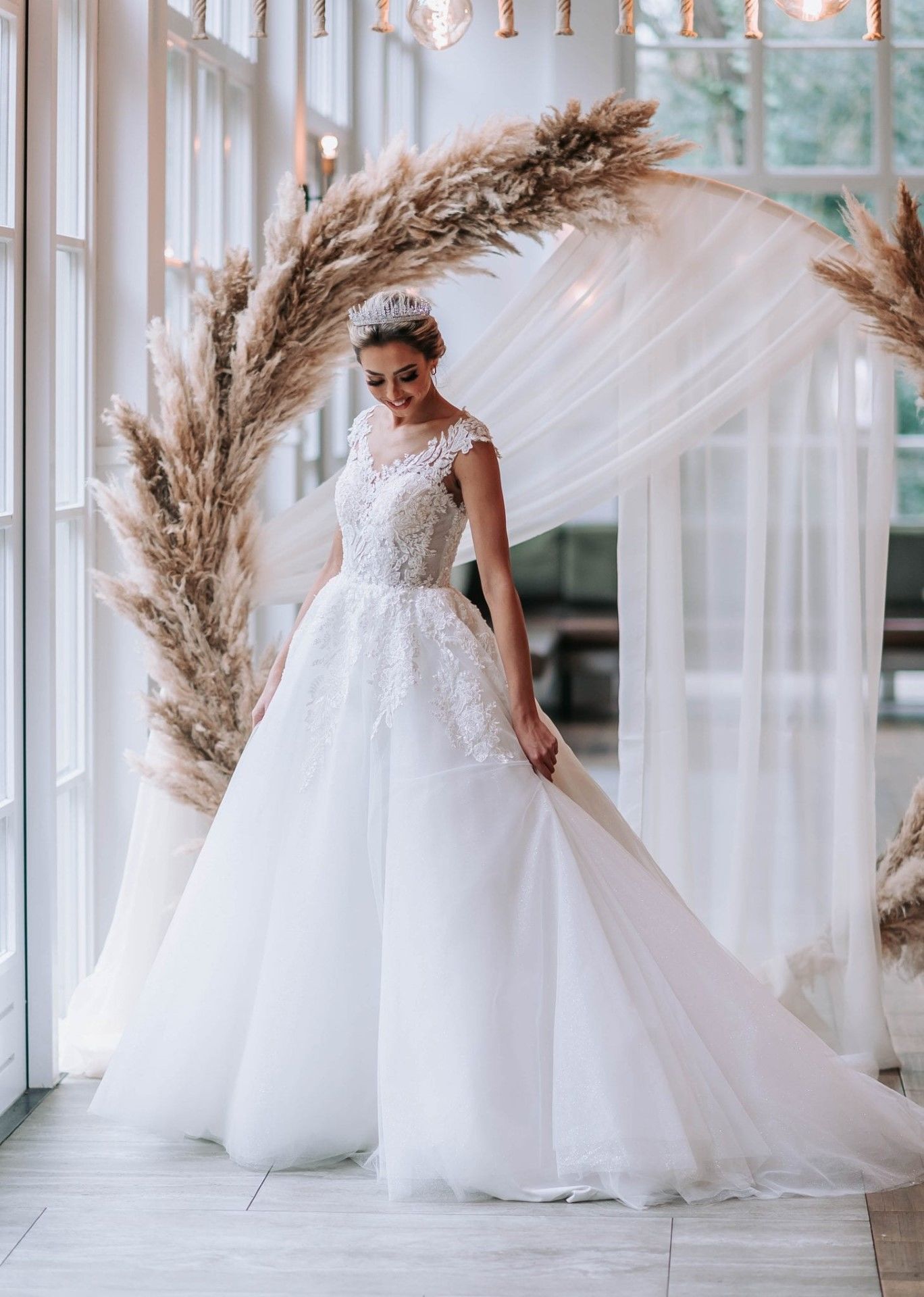 Trouwjurk Moniek is een A-lijn jurk met een mooie neklijn waarvan het kant overloopt van de schouders naar de open rug/lage rug in een mooie hartvorm effect. De rok is gemaakt van mooi vallend zachte tule met meerdere lagen waardoor het een extra volume geeft. Tevens heeft de rok een extra glitter laag, waardoor het net iets meer geeft dan alleen tule. Alle bruidsjurken worden naar wens en op maat gemaakt.