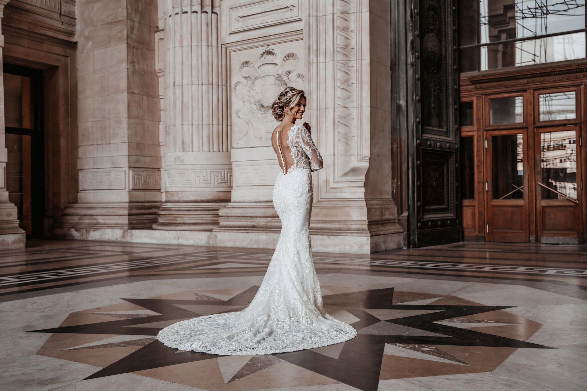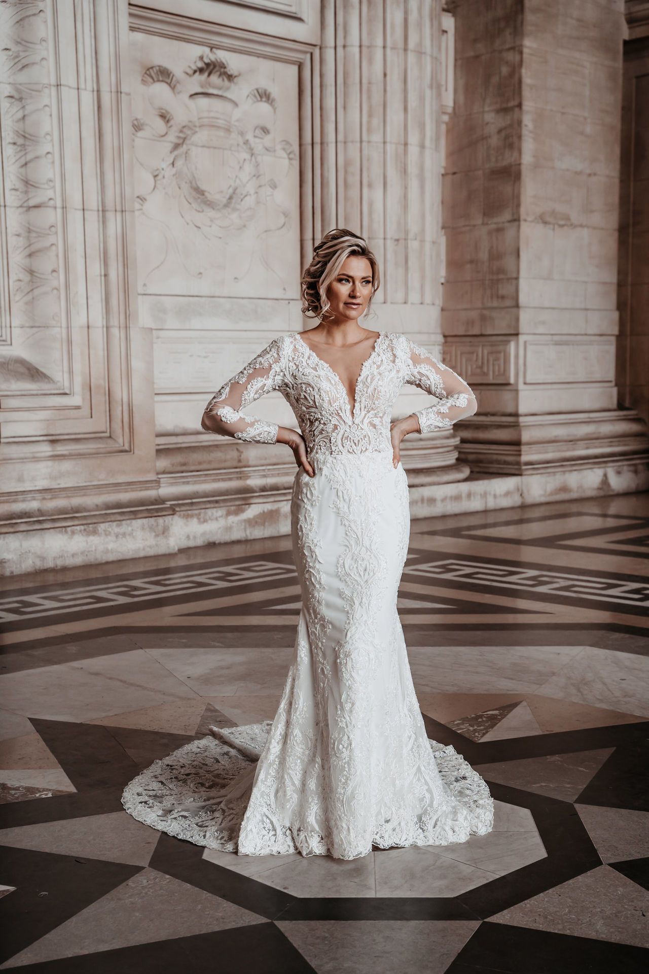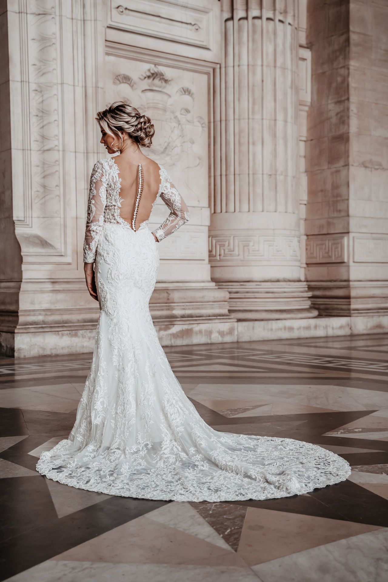 Trouwjurk Naomi is gemaakt van een prachtige kantapplicatie die bewerkt is met transparante steentjes. De trouwjurk heeft mooie bewerkte lange mouwen, een lage rug met knoopjes.