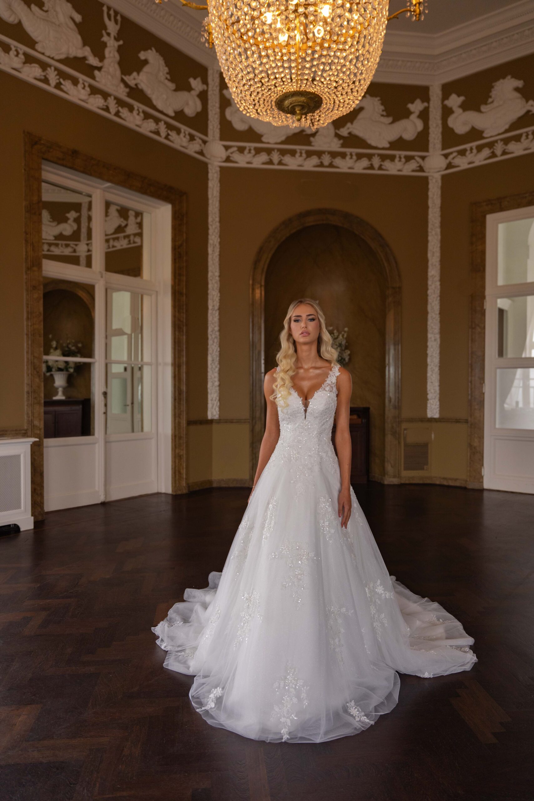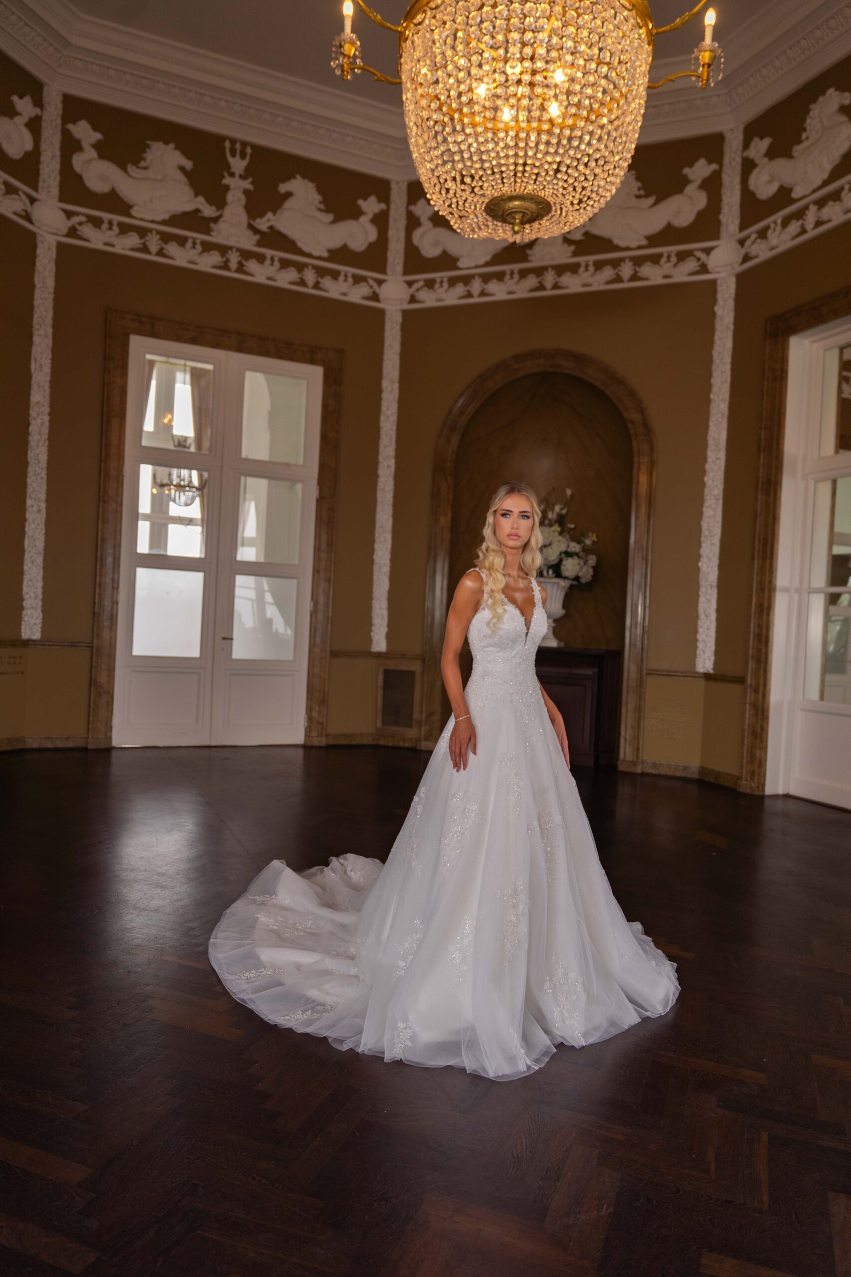 Trouwjurk Novi is een klassiek A lijn trouwjurk met prachtige V neklijn. De top is mooi bewerkt met kantapplicatie dat mooi overloopt naar de tule rok. De trouwjurk wordt volledig naar wens en speciaal op maat gemaakt.