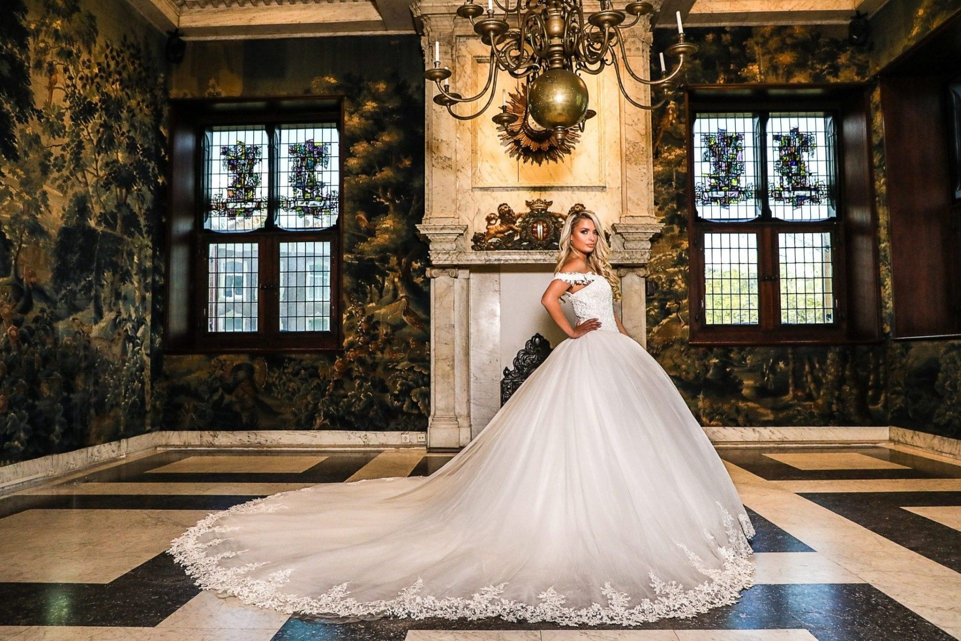 Trouwjurk Samira steelt de show met de prachtige extra lange sleep! Deze trouwjurk heeft een extra lange sleep die bewerkt is met mooie kant applicaties en steentjes. De body is volledig vol bewerkt met kant applicaties en steentjes en finishing touch van deze trouwjurk zijn de afklikbare off-shoulder bandjes. De bruidsjurken worden geheel naar wens en op maat gemaakt.
