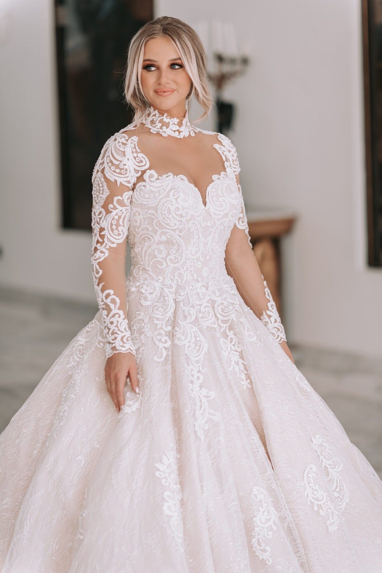 Trouwjurk Sanna is een echte royal prinses jurk gemaakt van mooie kant applicaties die volledig bewerkt zijn met transparante steentjes. De trouwjurk is gemaakt met een combinatie beige stof waardoor de licht ivoor kant applicaties mooi naar voren komen. De trouwjurk heeft een sleeplengte van 1,5 meter.