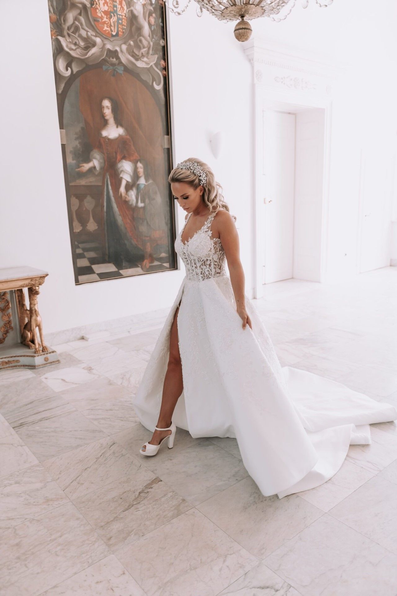 Trouwjurk Sharon is een A-lijn jurk met een mooie split. De trouwjurk is gemaakt van een transparant body die volledig bewerkt is met kant en transparante steentjes. De rok is gemaakt van mooie satijn dat verhard is zodat de plooien mooi blijven staan. Deze trouwjurk A-lijn is een perfect mix van mooi, sexy en elegant.