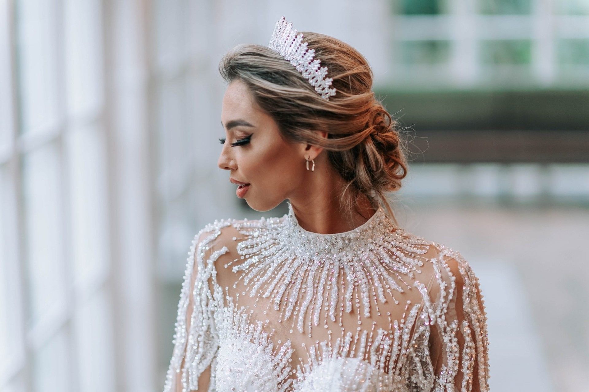 Jurk Victoria straalt uit met alle glitter & glamour als een ware droomjurk! Volledig bewerkt met lange mouwen, lange sleep en een kraag / coll als afwerking bij de neklijn. Een echte prinses trouwjurk!