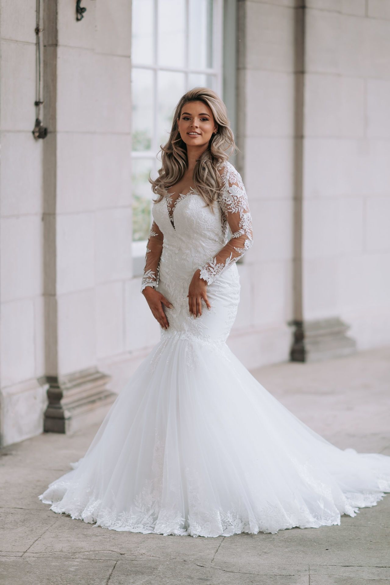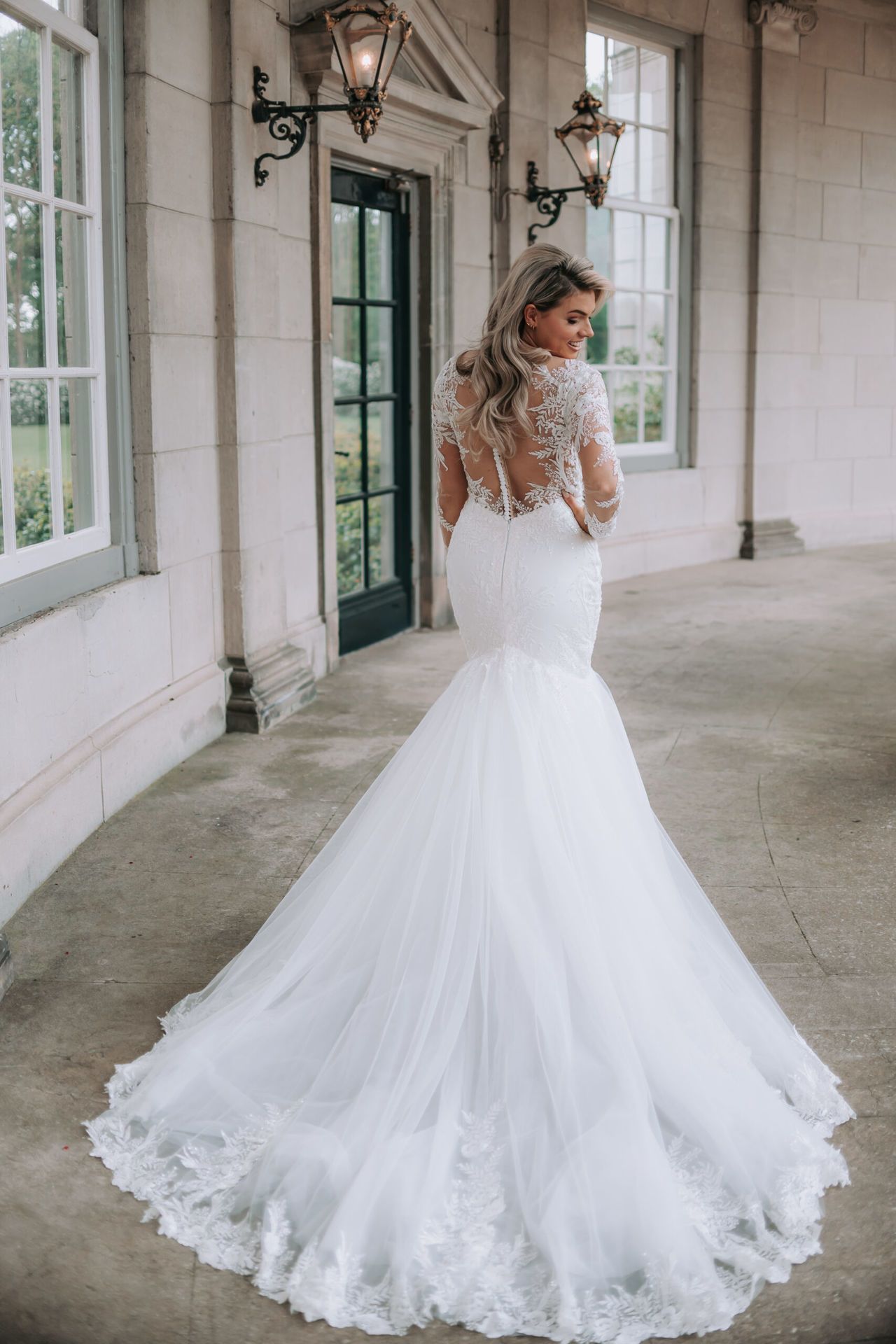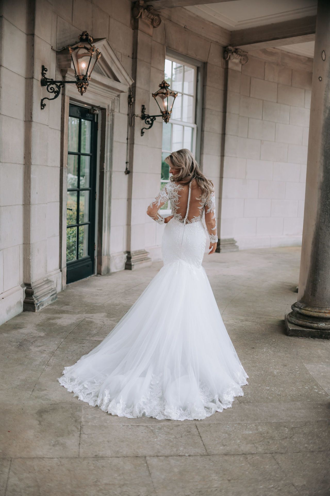 Trouwjurk Elise is gemaakt van mooie stretch stof voering met volledig bewerkte body en een mooie tulle rok met kantbewerkingen. De jurk heeft lange mouwen en een mooi open rug met knoopjes.