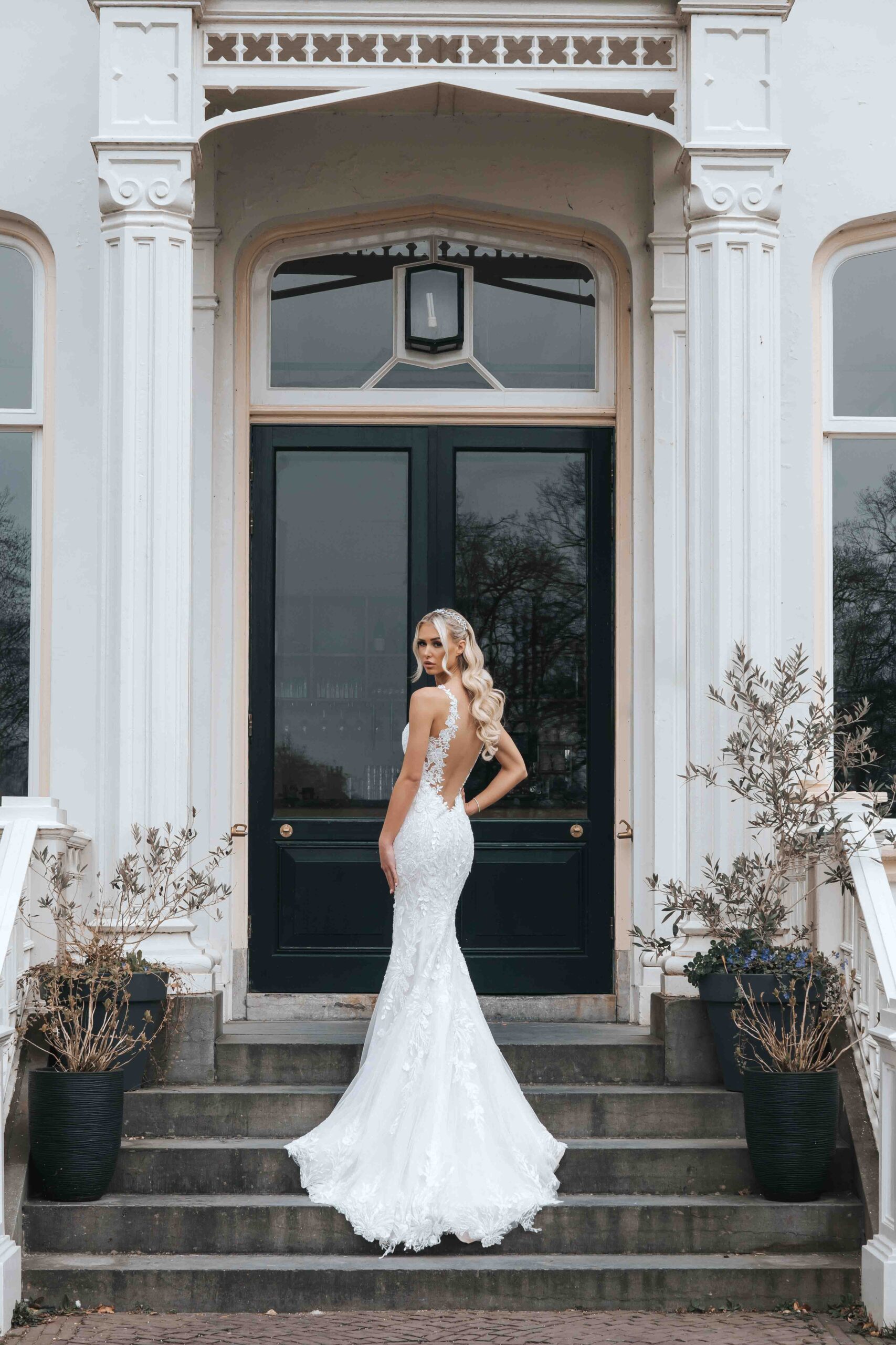Verleidelijk vanaf de eerste blik. Deze fit & flare jurk met een open rug en romantische kanten afwerking omarmt je figuur op precies de juiste plekken. Een jurk voor de confident bride met klasse.