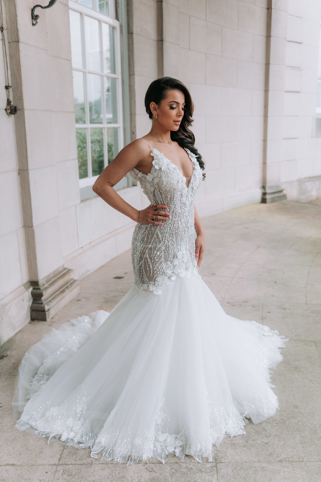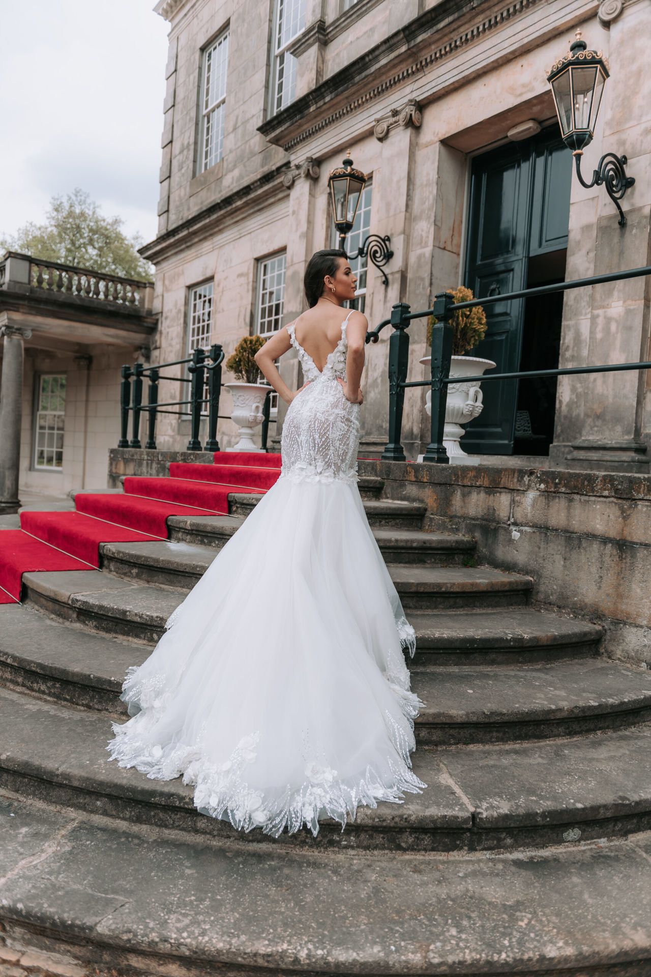 Trouwjurk Michaela is gemaakt van een mooie transparante body die volledig bewerkt is met steentjes. De neklijn voor en achter is gemaakt van mooie 3D bloemen applicatie. Deze trouwjurk wordt volledig naar wens en speciaal op maat gemaakt.