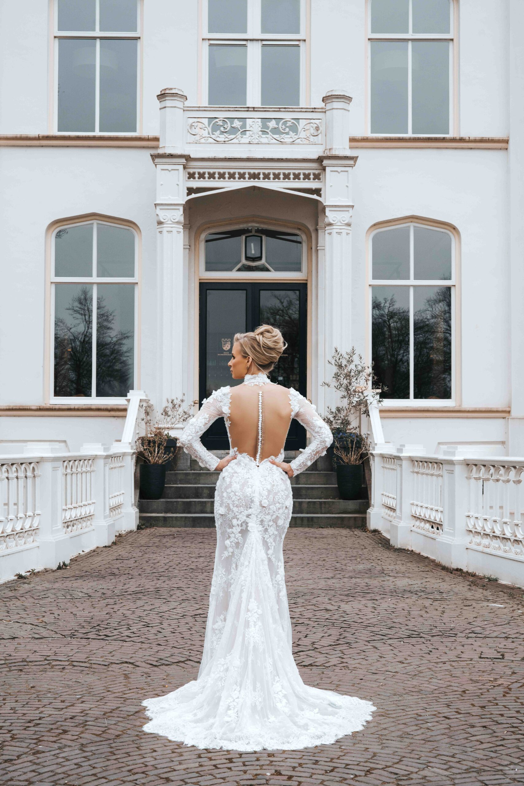 Een statement van verfijning. Deze jurk met lange mouwen en diepe halslijn combineert romantisch kant met krachtige allure. Ideaal voor een bruiloft in de herfst of winter – warm, stijlvol en onvergetelijk.