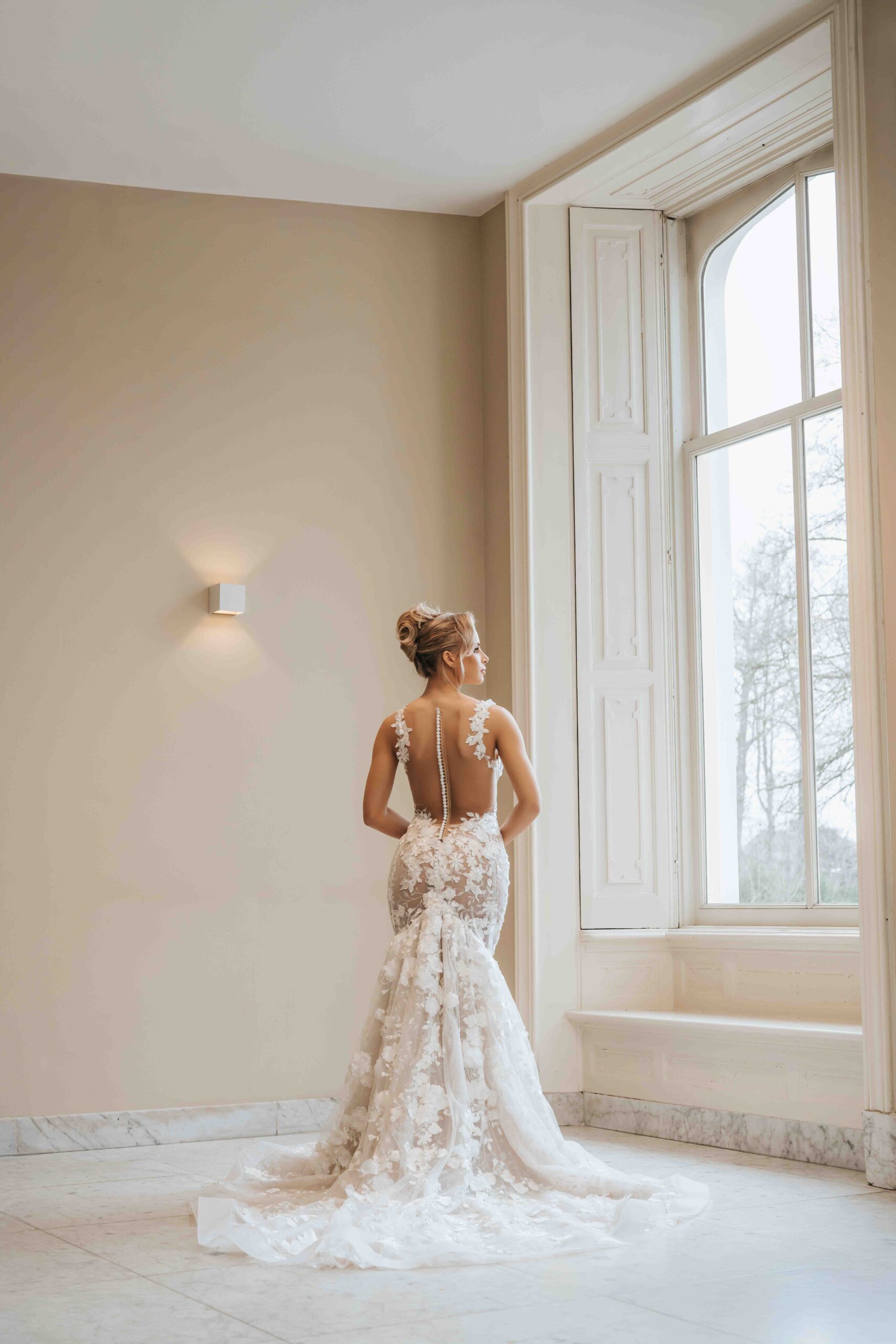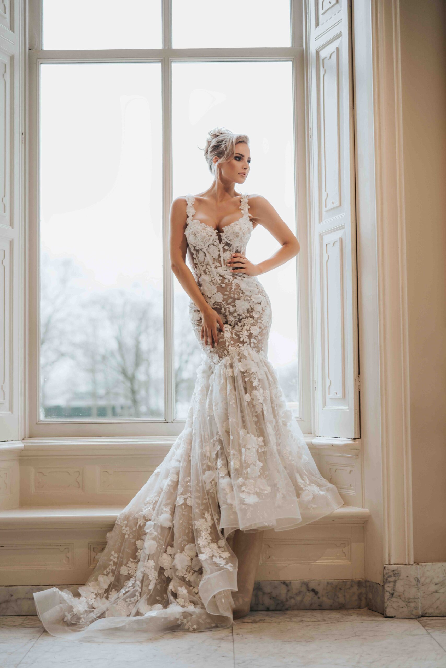 Voor de bruid die durft. Deze mermaidjurk met 3D-bloemen, doorschijnende lagen en een verleidelijke pasvorm laat niets aan de verbeelding over. Chic, sensueel en vol karakter.