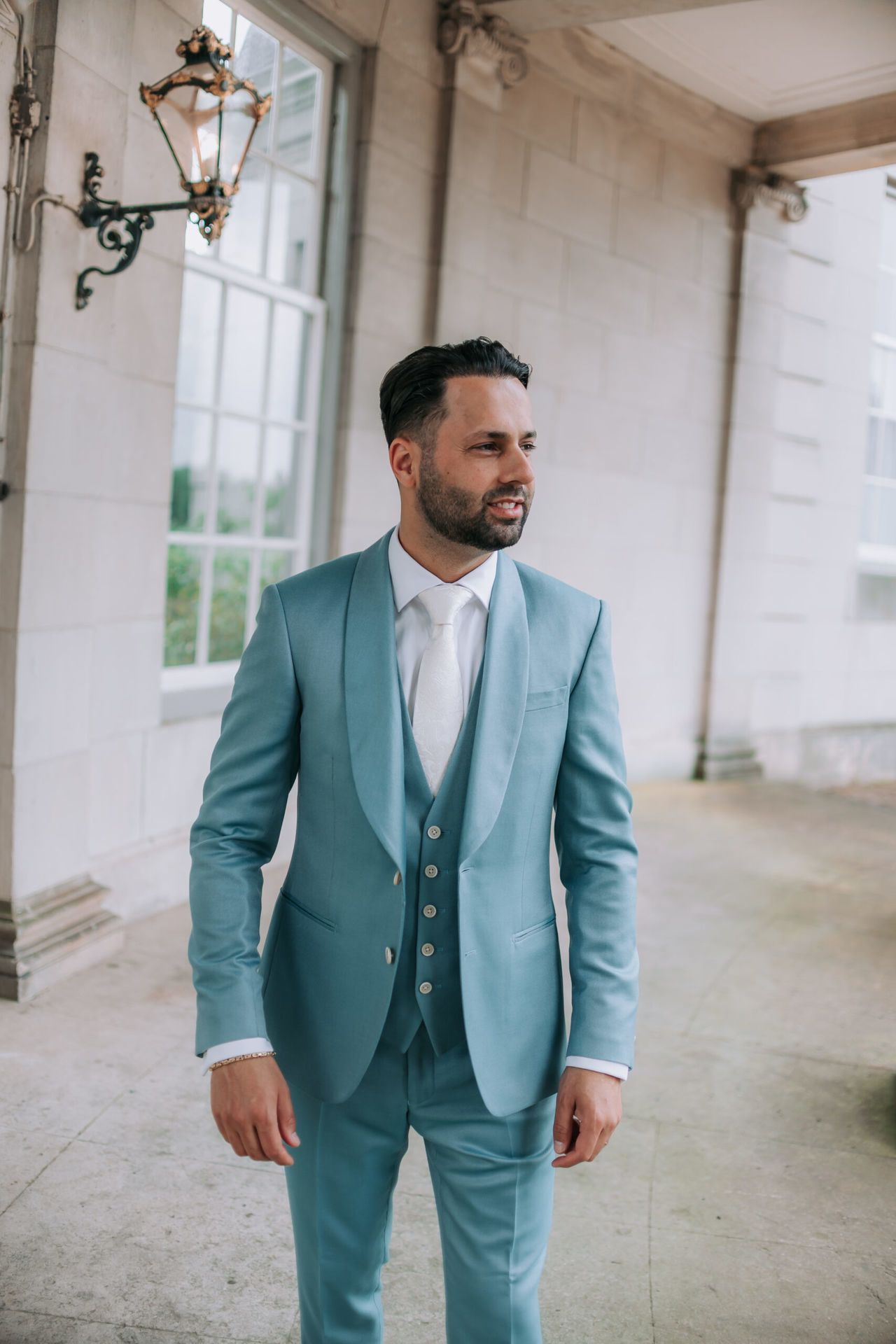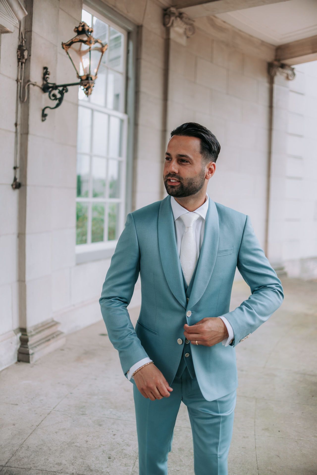 Stof info van dit ice blue trouwpak / maatpak: “Engelse stof van het merk Scabal”