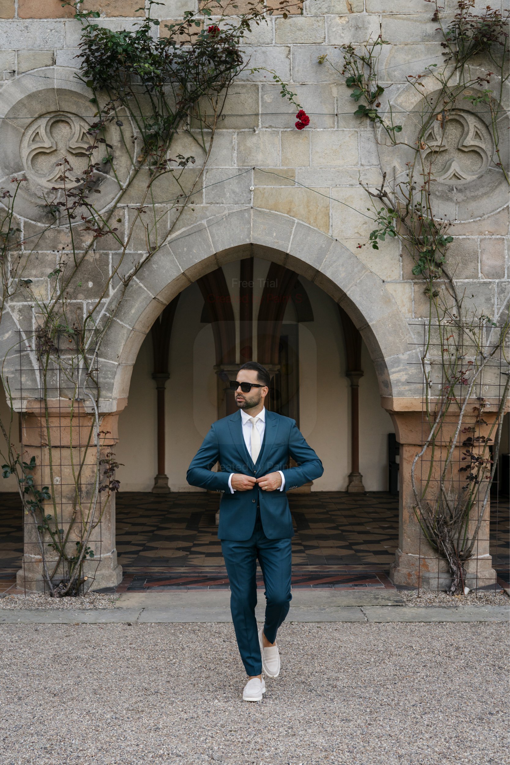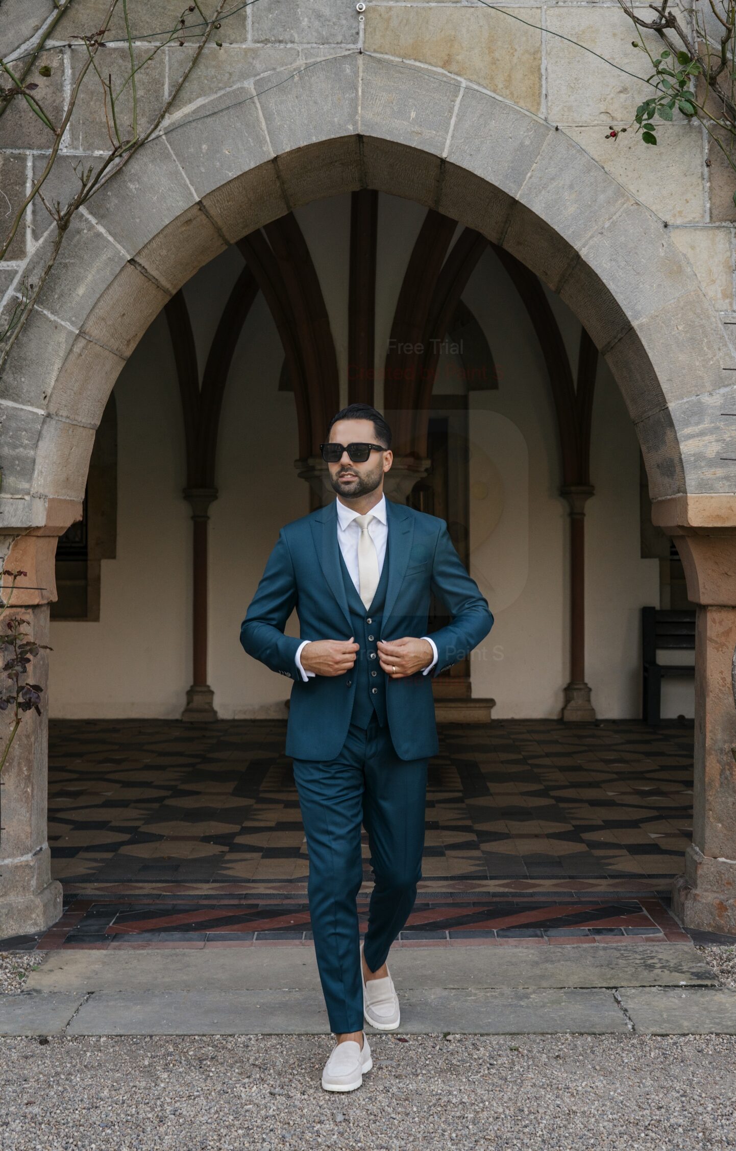 Stof info van dit turquoise blauwe trouwpak / maatpak: “Italiaanse stof van het merk Carnet”