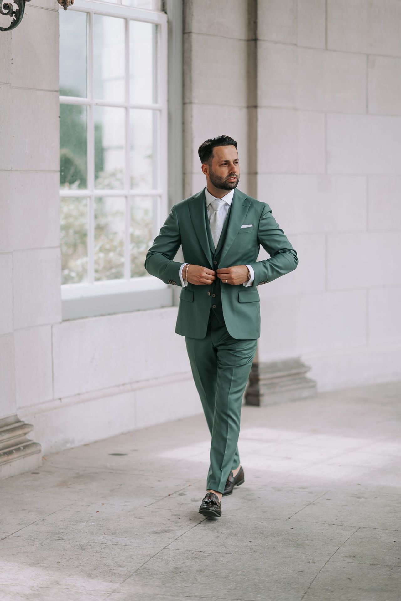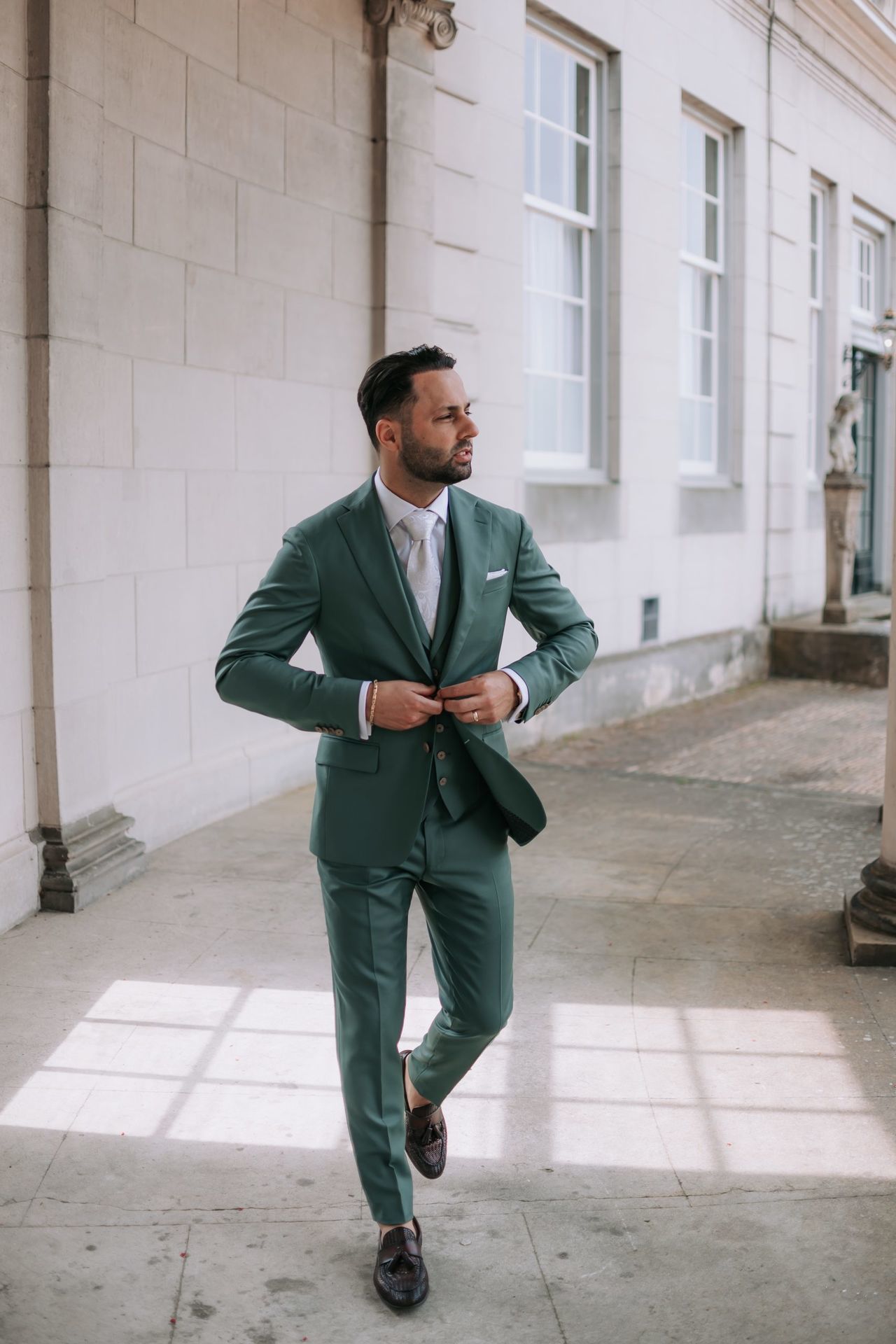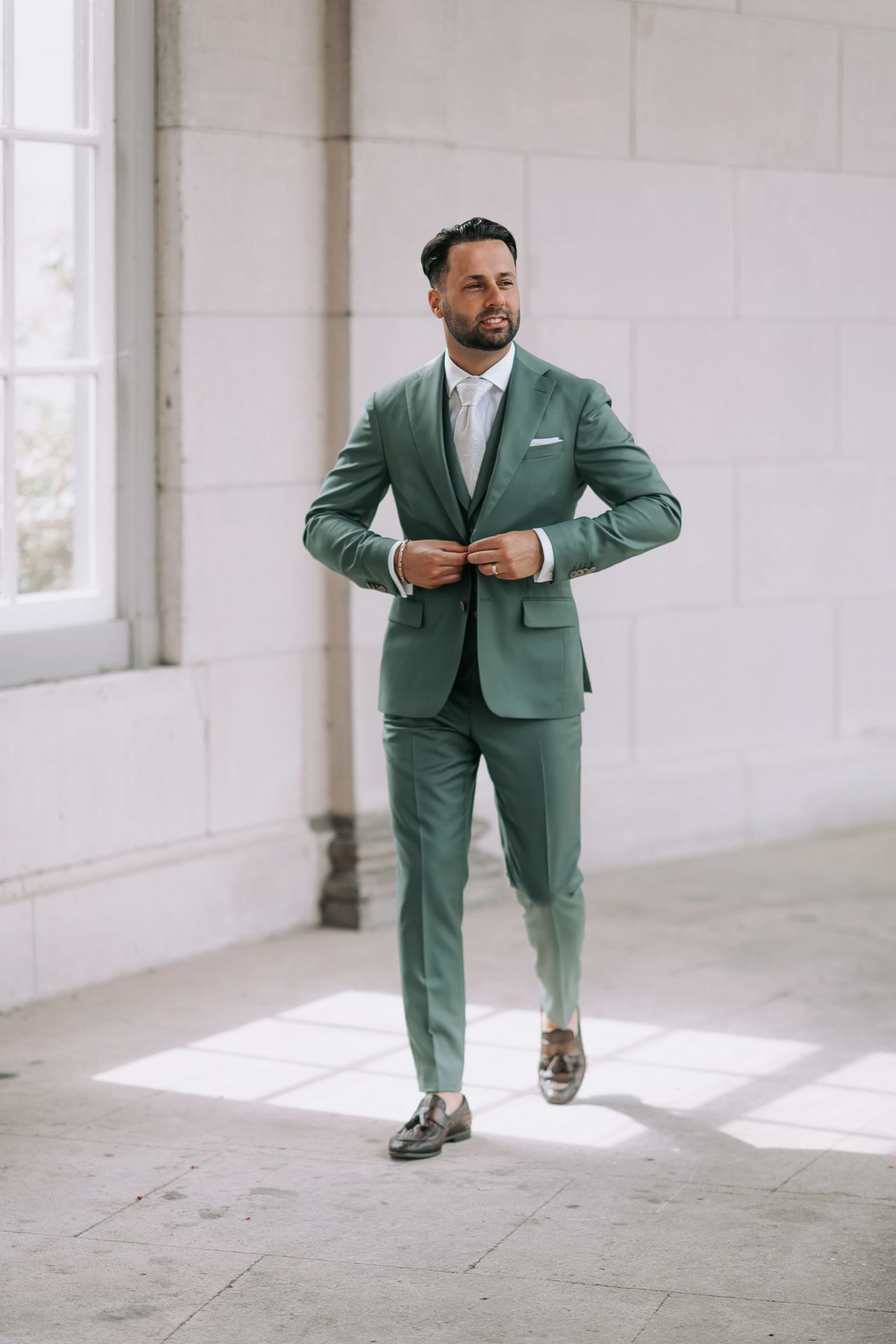 Stof info van dit zacht groene trouwpak / maatpak: “Italiaanse stof van het merk Carnet”